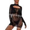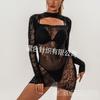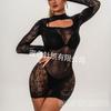 Ropa interior sexy europea y americana para mujer, perspectiva de jacquard sexy, falda de malla con manga larga y cadera hueca negra