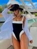 Traje de baño de una pieza europeo y americano transfronterizo 2025 Amazon Bloques de color Sexy Traje de playa Traje de baño para resort y aguas termales para mujer Ajustado