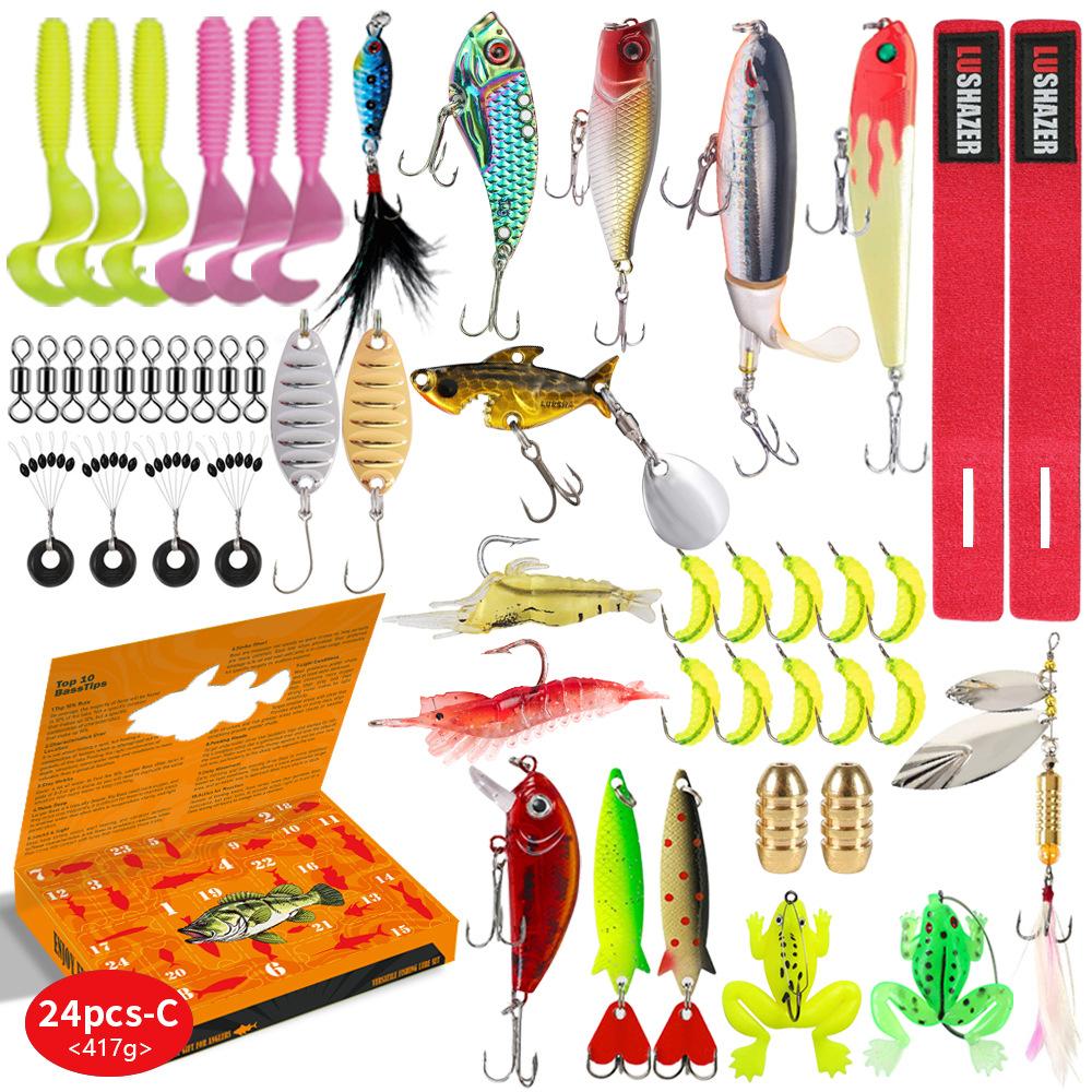 Juego de caja ciega de Amazon 24 piezas de señuelos lentejuelas minnow rana señuelo blando juego vib raya blanca caja de regalo