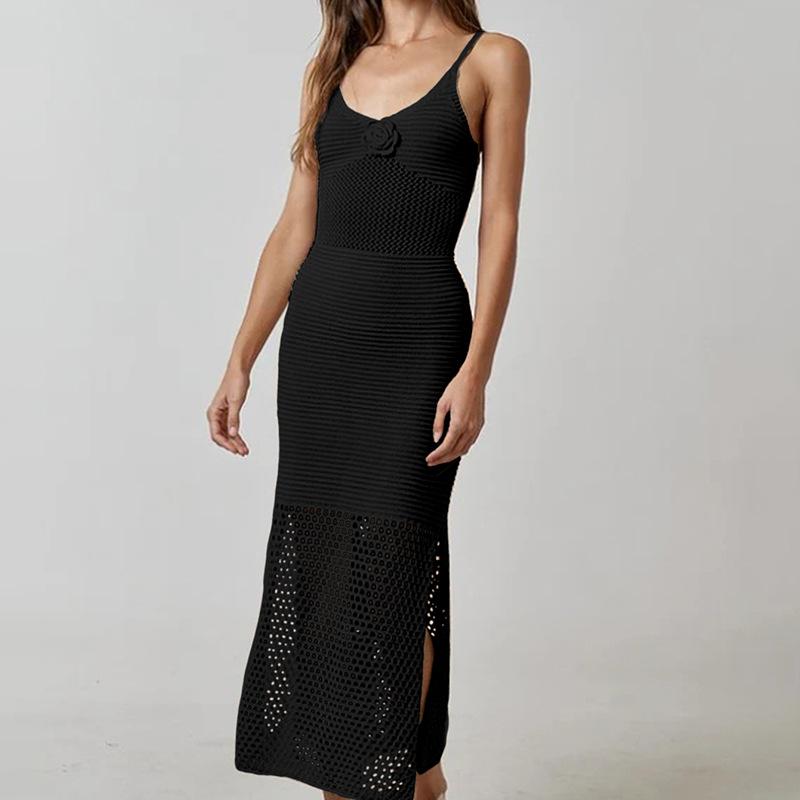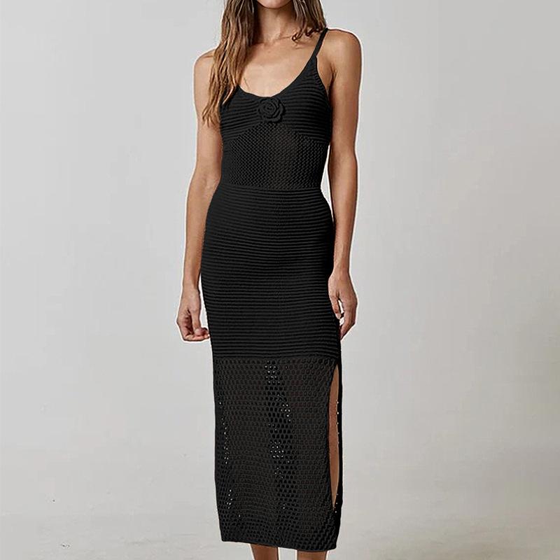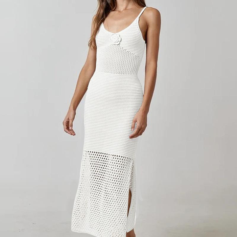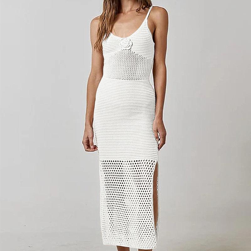 Transfronterizo Nuevo Vacaciones Flor de Crochet Tridimensional Lateral Abertura Alta Tirante Ajustable Hueco Vestido Blusa de Playa Vestido Largo