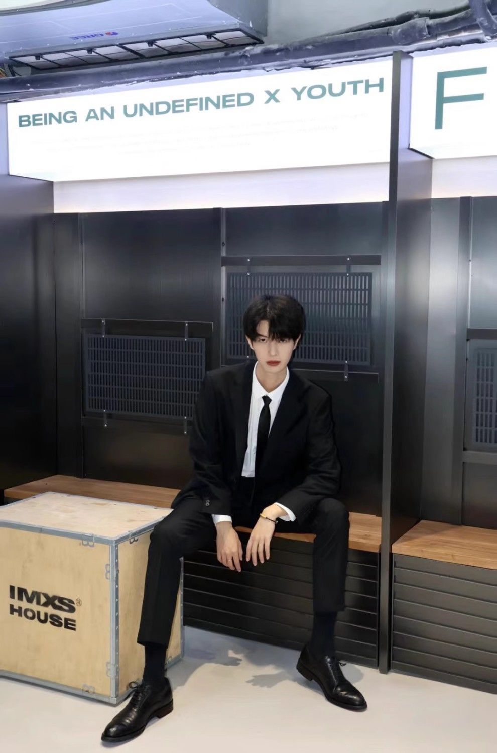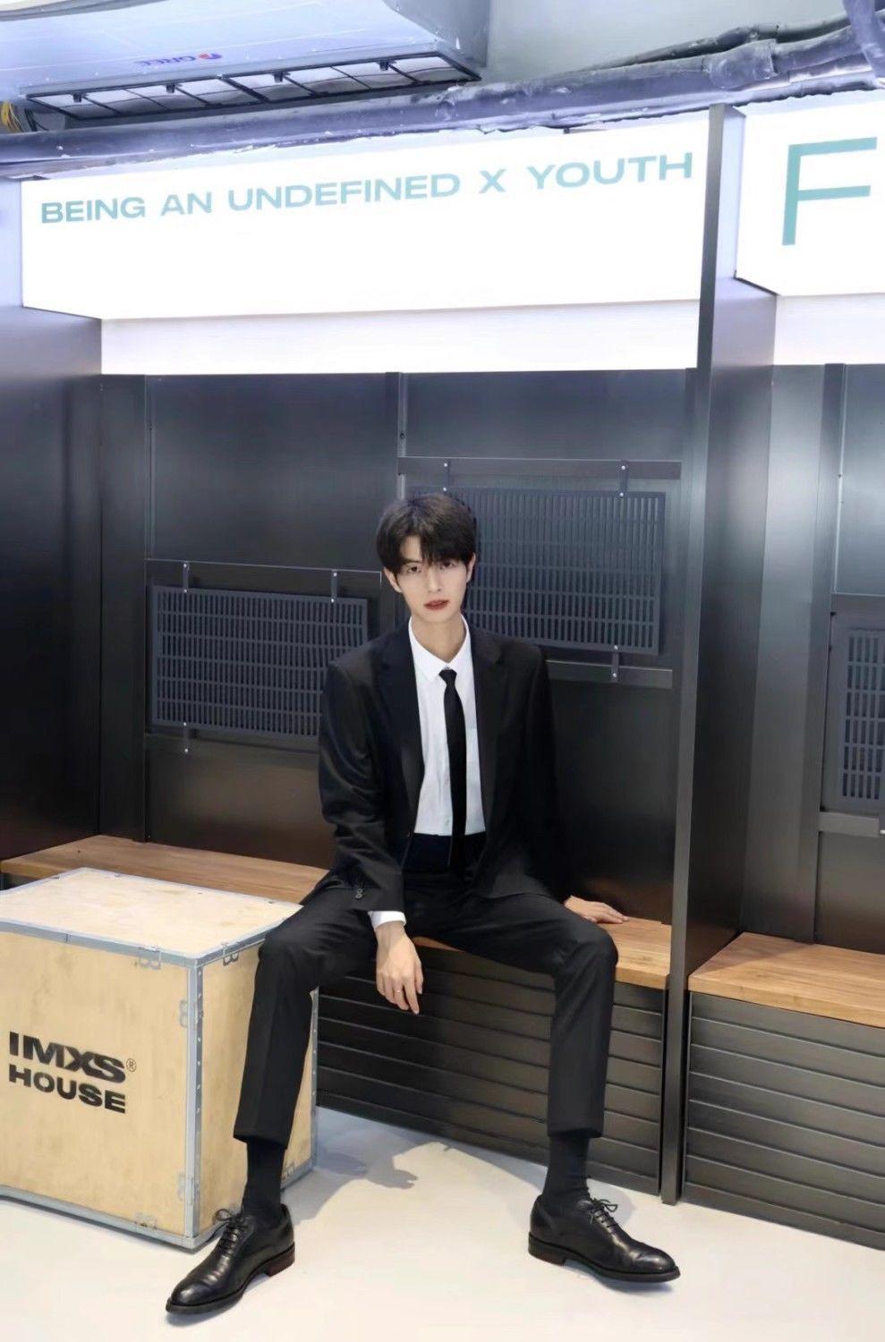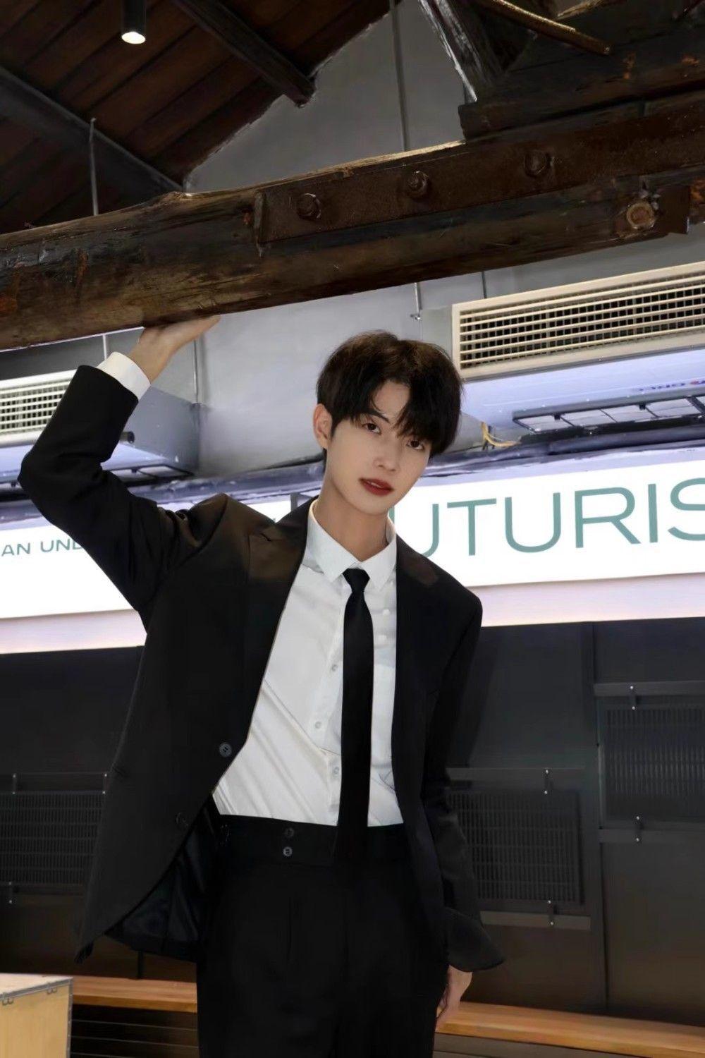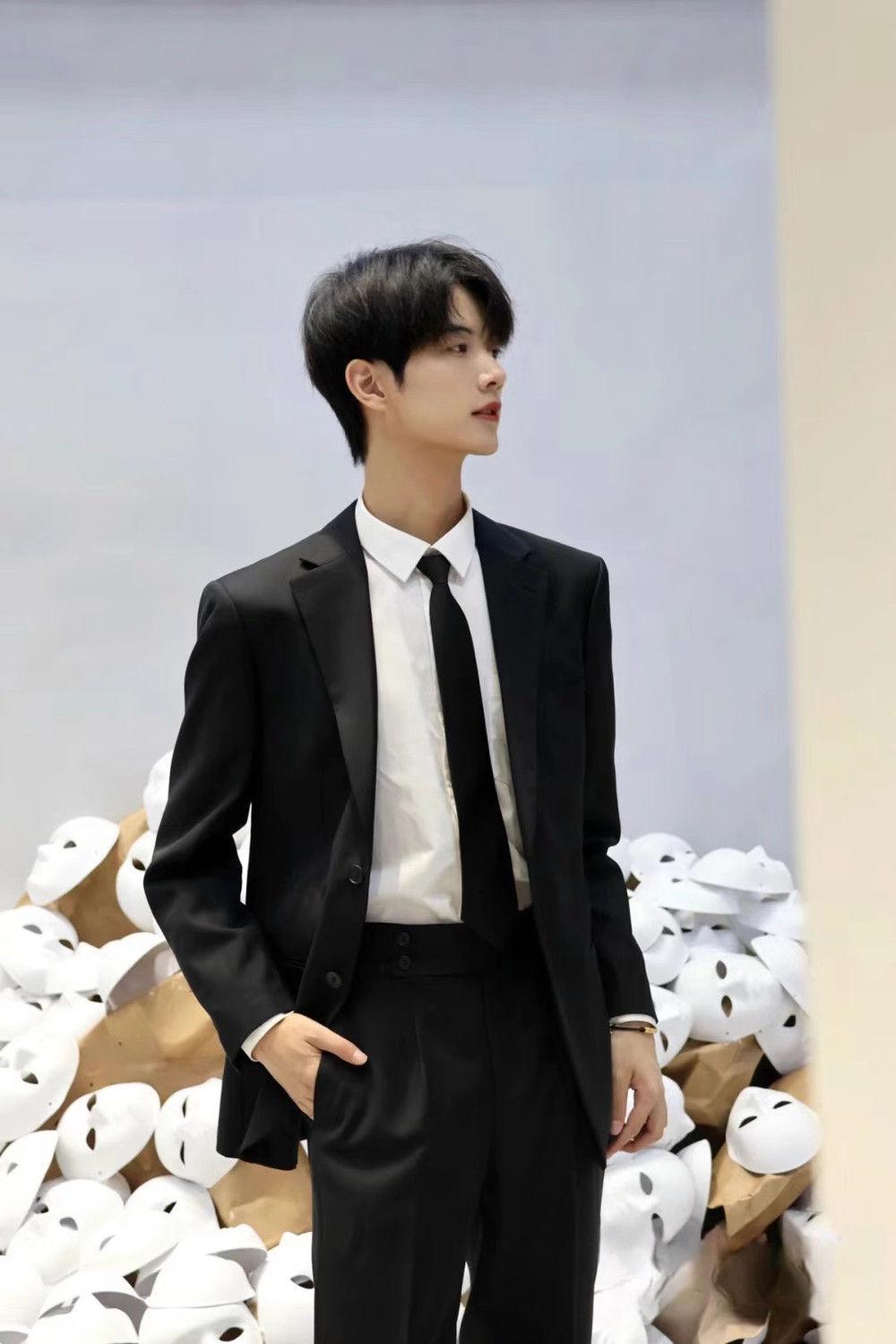 suit white shirt black trousers tie
