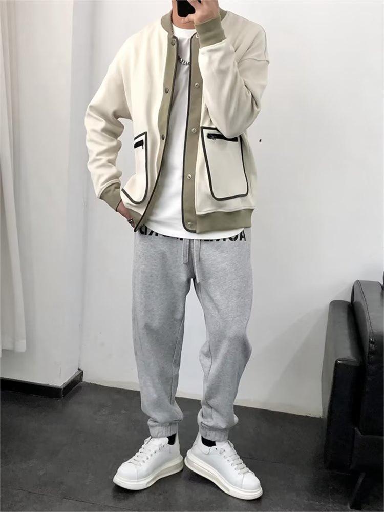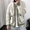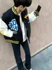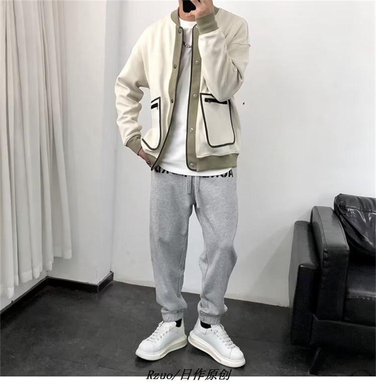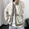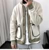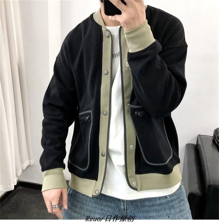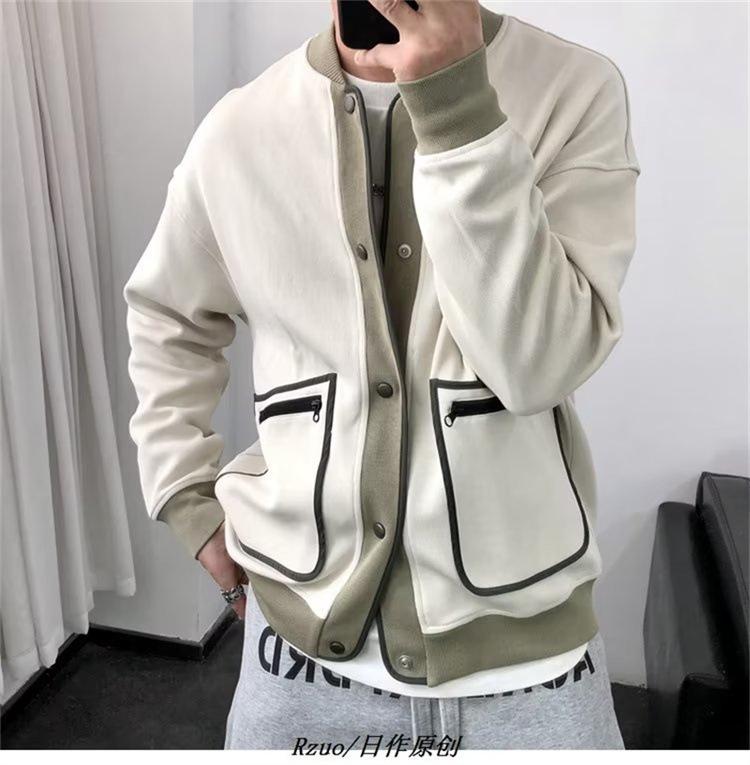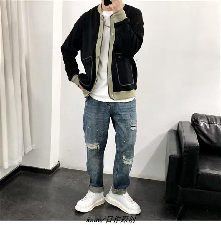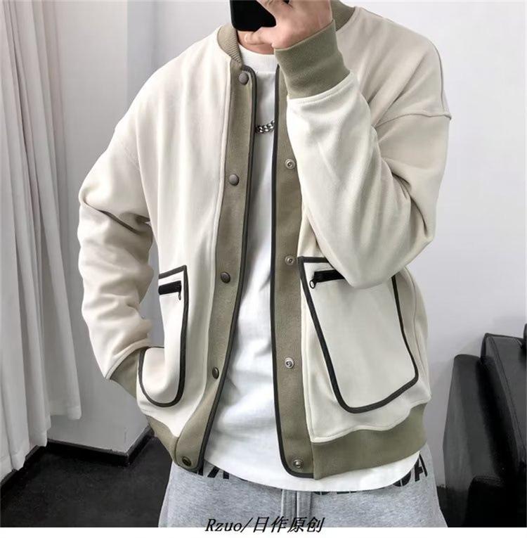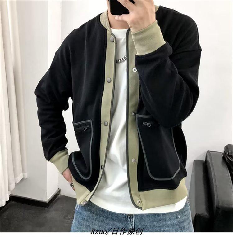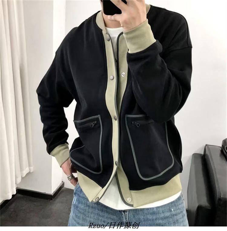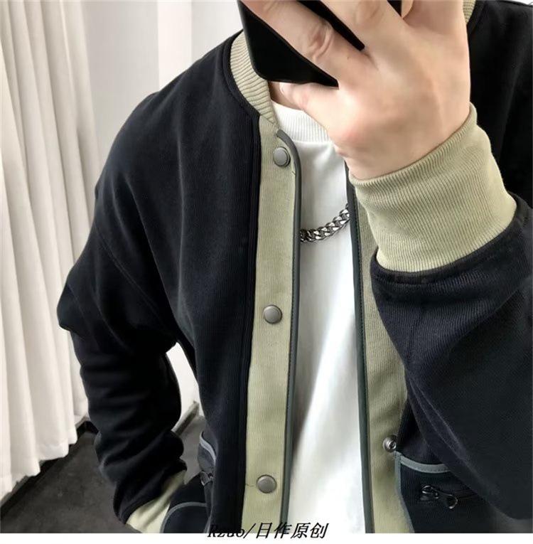 Chaqueta tipo cárdigan para hombre, primavera y otoño, nueva marca de moda, costuras de color en contraste, cuello de béisbol holgado, ropa con clip para hombre.