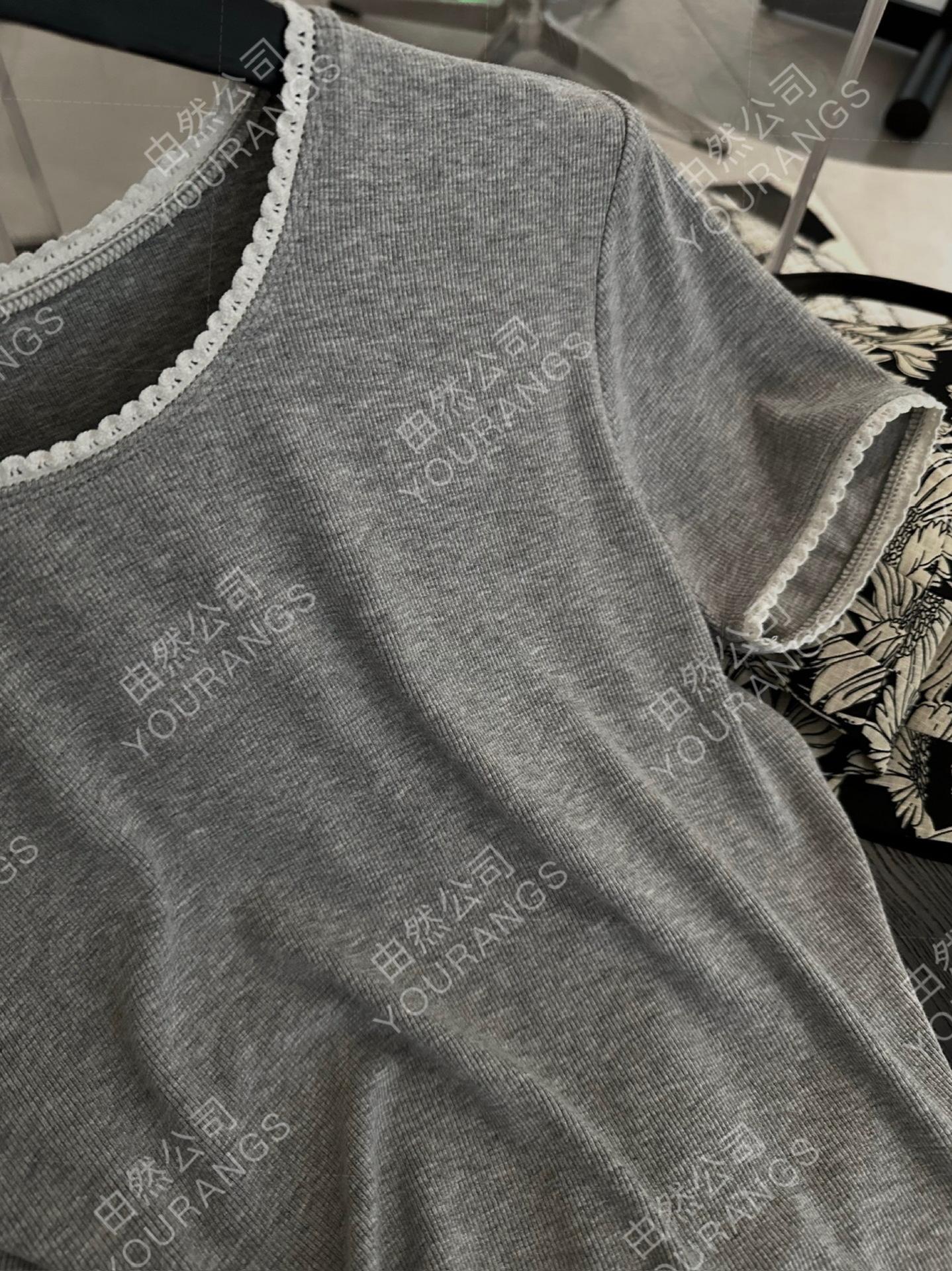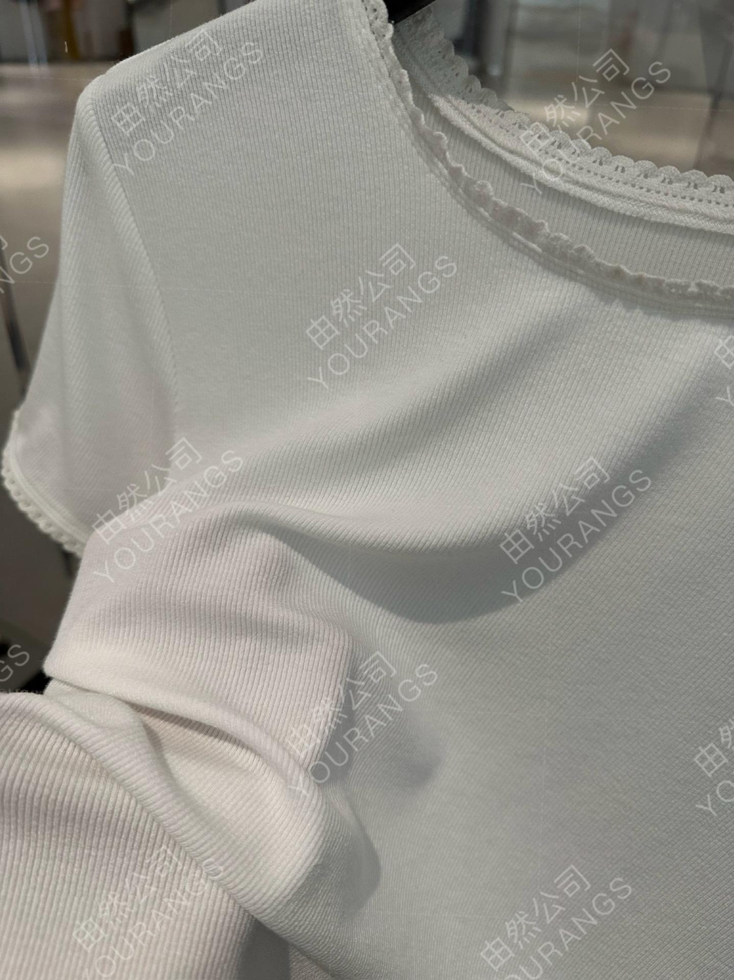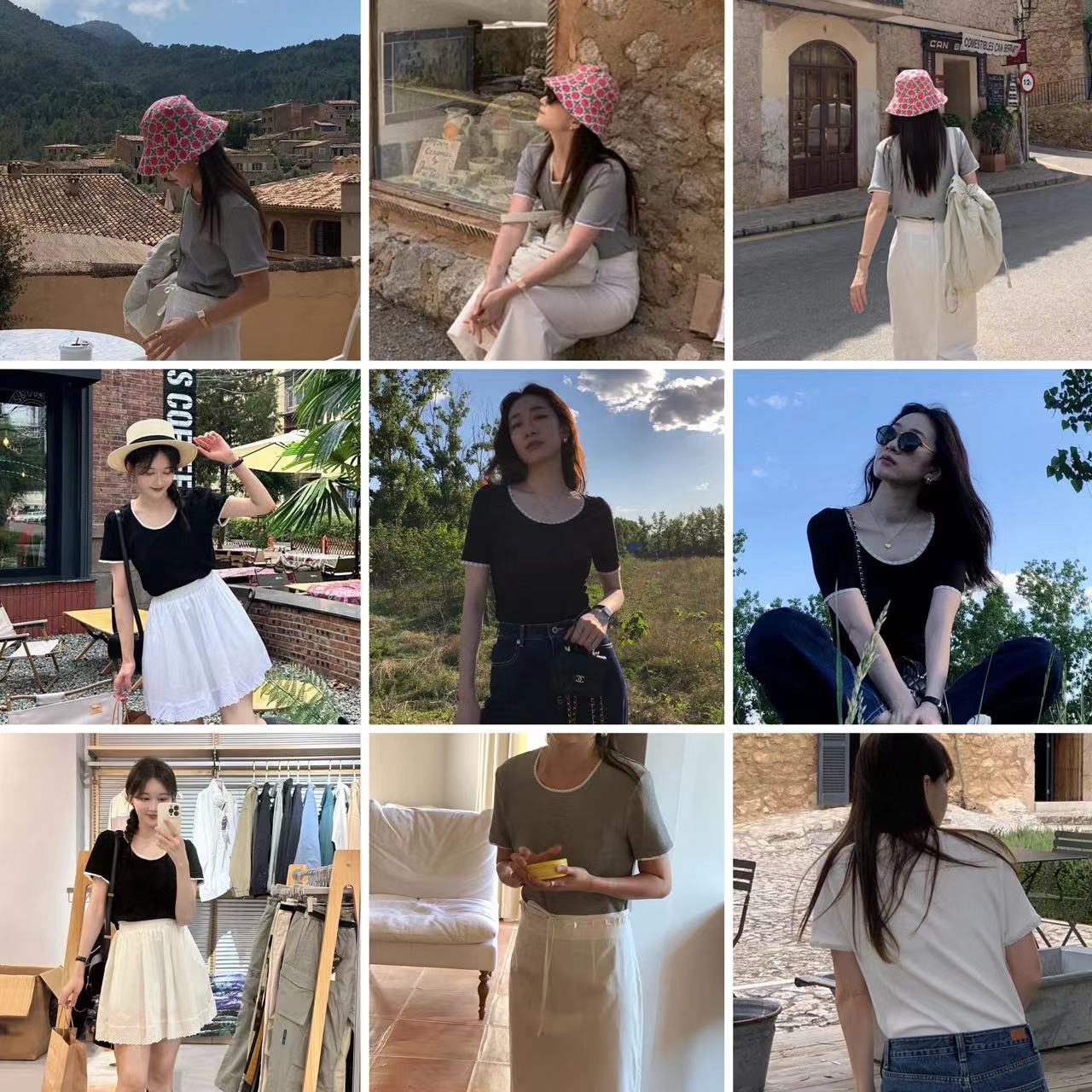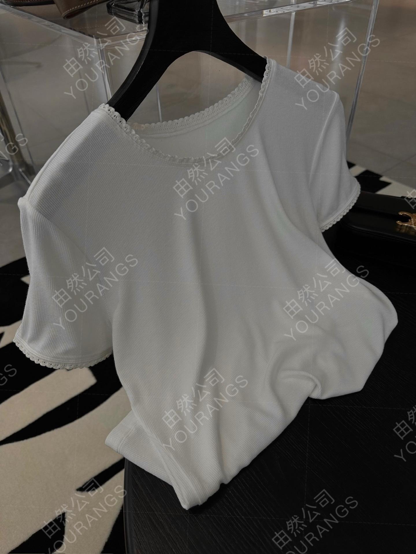[Kui Qing 65] Camiseta de manga corta, sencilla, ajustada y con cuello de encaje y estampado de hueso de serpiente en modal con tacto de piel LE