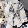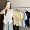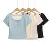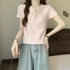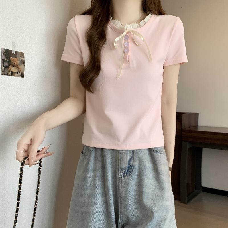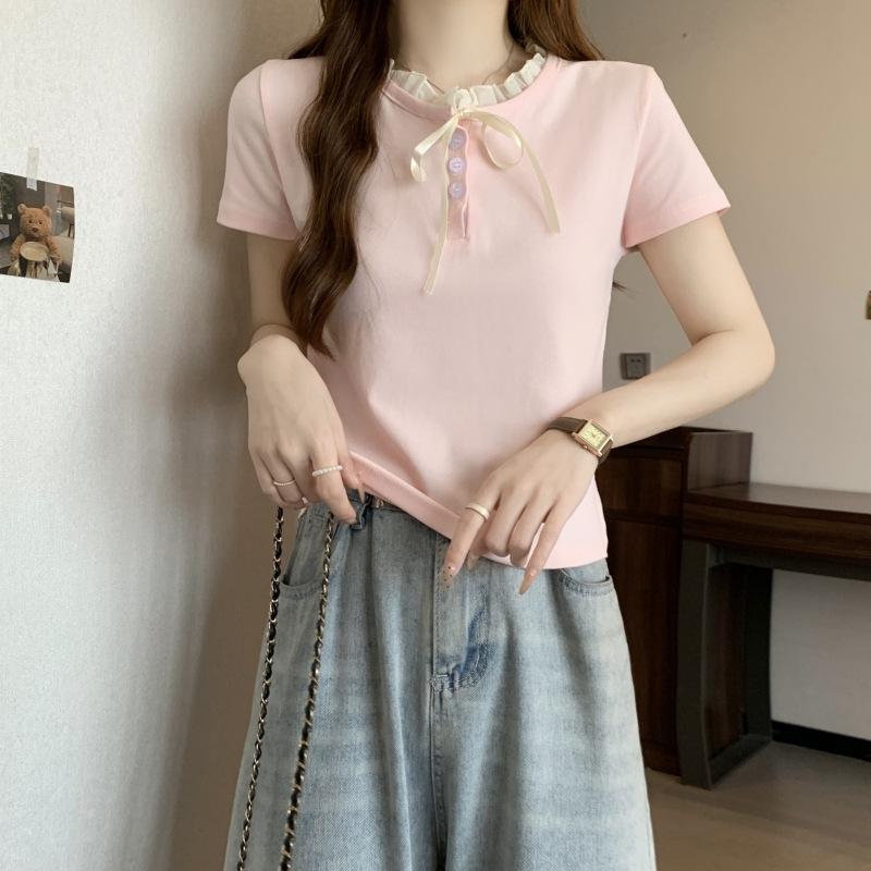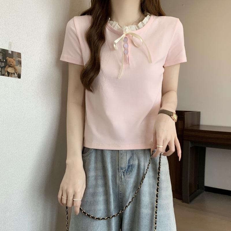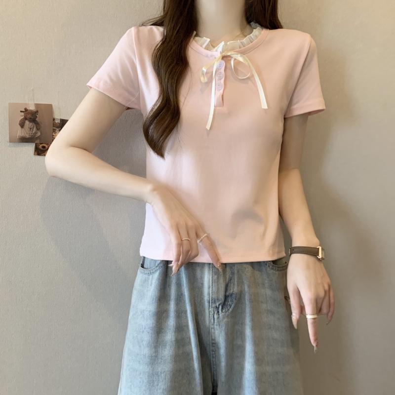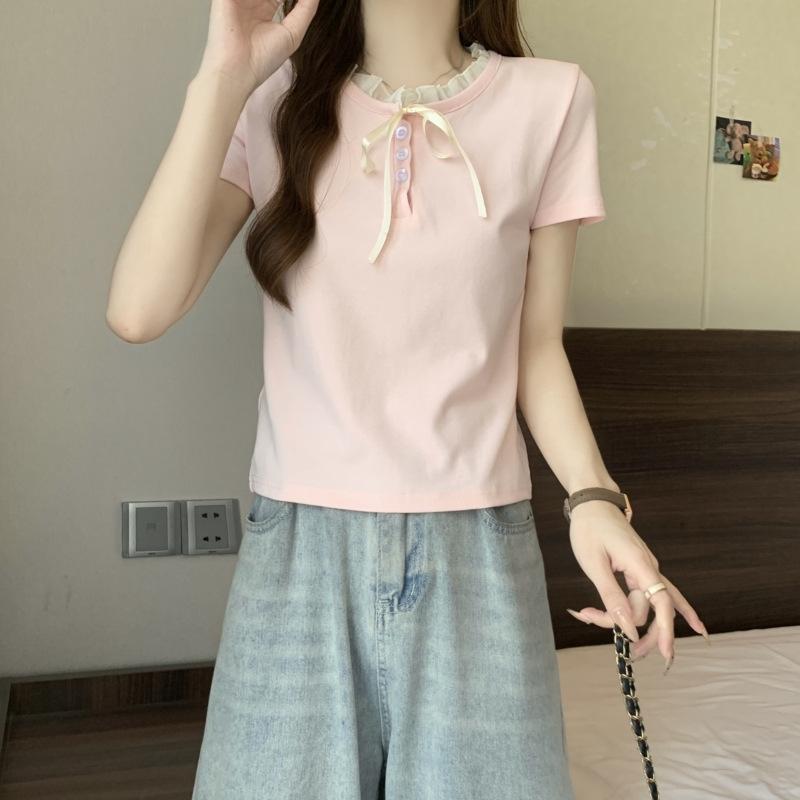 Camiseta de manga corta con costuras de mariposa y encaje de verano 2024 para mujer, estilo coreano, informal, combinable, corta, falsa, de dos piezas, moderna