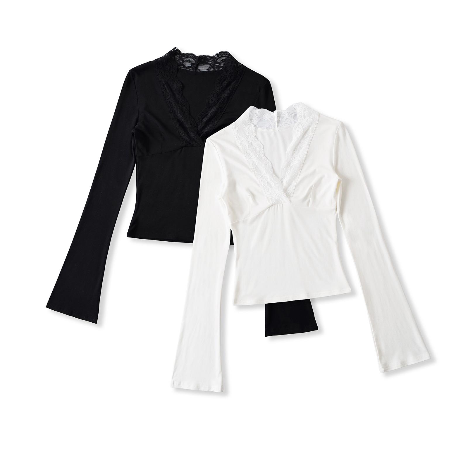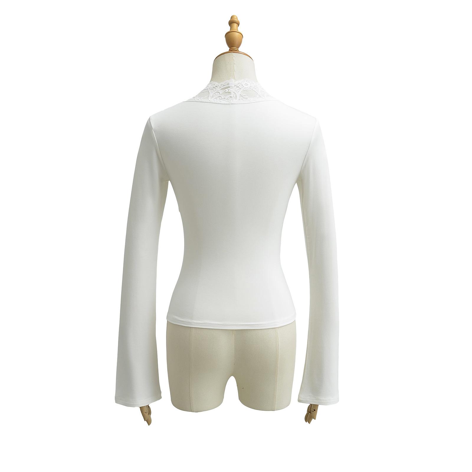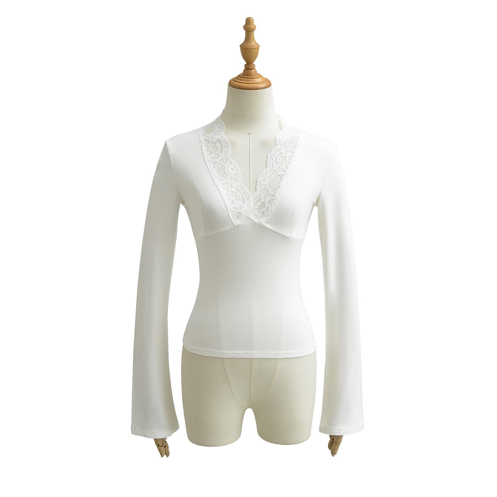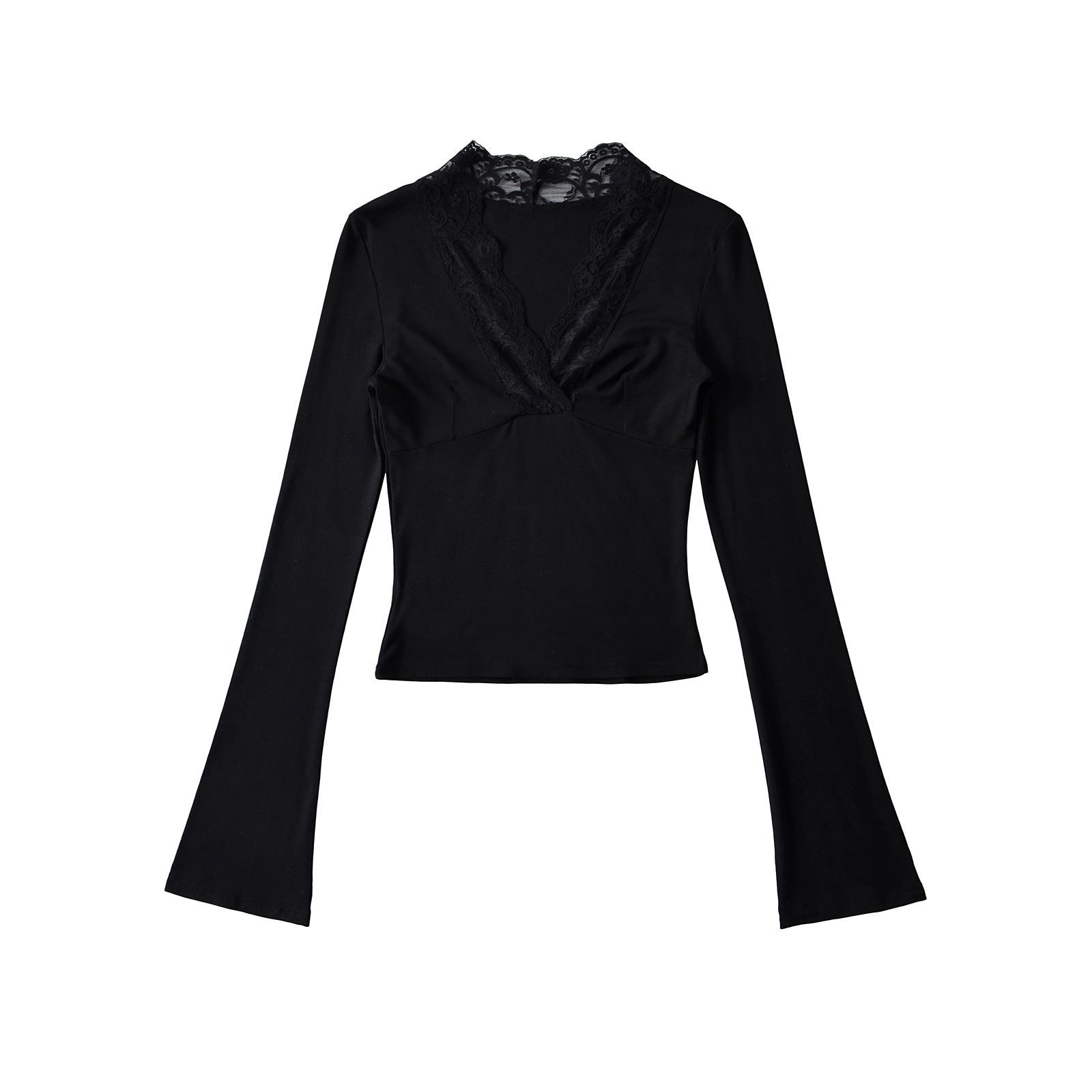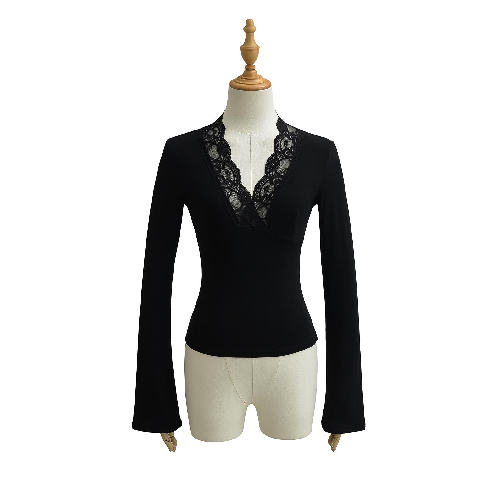 Camiseta corta elegante, ajustada y adelgazante, de manga larga, con cuello en V y encaje estilo dulce y picante para mujer, primavera 2025