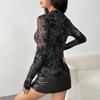 2025 Principios de Primavera Europeo y Americano Nuevo Sexy Perspectiva Cuello Redondo Malla Flocado de Flores Camiseta Base Top para Mujer 71007