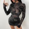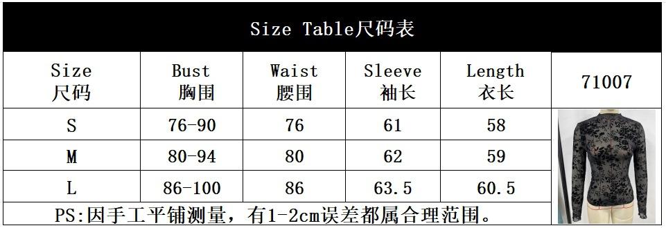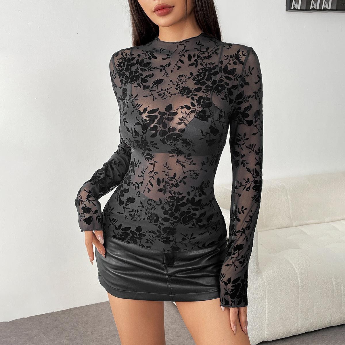 Compra 2025 Principios de Primavera Europeo y Americano Nuevo Sexy Perspectiva Cuello Redondo Malla Flocado de Flores Camiseta Base Top para Mujer 71007 al por mayor en Joom.pro