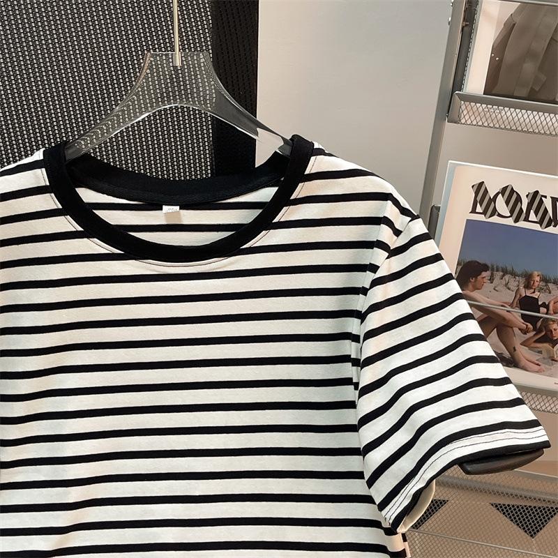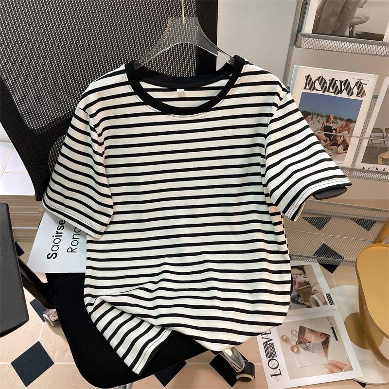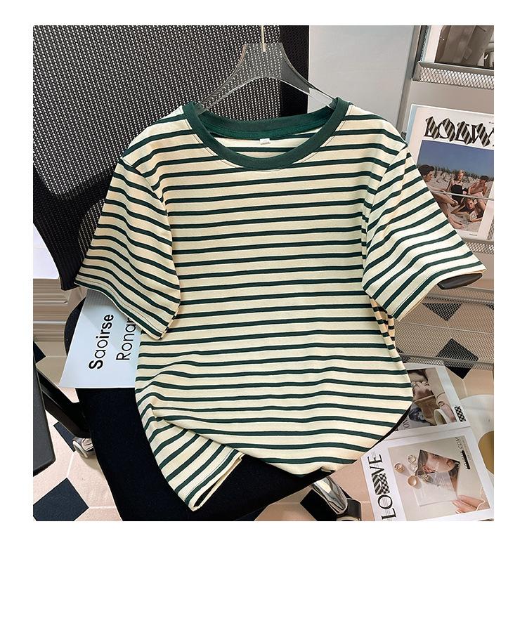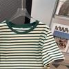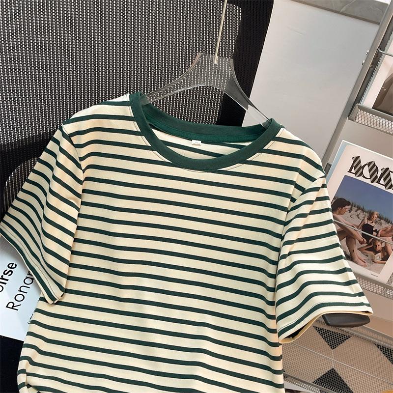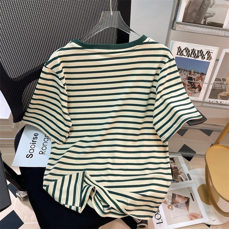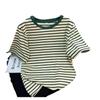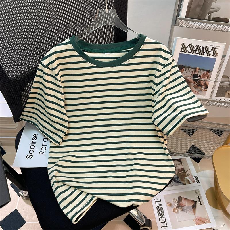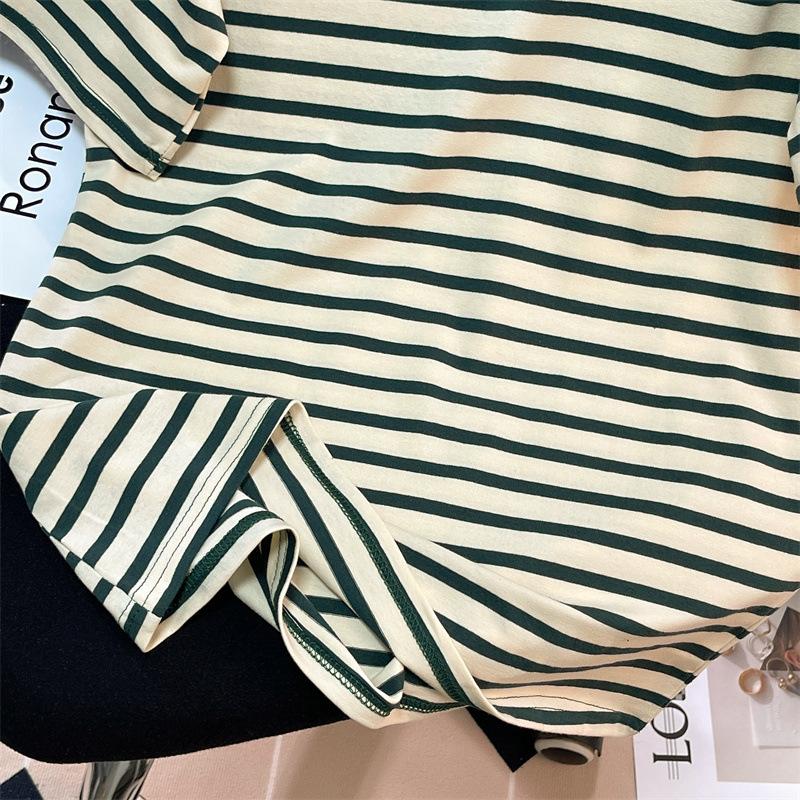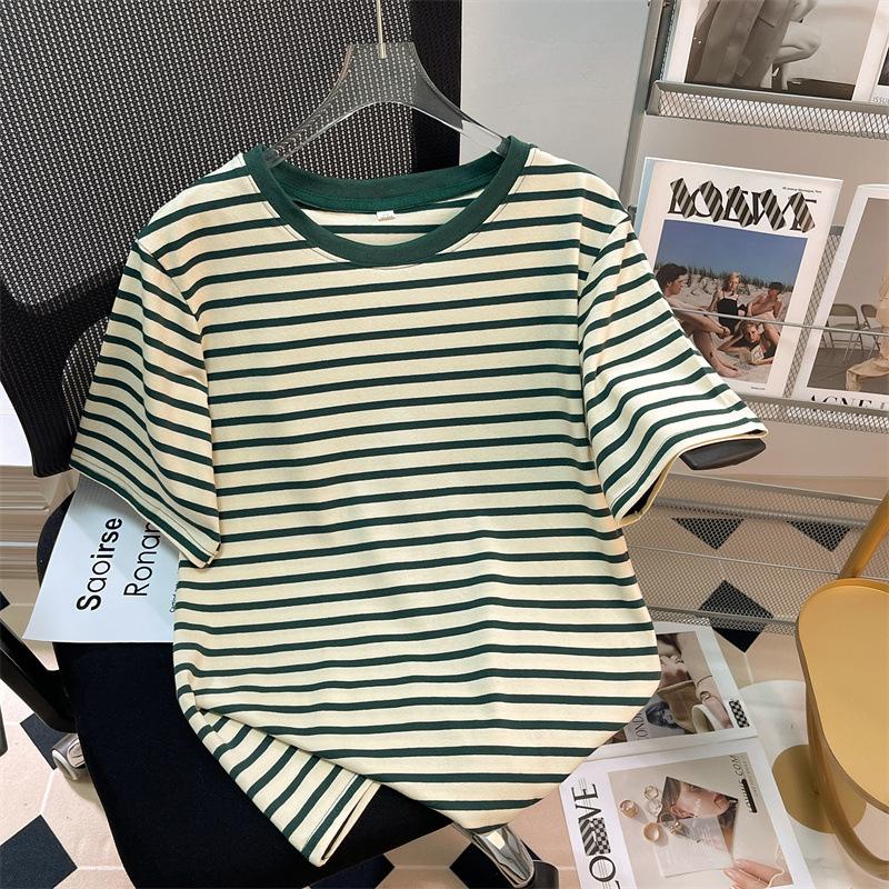 Camiseta de manga corta para mujer, fina, de verano 2024, nueva, holgada, de algodón puro, con rayas verdes, para mujer