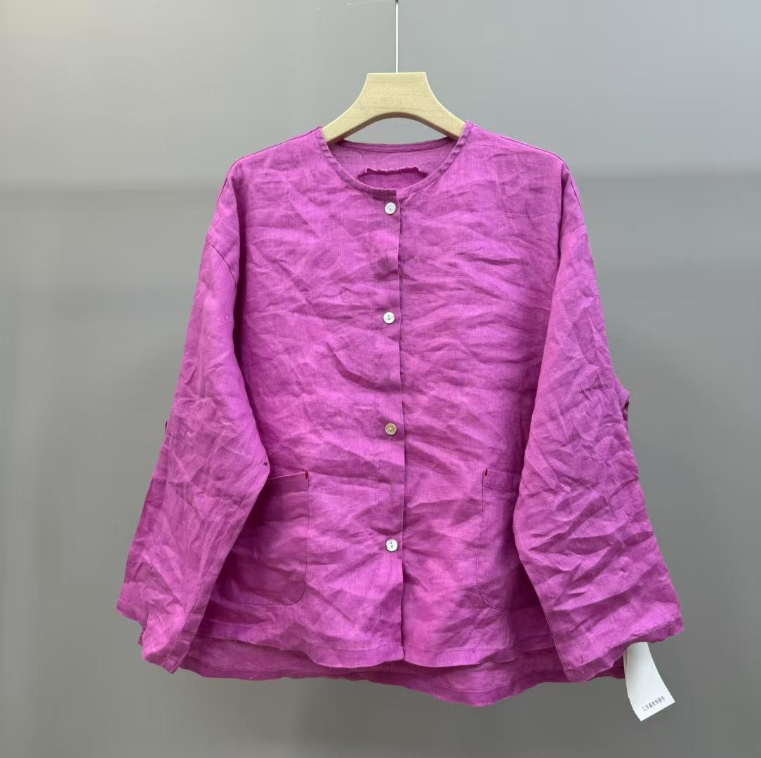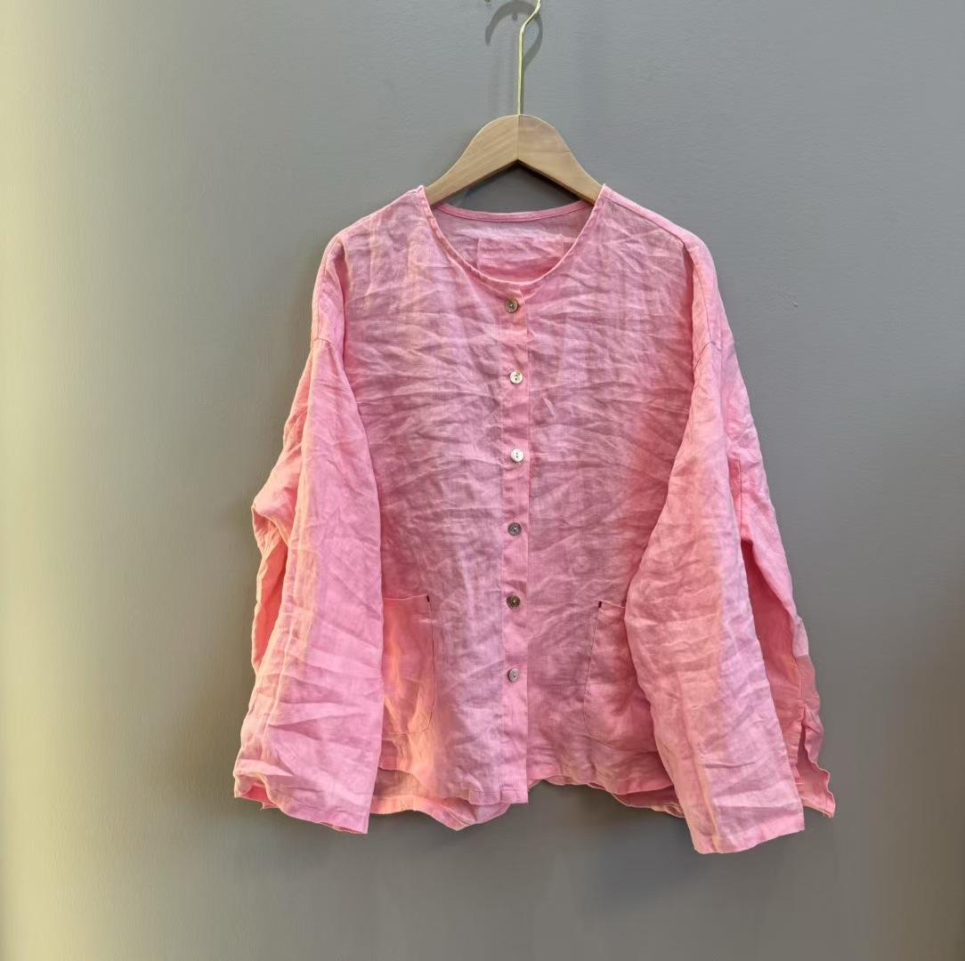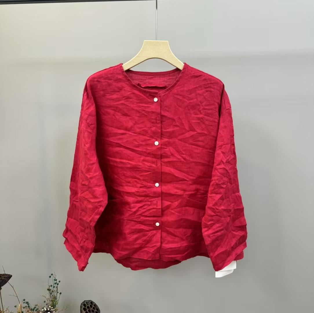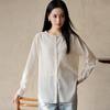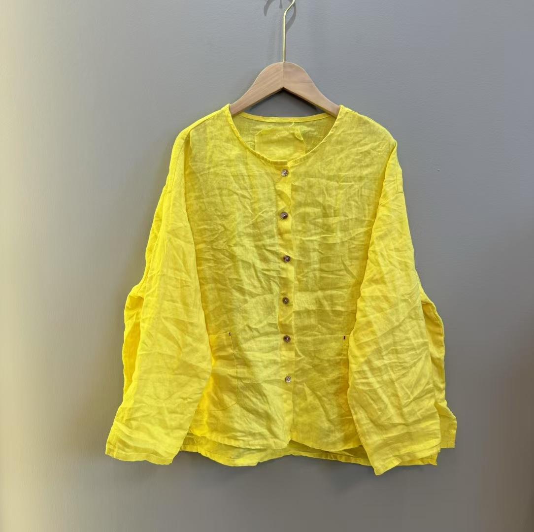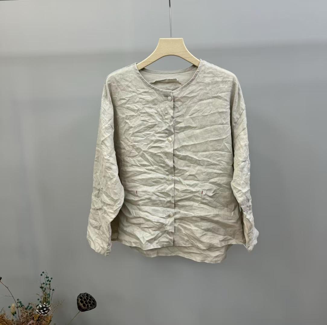 Primavera 2025, nuevo cárdigan artístico elegante de cuello redondo en color liso, camisa informal holgada de lino para mujer