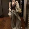 Apricot cardigan, Brown sling, Khaki gray pants, Apricot cardigan + brown suspenders