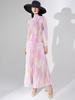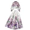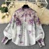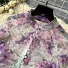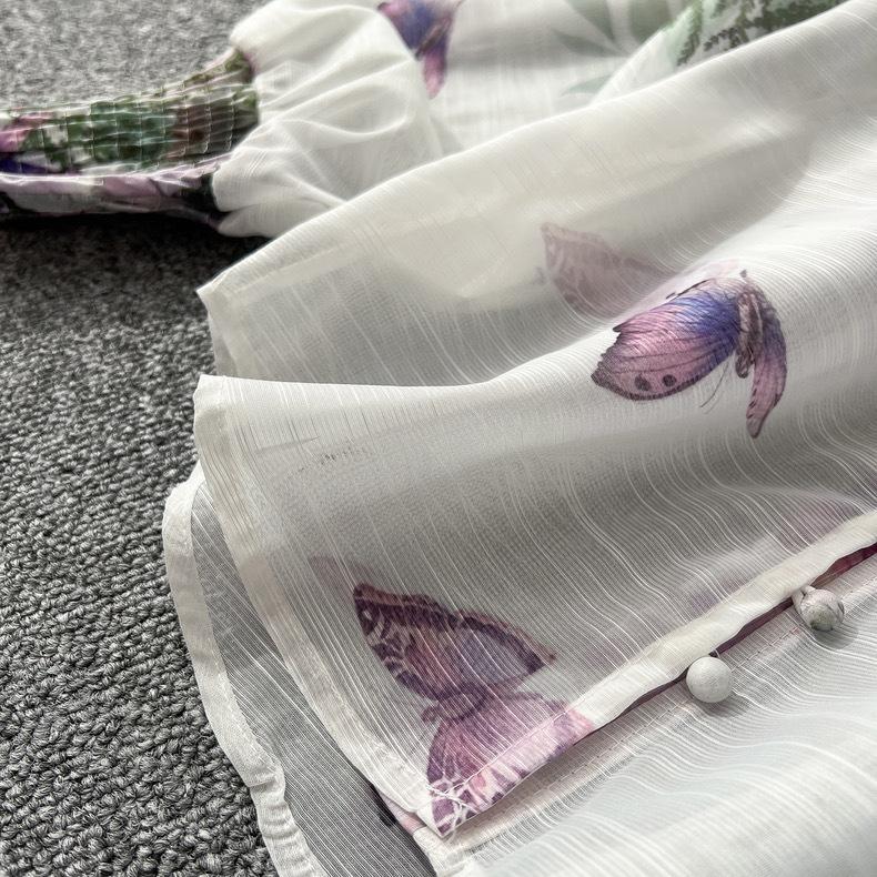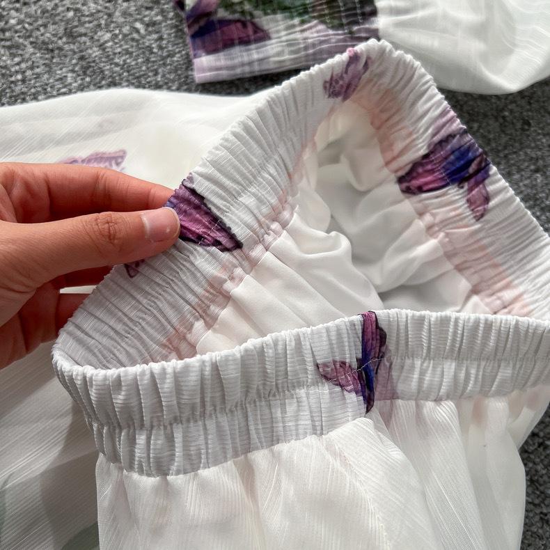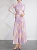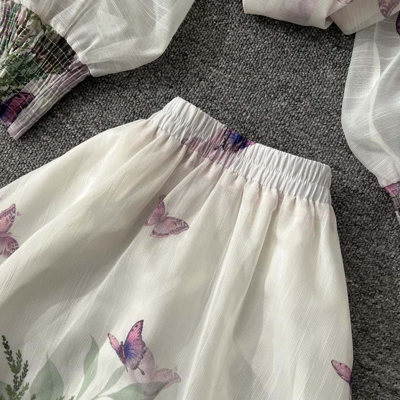 Conjunto de dos piezas con estampado de alta gama transfronterizo de Europa y Estados Unidos, primavera nueva, estilo socialité, con mangas acampanadas, top con botones y falda de cintura alta