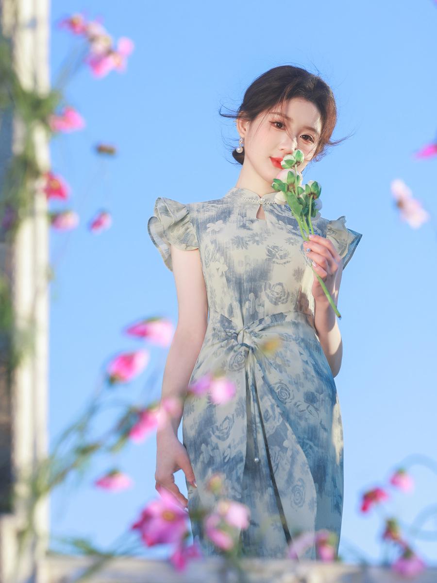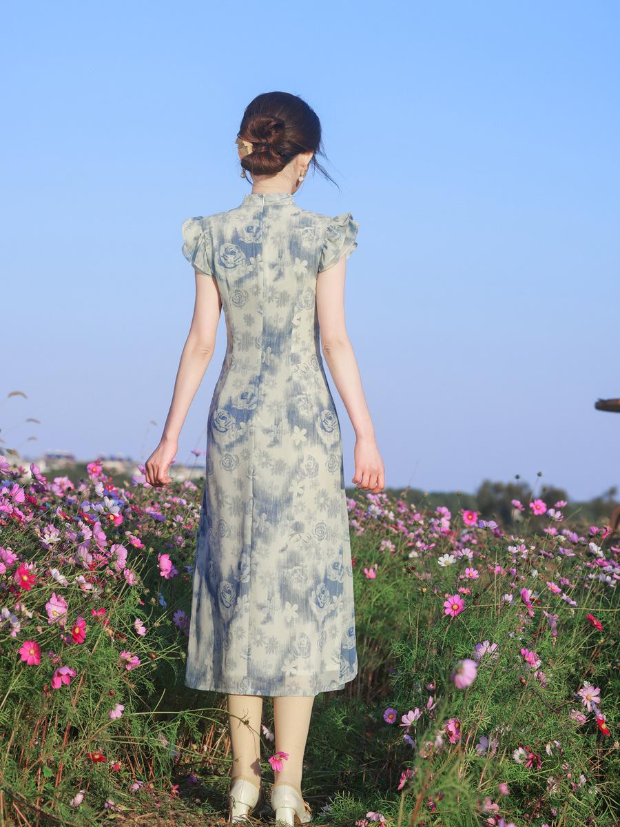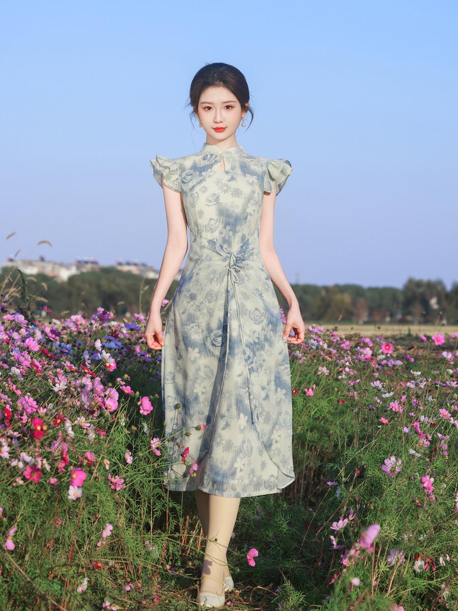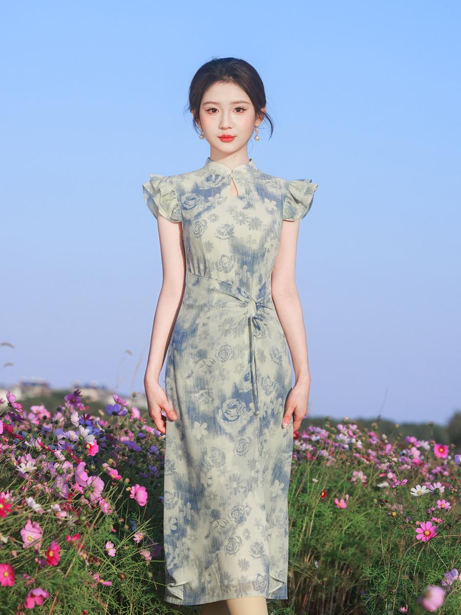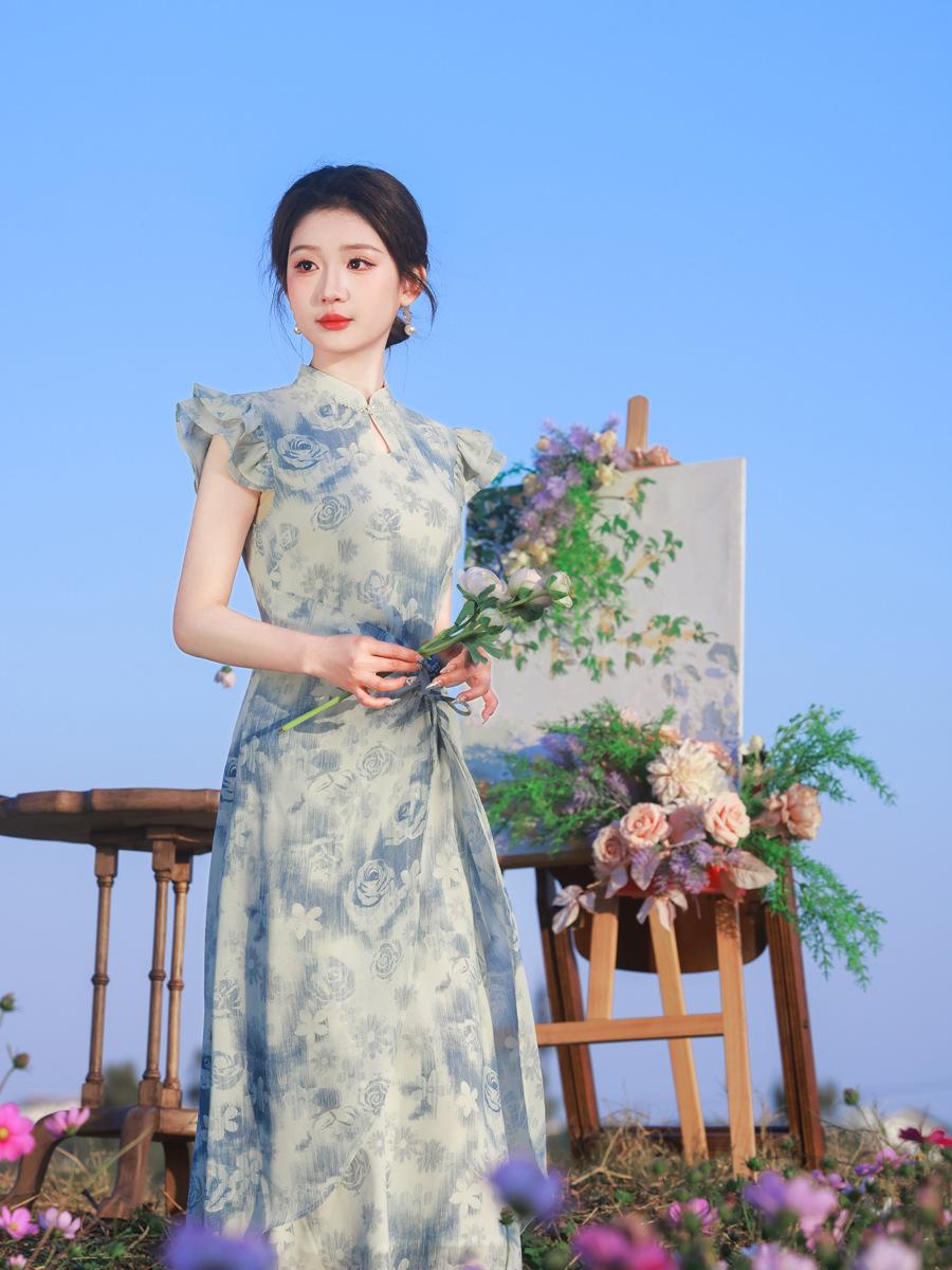 Vestido cheongsam de alta gama, nuevo estilo chino, 2025, retro, con mangas voladoras, flores quemadas, plisado, cintura dividida, para uso diario en mujeres.