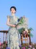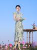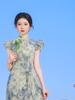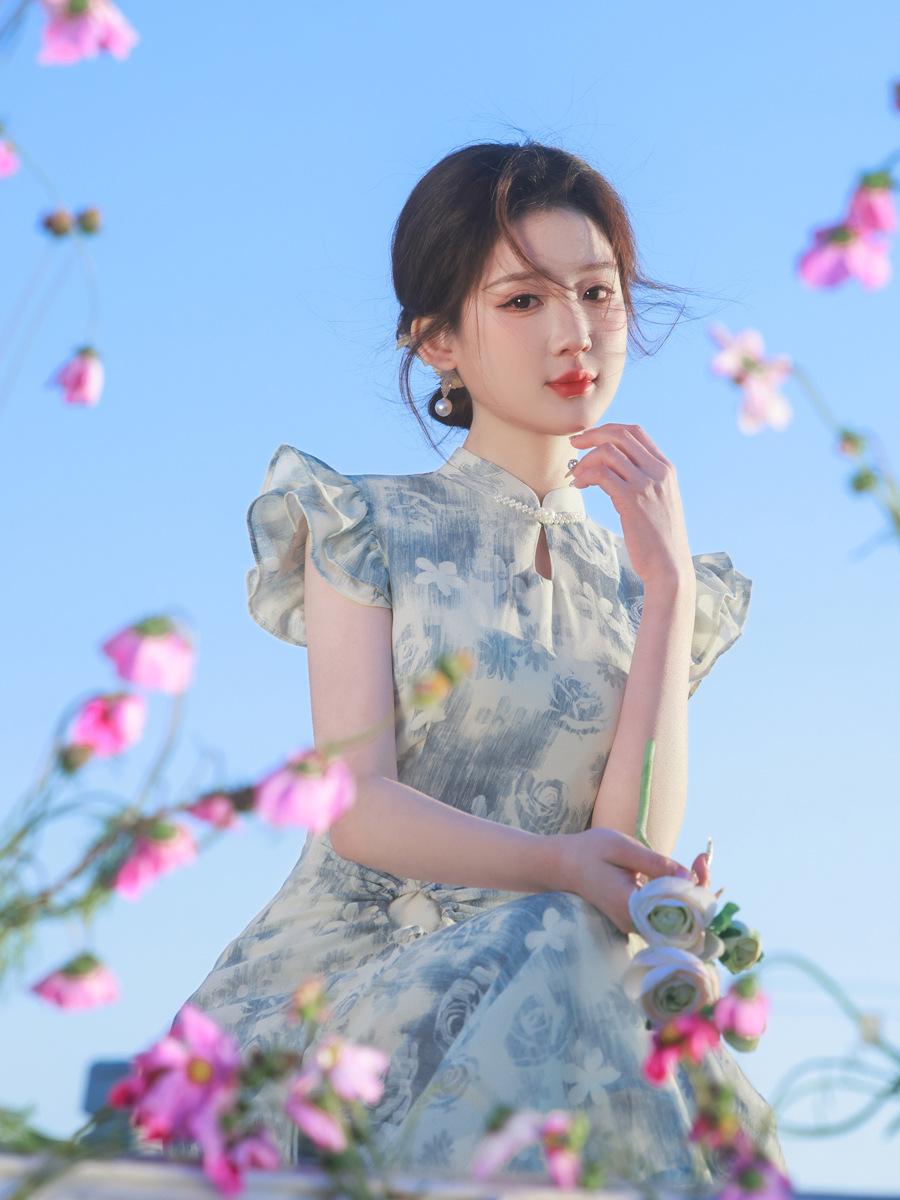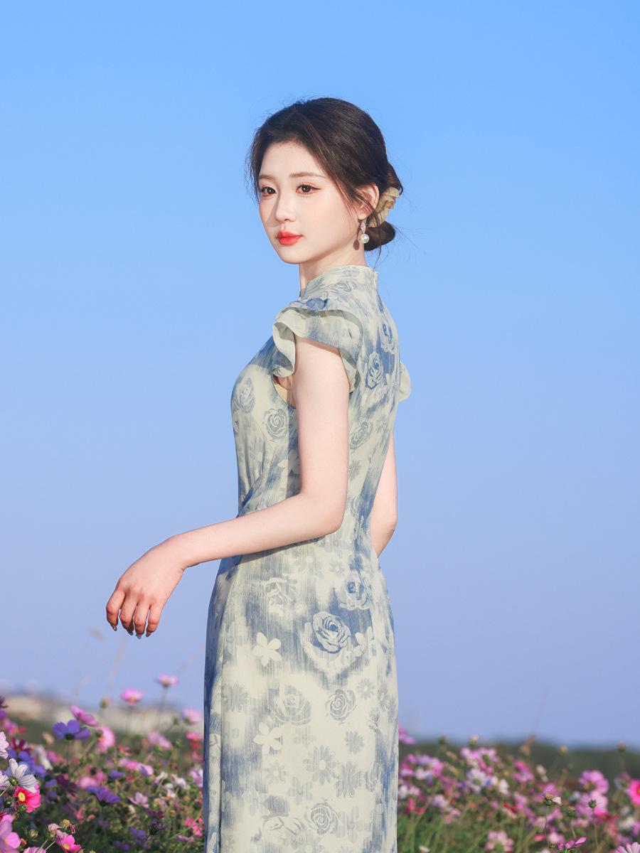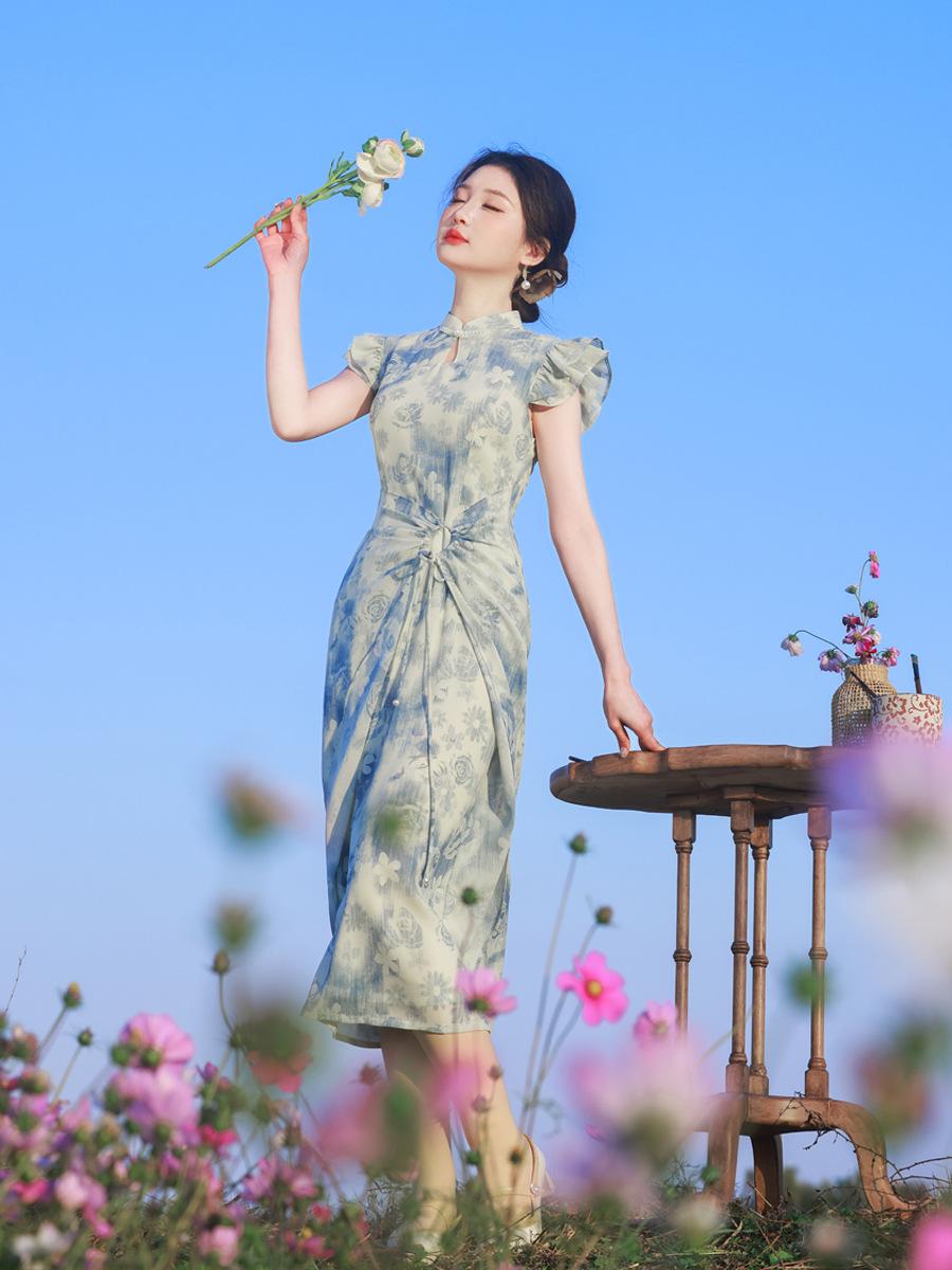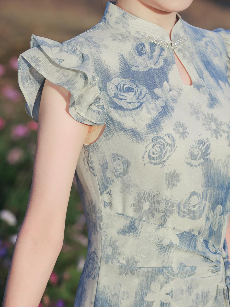 Vestido cheongsam de alta gama, nuevo estilo chino, 2025, retro, con mangas voladoras, flores quemadas, plisado, cintura dividida, para uso diario en mujeres.