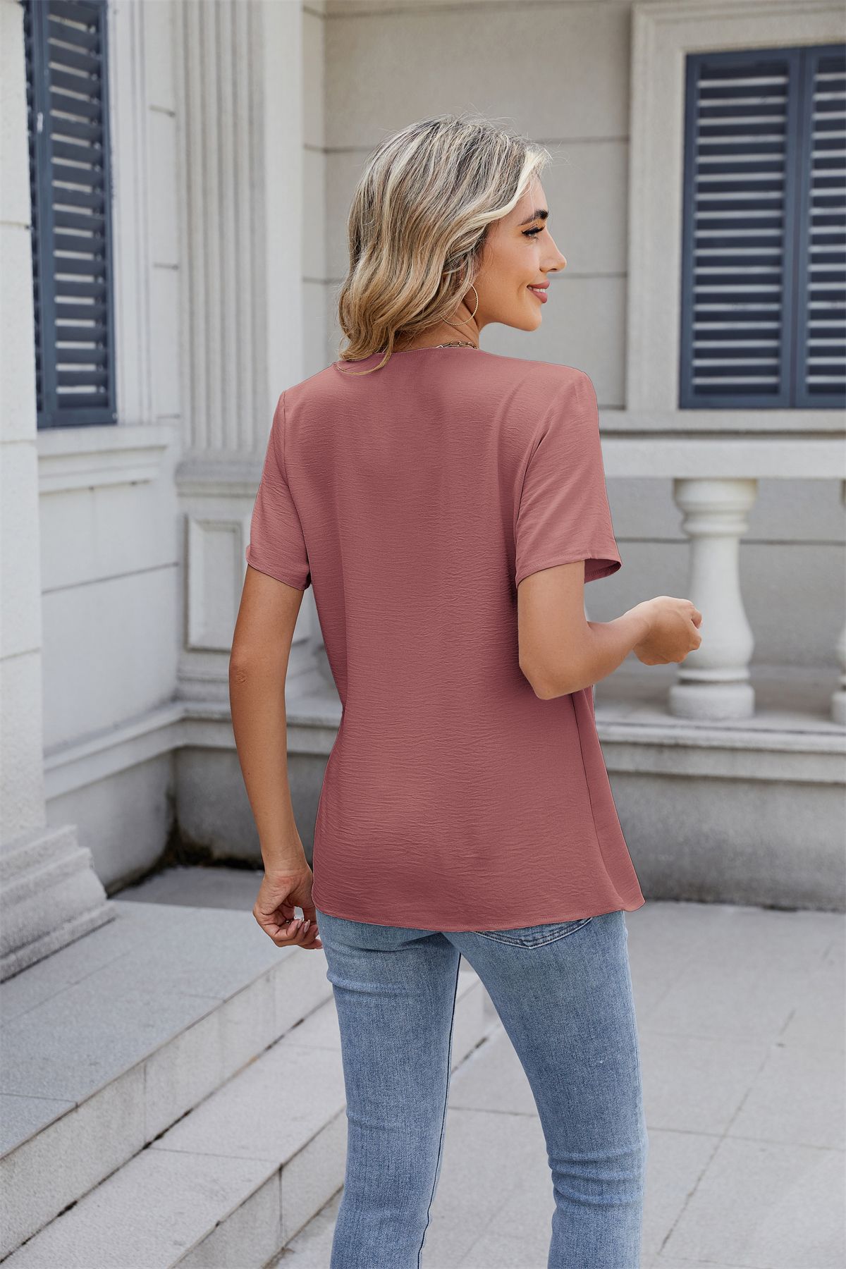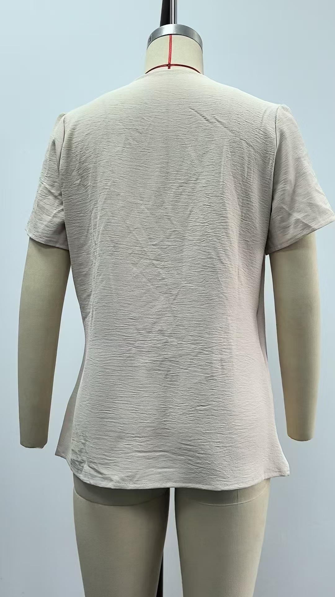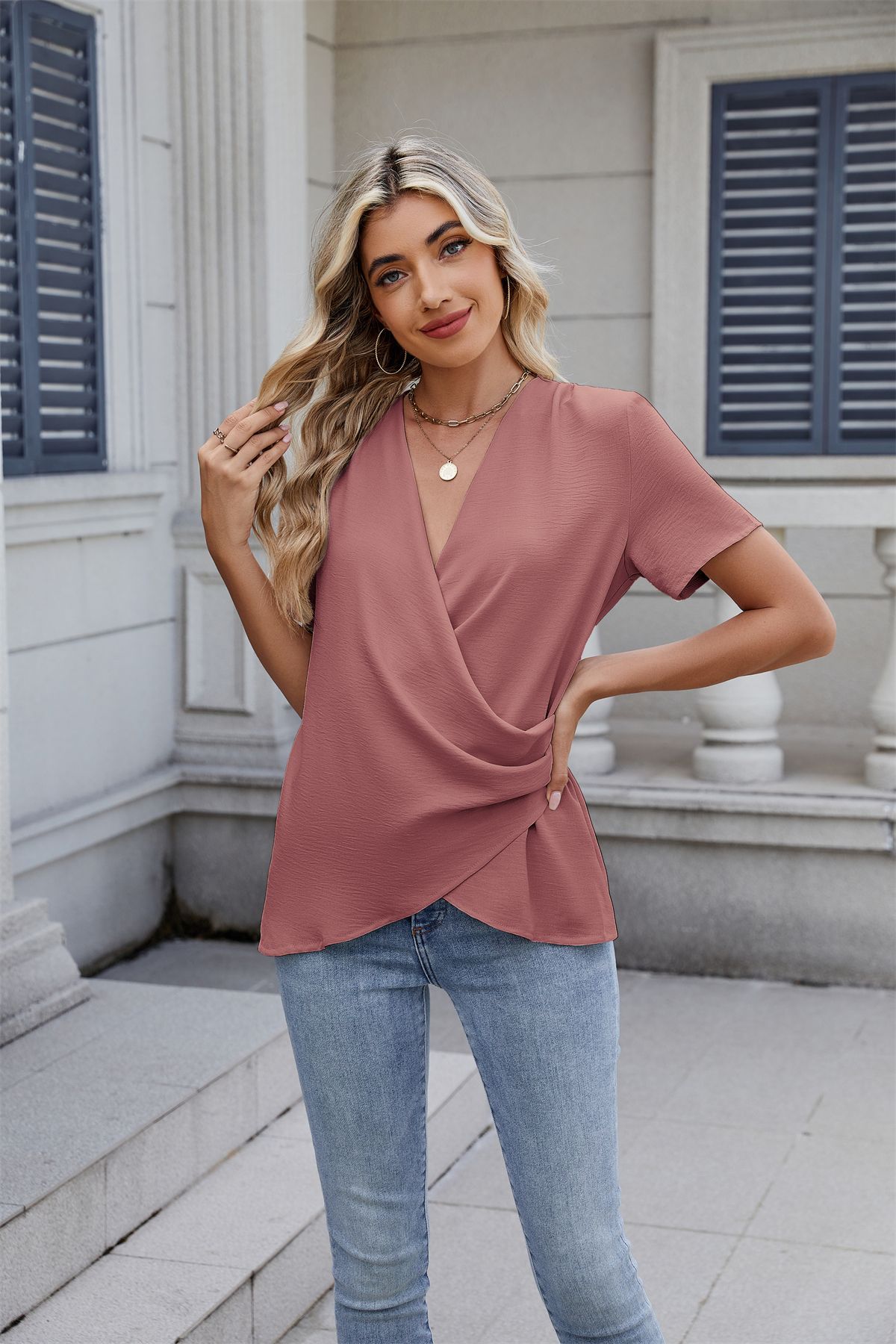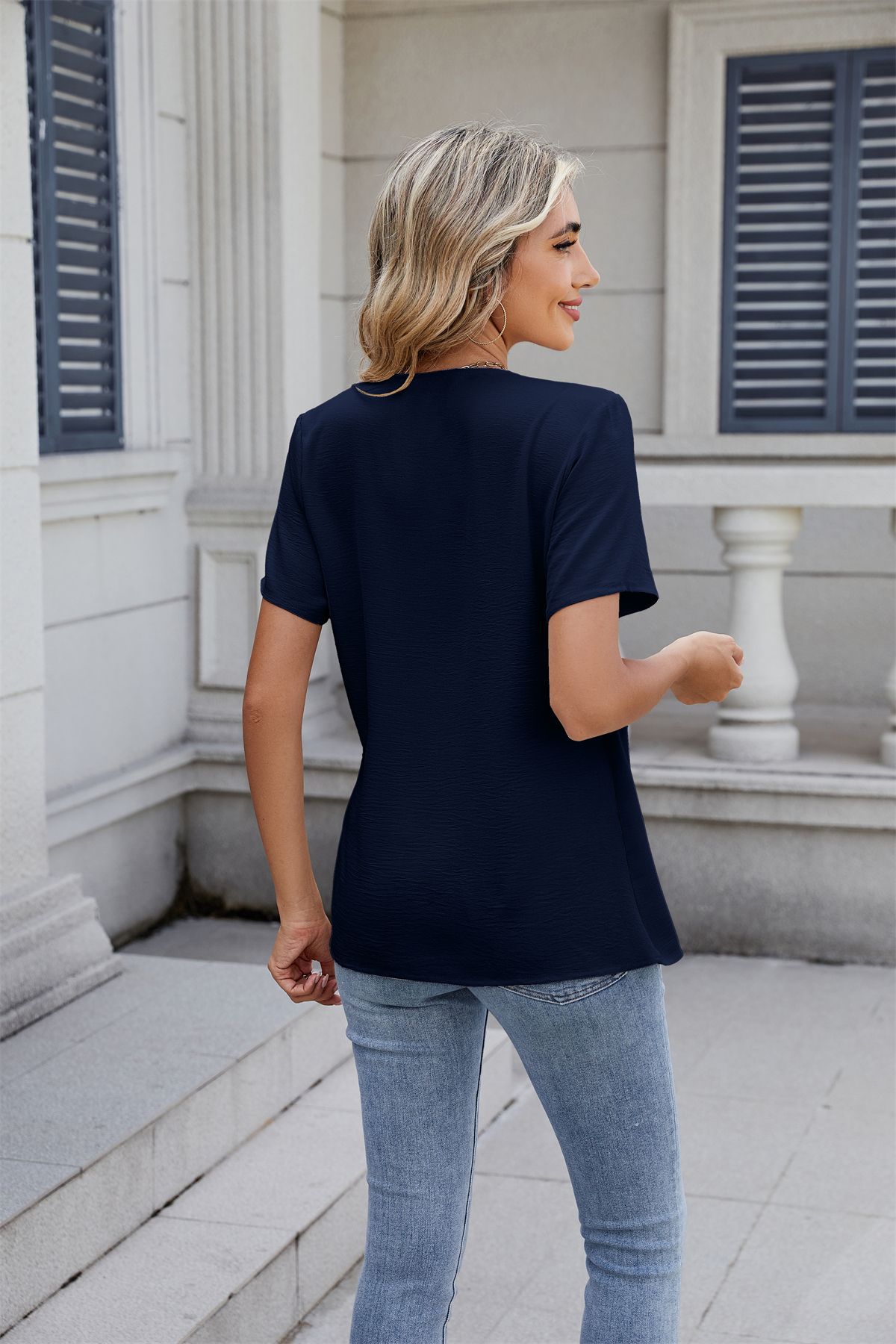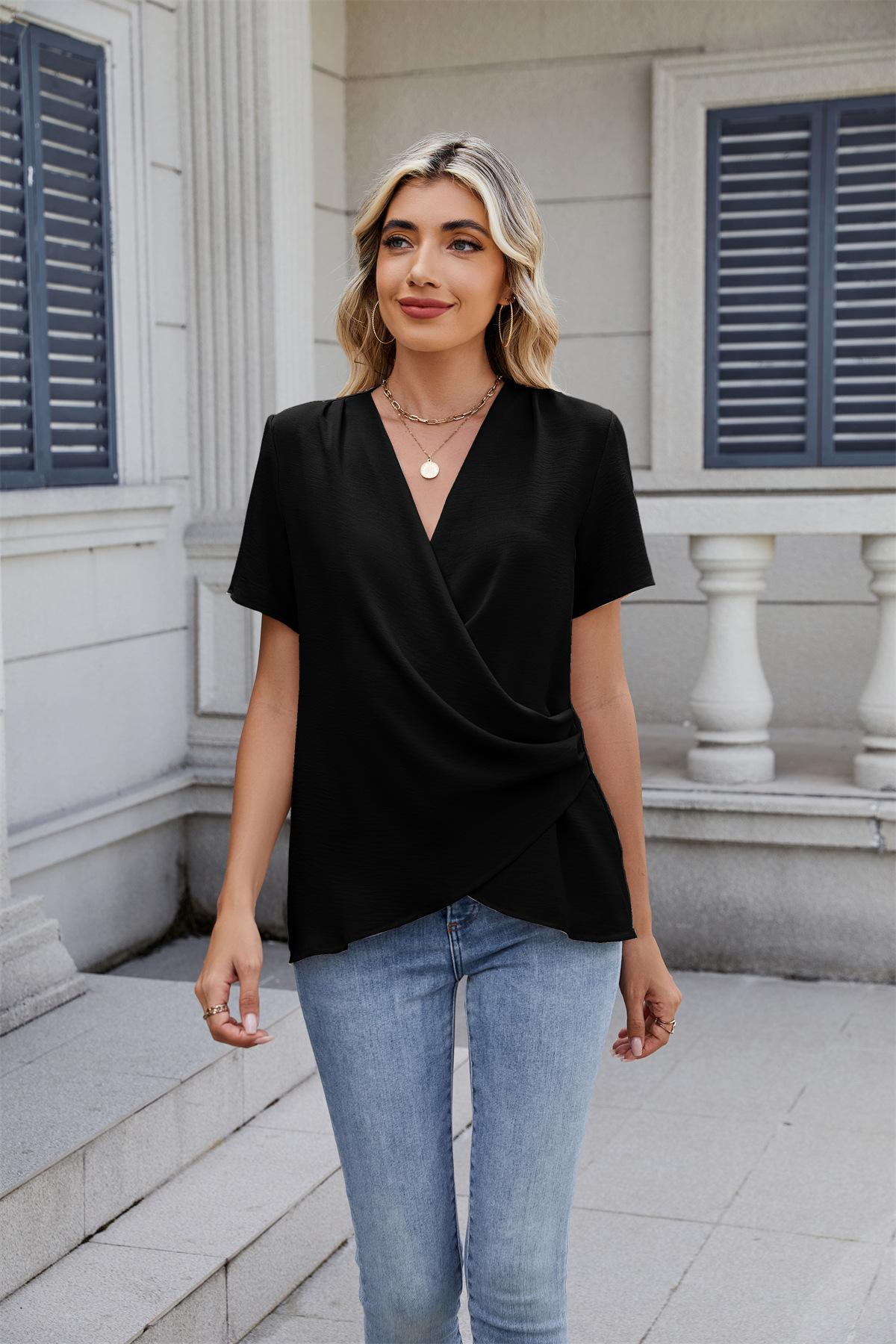 Camiseta informal de color sólido con cuello en V para mujer, primavera y verano 2025, comercio exterior europeo y americano transfronterizo de Amazon