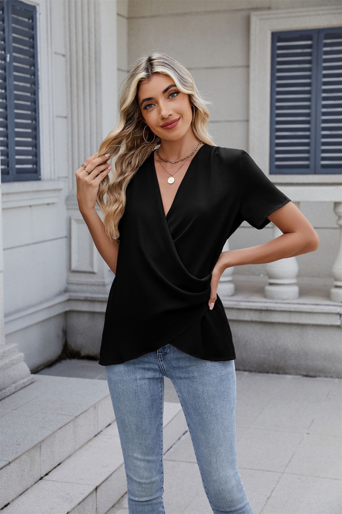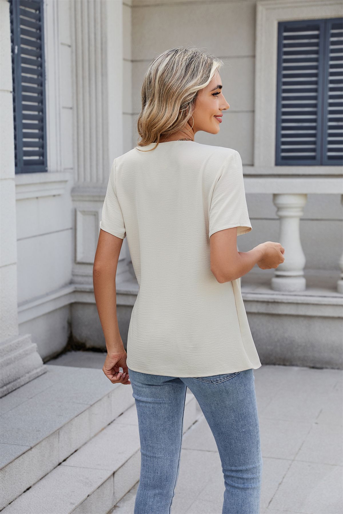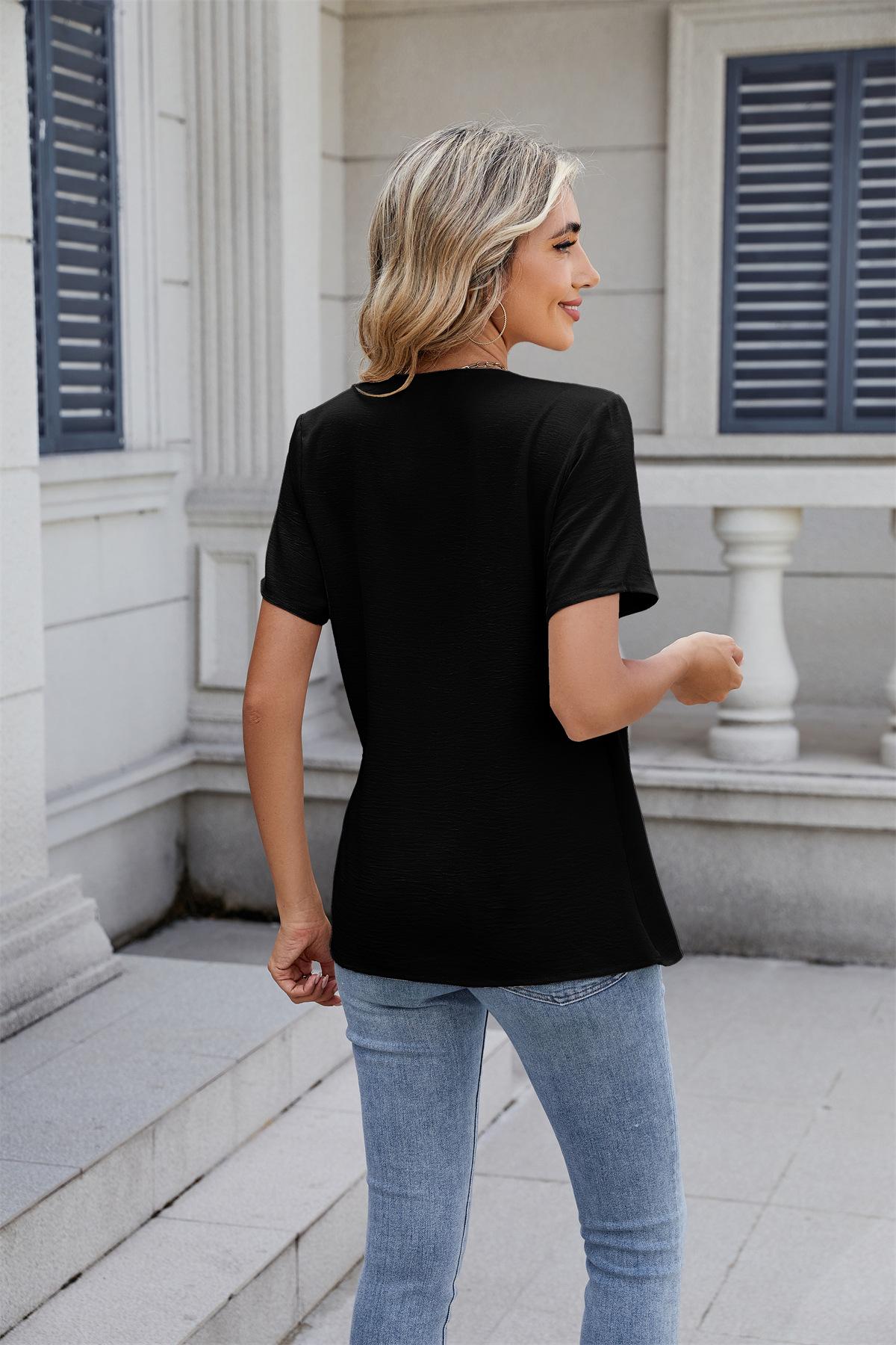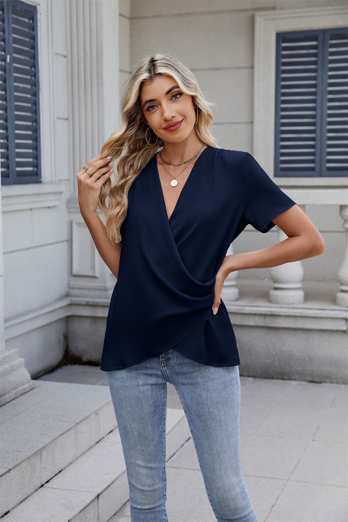 Camiseta informal de color sólido con cuello en V para mujer, primavera y verano 2025, comercio exterior europeo y americano transfronterizo de Amazon