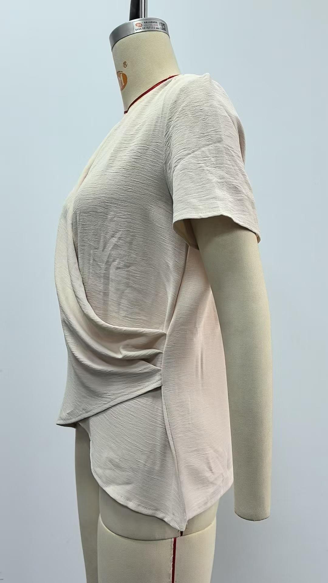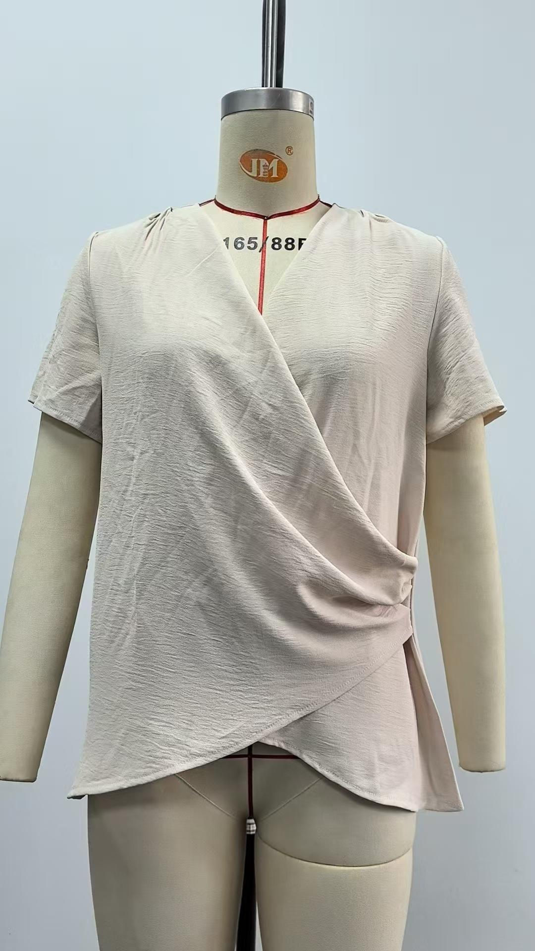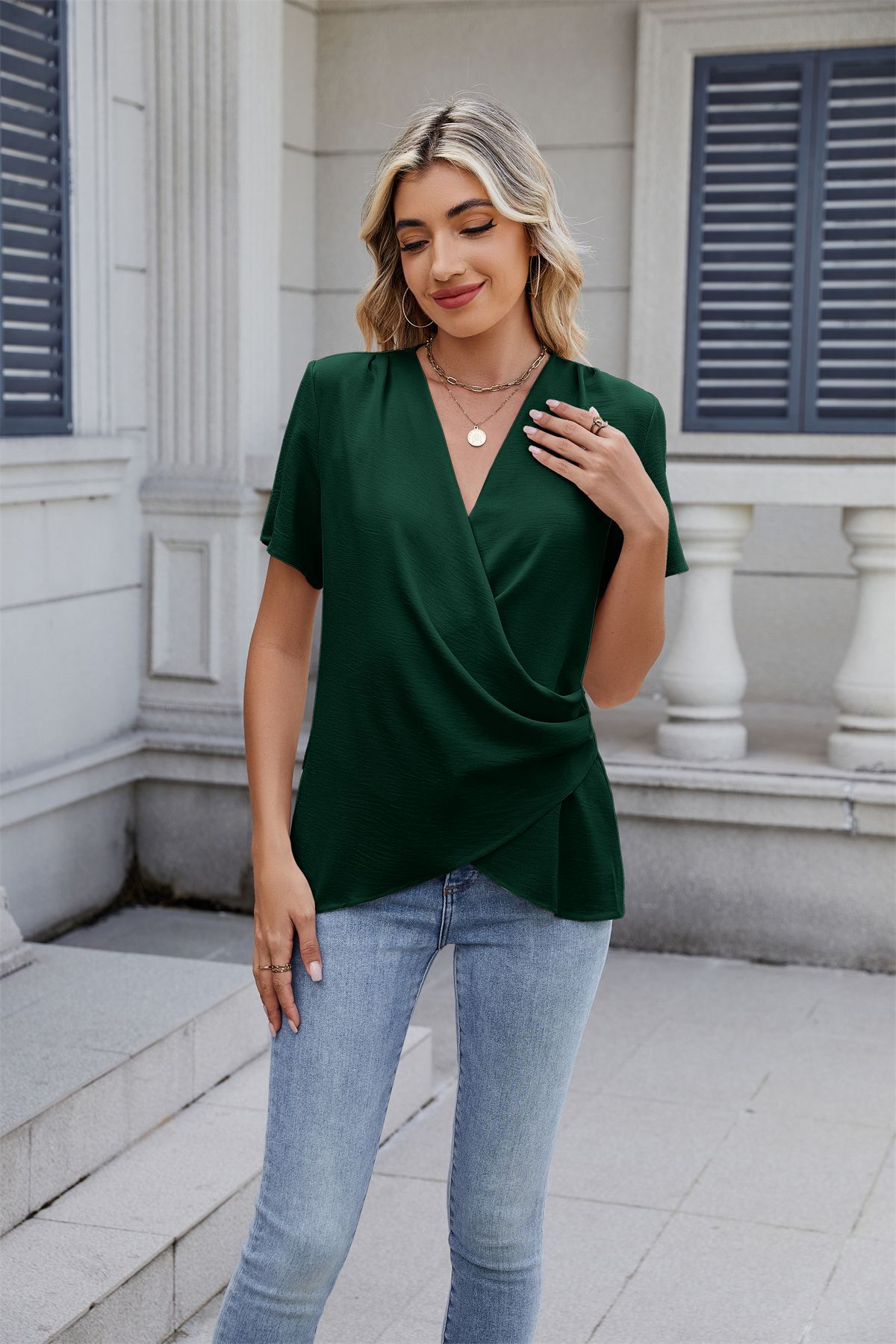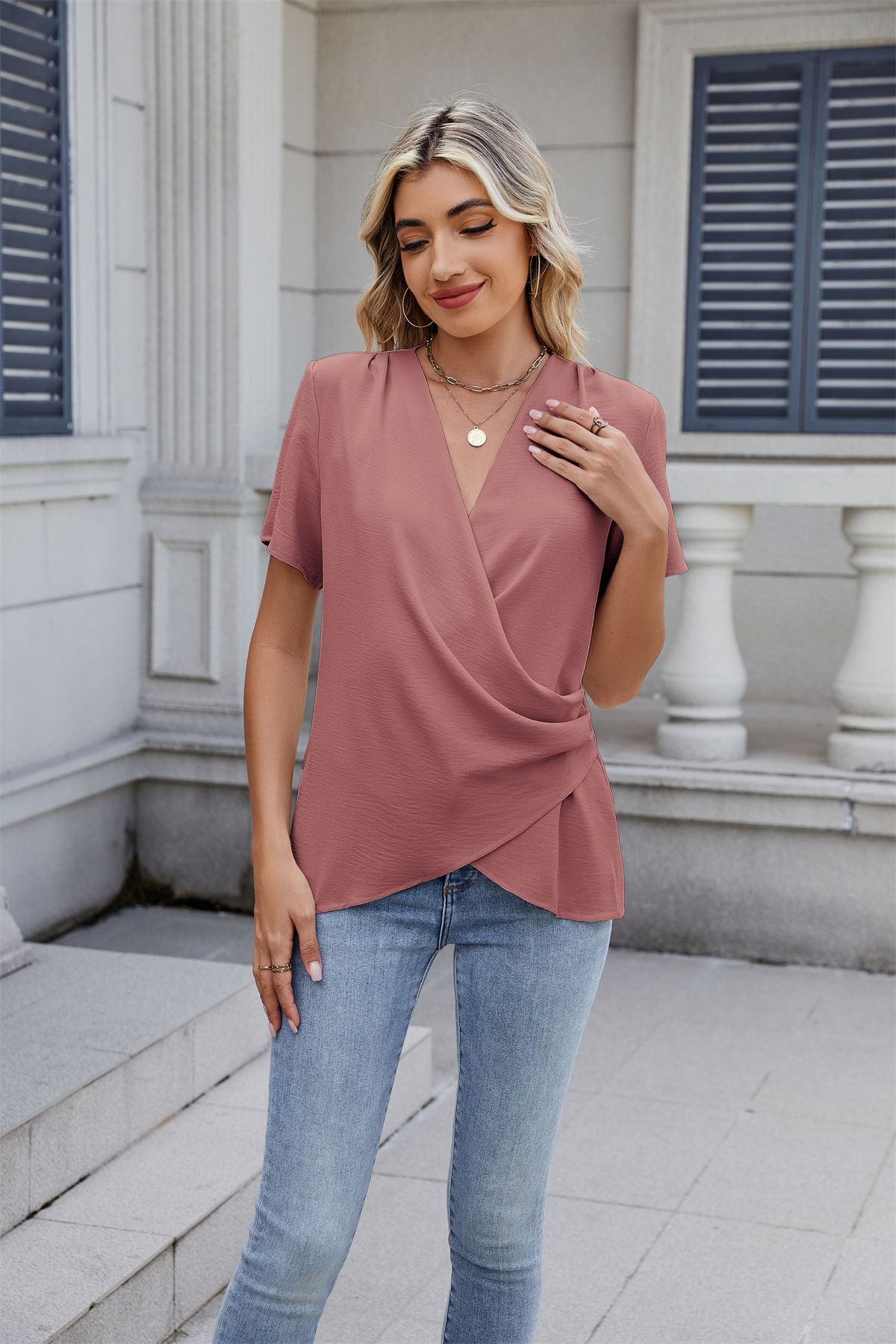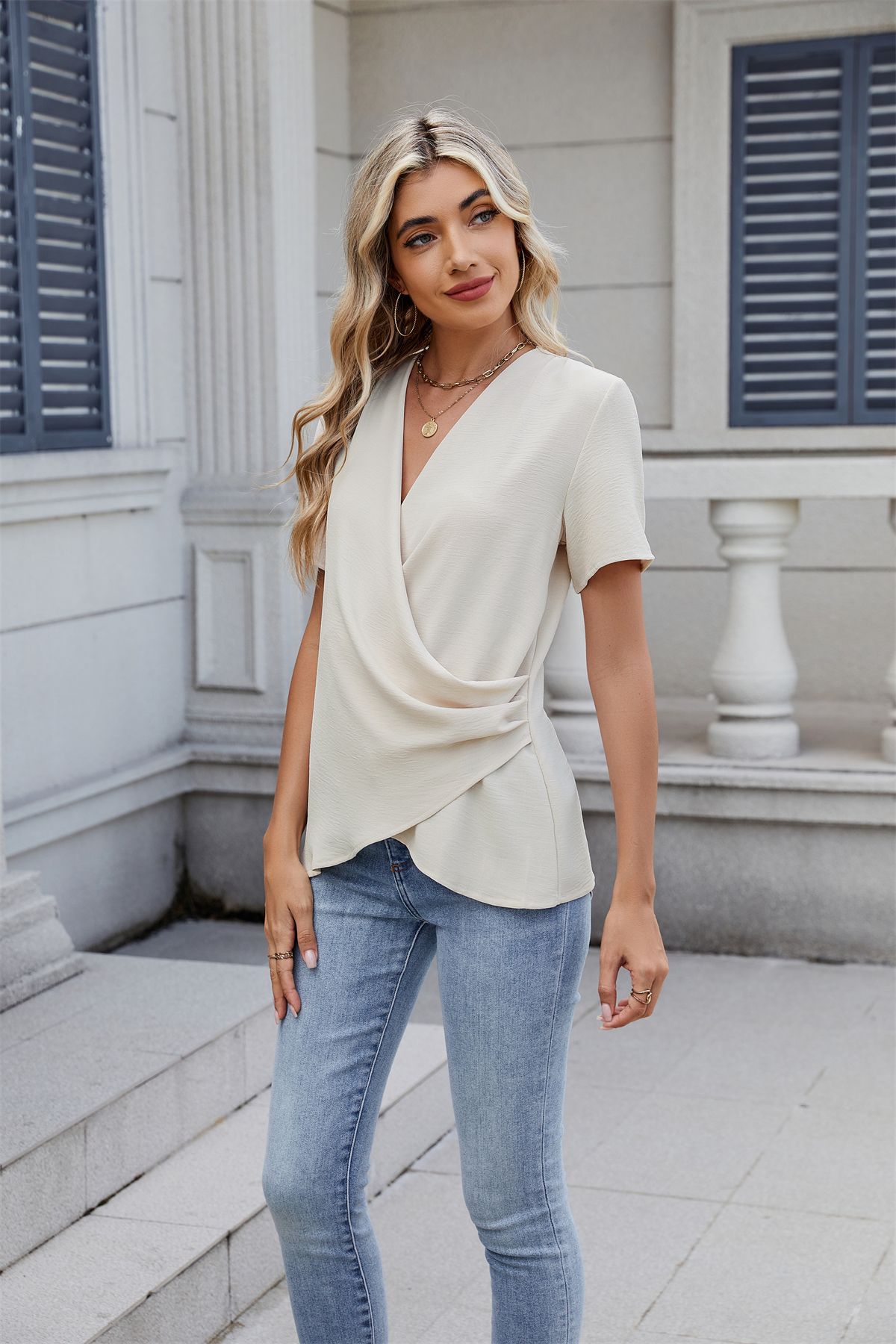 Camiseta informal de color sólido con cuello en V para mujer, primavera y verano 2025, comercio exterior europeo y americano transfronterizo de Amazon