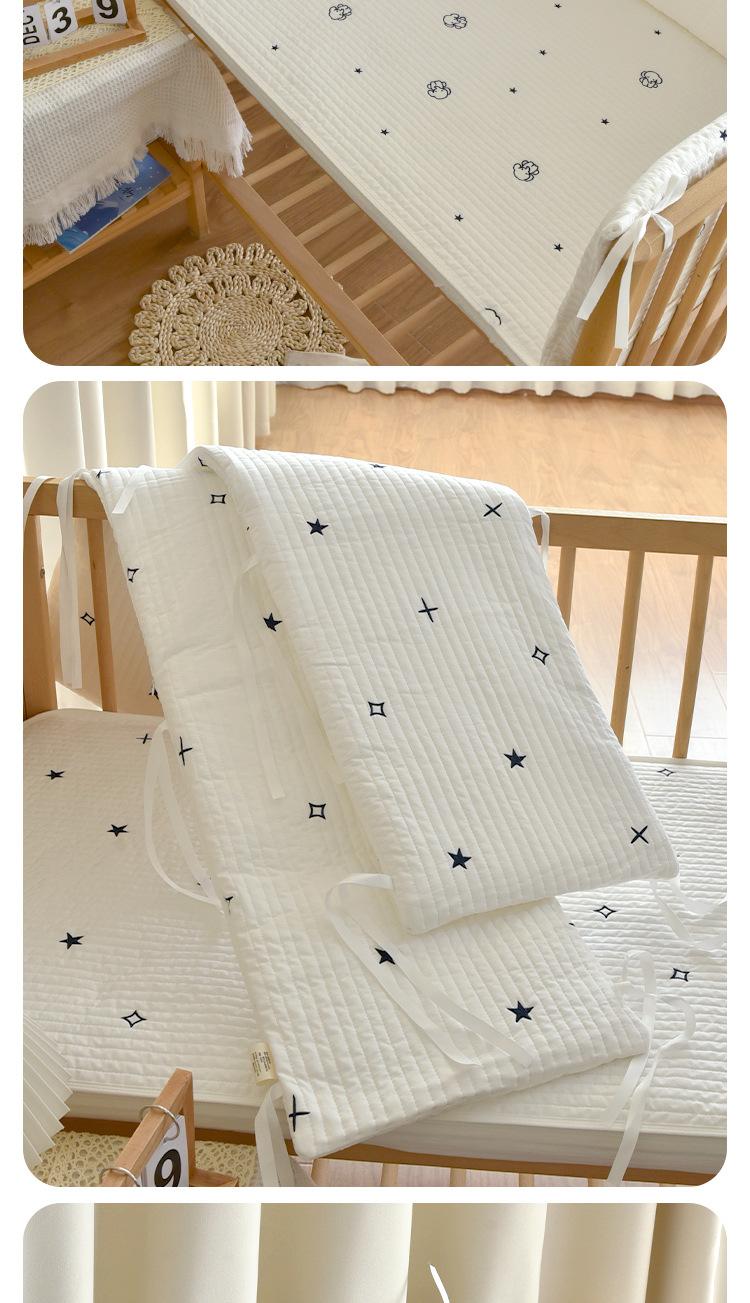 Protector de cuna anticolisión de una pieza para bebés Tejido de algodón lavado puro seleccionado, tacto delicado. Forro grueso y suave para evitar golpes y evitar que las manos y los pies se atasquen. Diseño de cremallera oculta, no es fácil que raye al bebé y es fácil de limpiar. Protección integral, fijación con correas, bordado exquisito, calidad Clase A