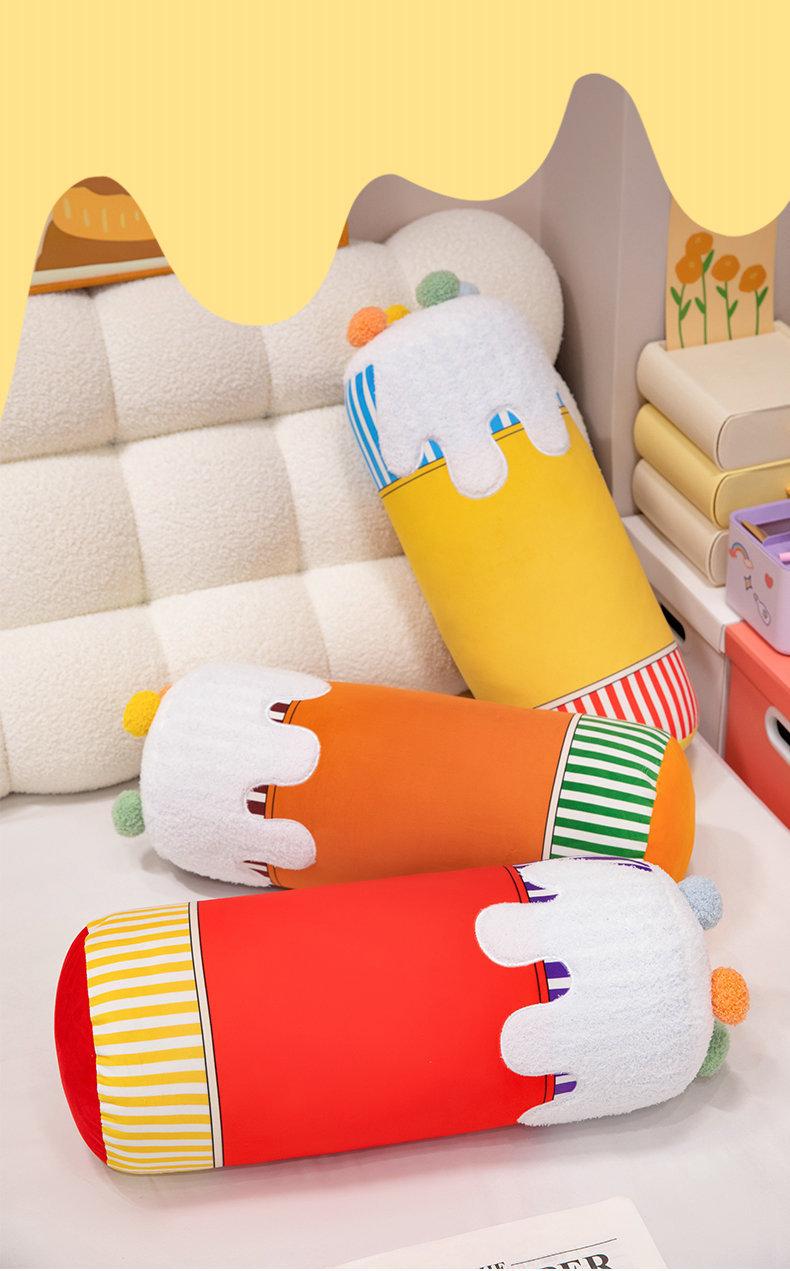 Red cream cylindrical pillow, Orange cream cylindrical pillow, Yellow cream cylindrical pillow