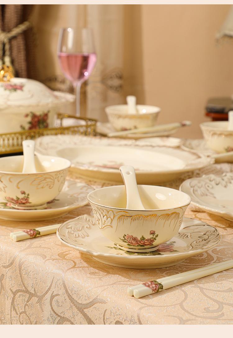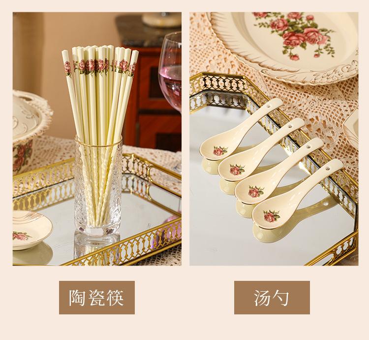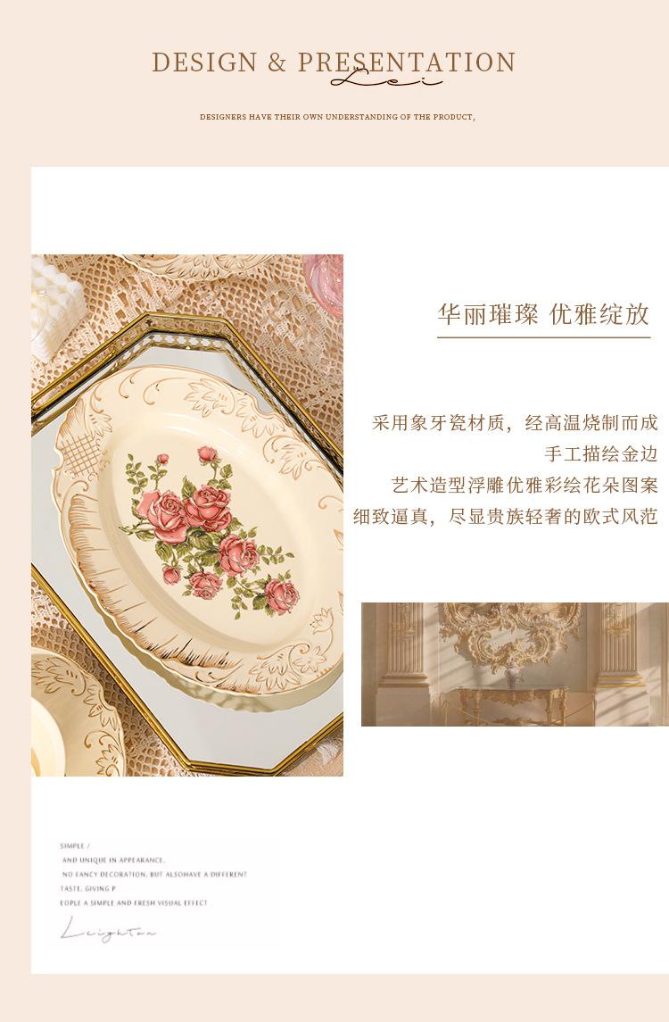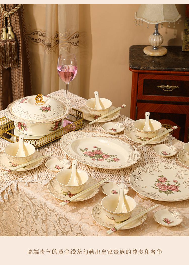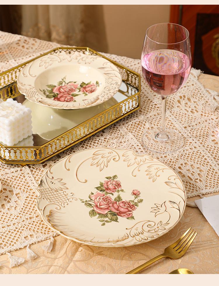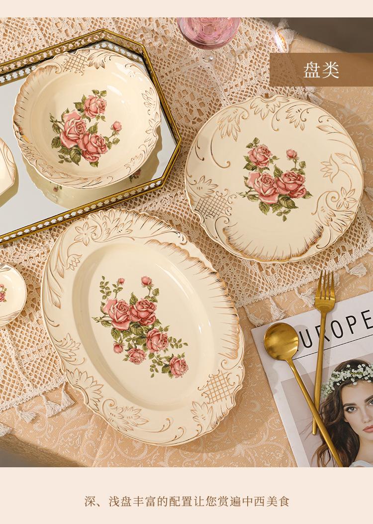 Vajilla de cerámica de estilo europeo con borde dorado, plato de cerámica rosa pintado en oro, plato de olla oscura, plato de fruta, tazón de arroz, plato de olla oscura