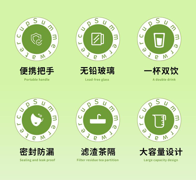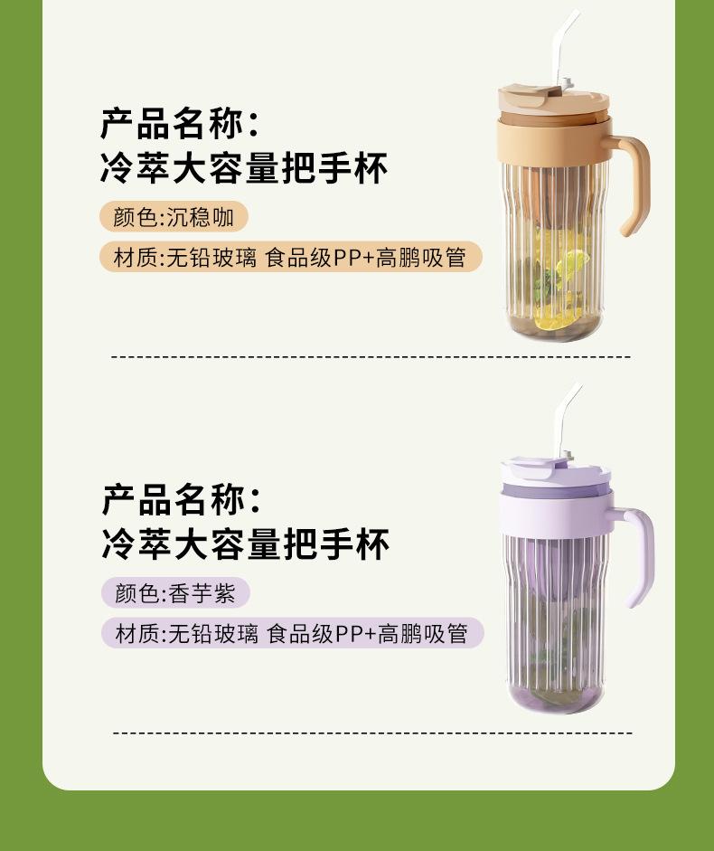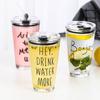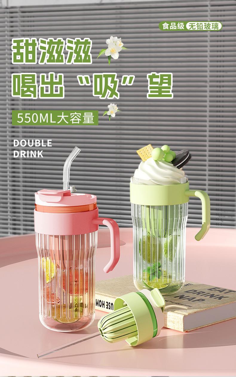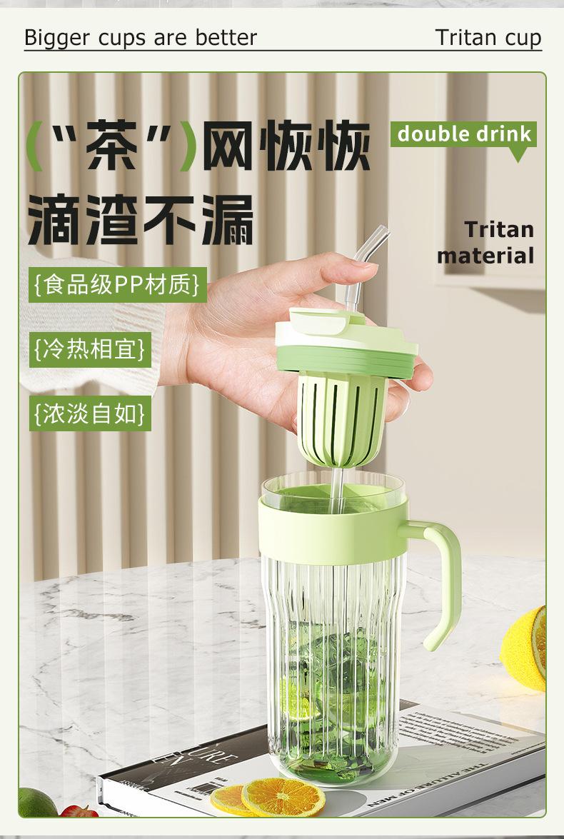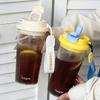 Taza de extracción de agua fría con asa de verano, vaso de agua con pajita de gran capacidad, vidrio engrosado con tapa, taza portátil para separar agua de té y bebidas dobles.