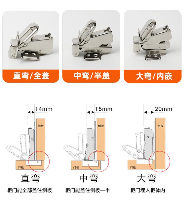 180 degree large angle hinge (full cover = straight arm), 180 degree large angle hinge (half cover = middle be...