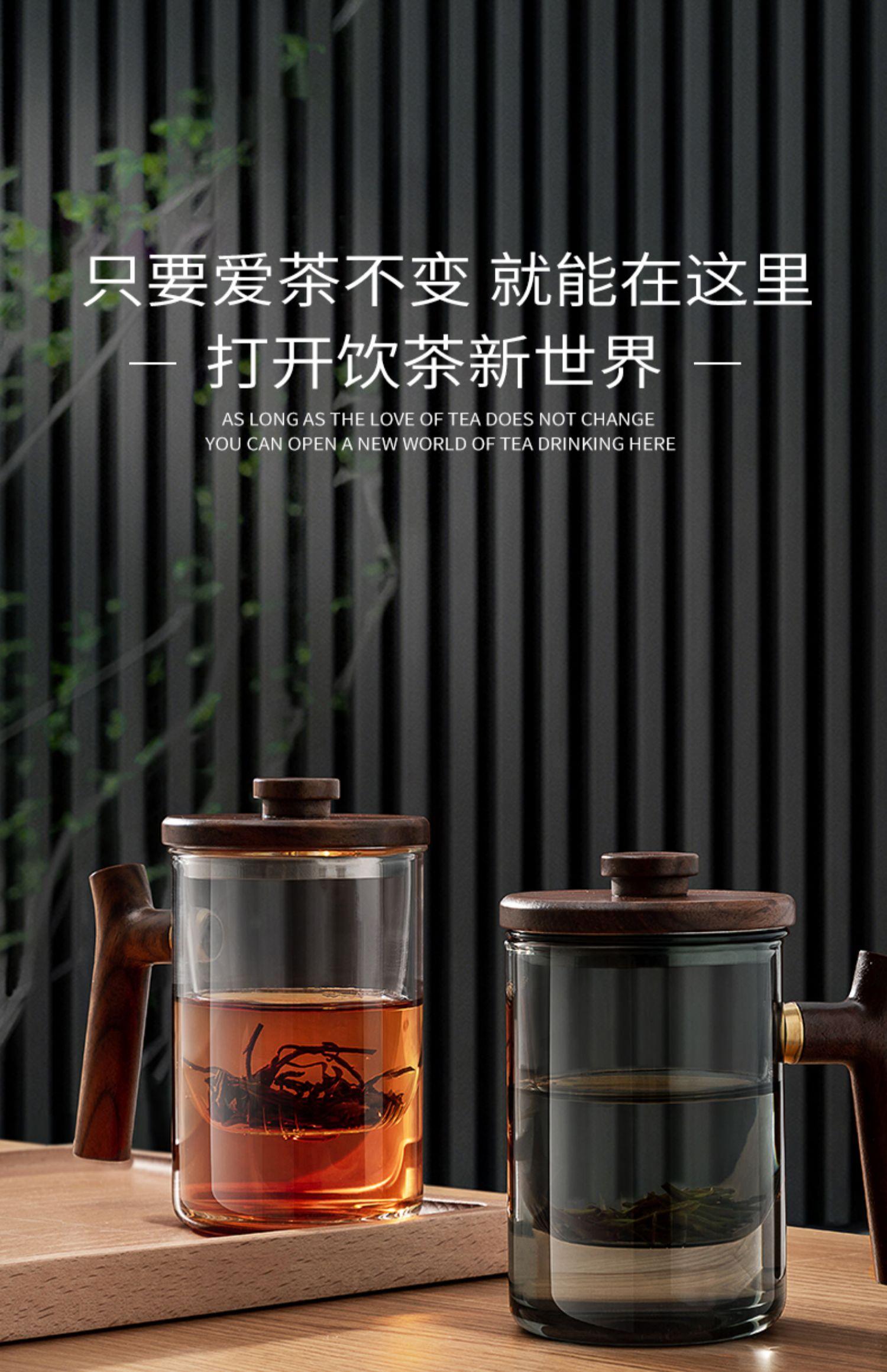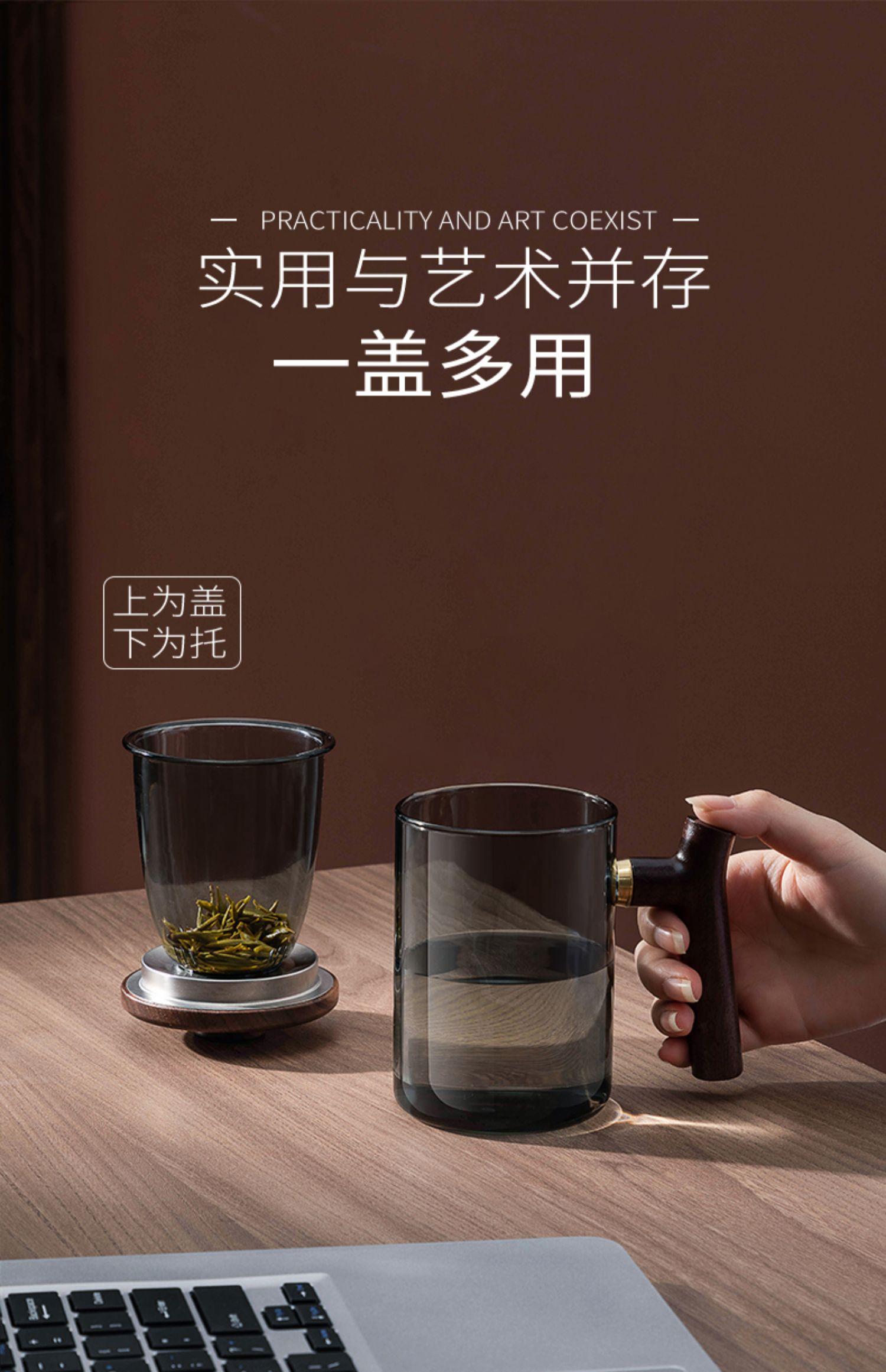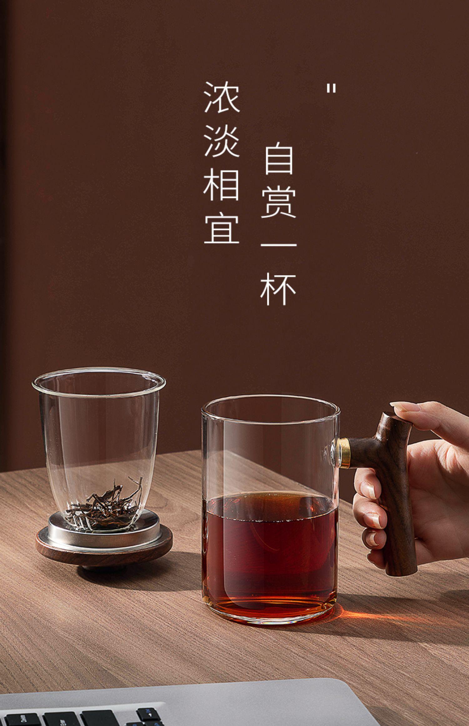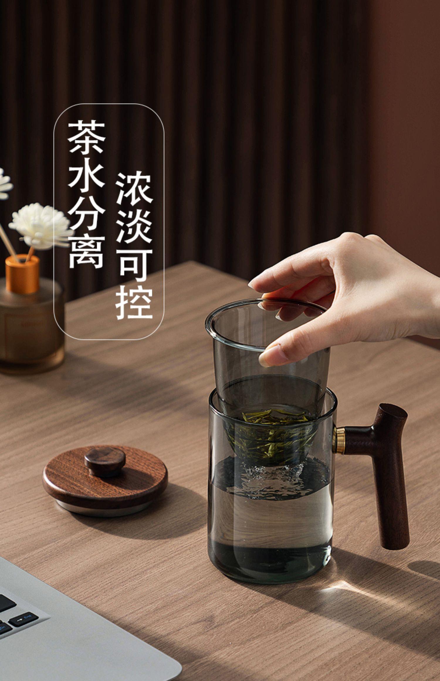 Taza de té de vidrio A6L con filtro, taza de té con separación de agua, taza de ceremonia de té Kung Fu, taza de oficina con mango de madera