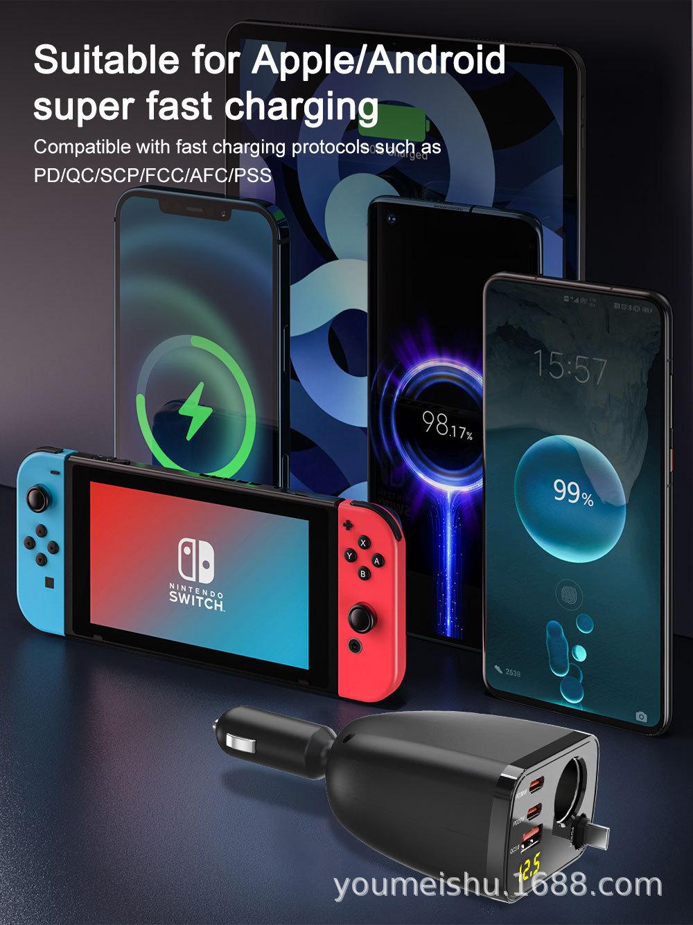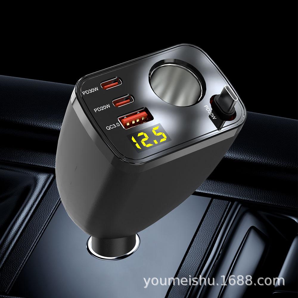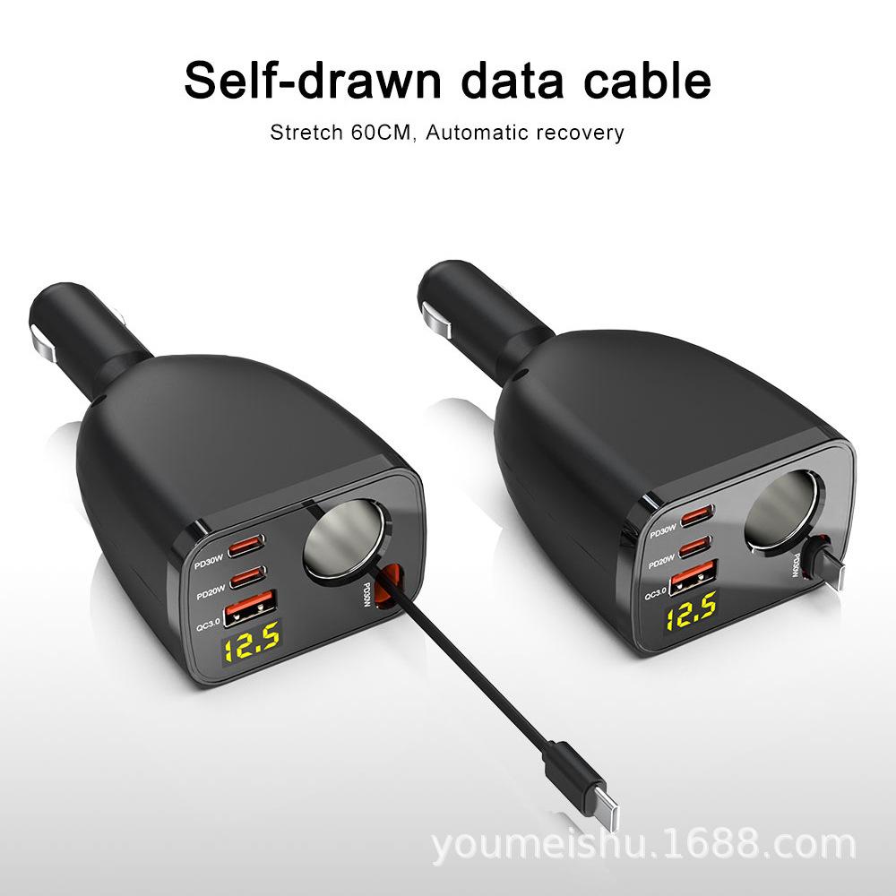 Encendedor de Cigarrillos Multifuncional Pantalla Digital Cargador de Coche Cable Carga Superrápida Pd30W Cable Retráctil Cargador de Coche Cuatro en Uno