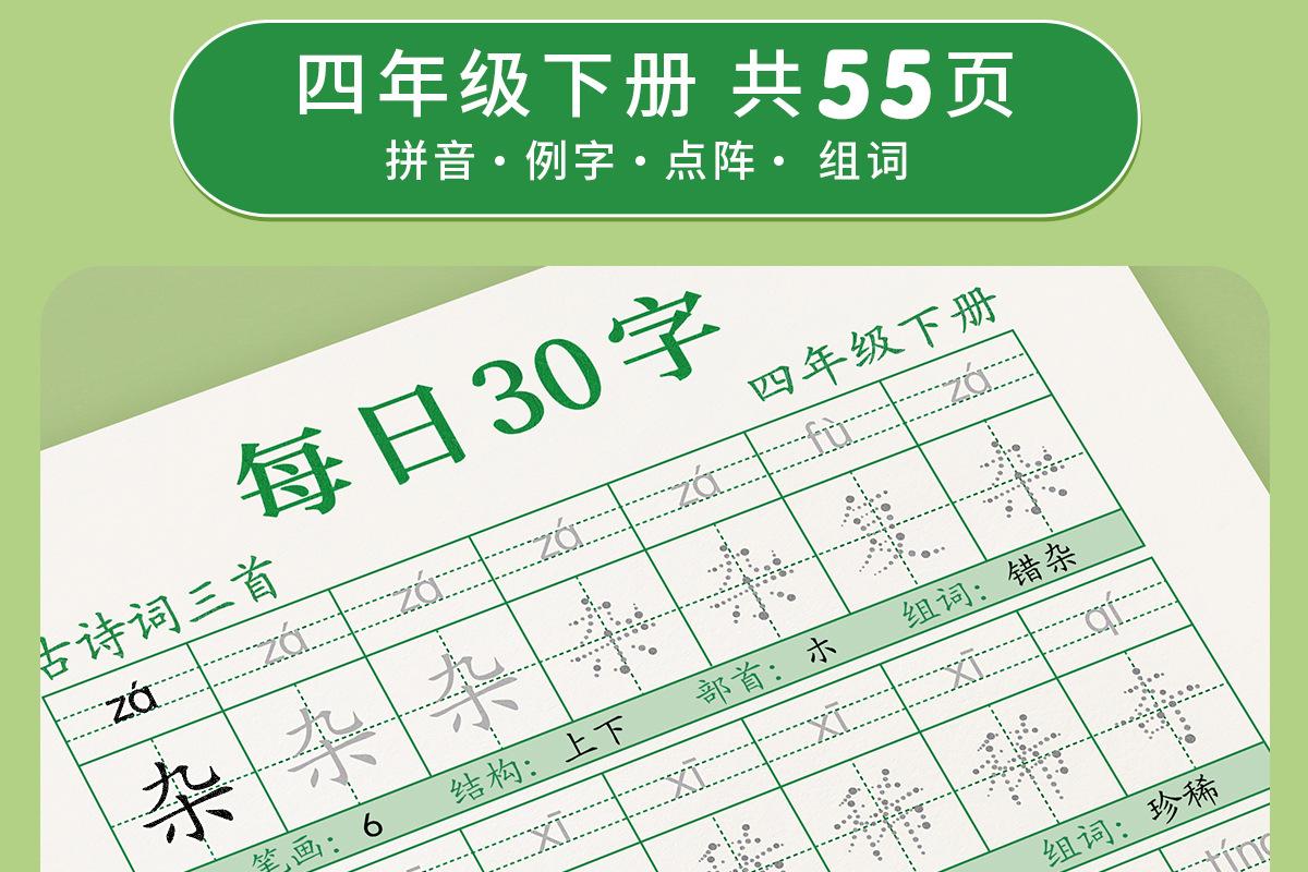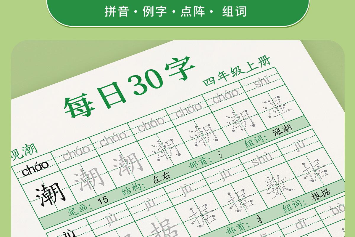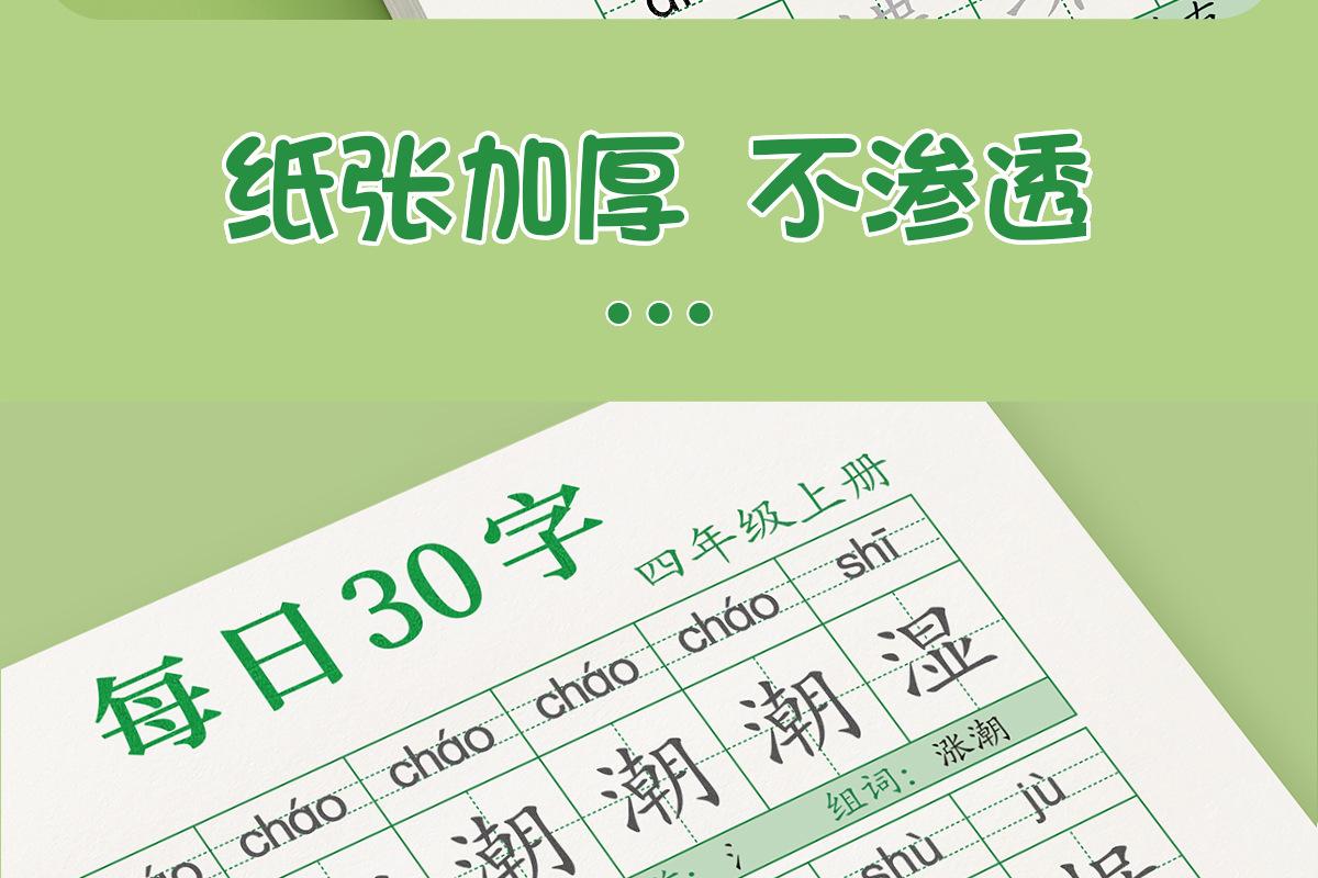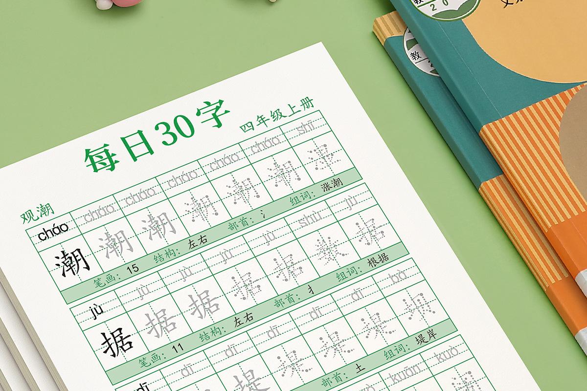 En cuarto grado, los cuadernos de práctica de volúmenes superiores e inferiores, la Edición de Educación Popular China, cuadernos sincrónicos, practican 30 palabras al día para estudiantes de escuela primaria.