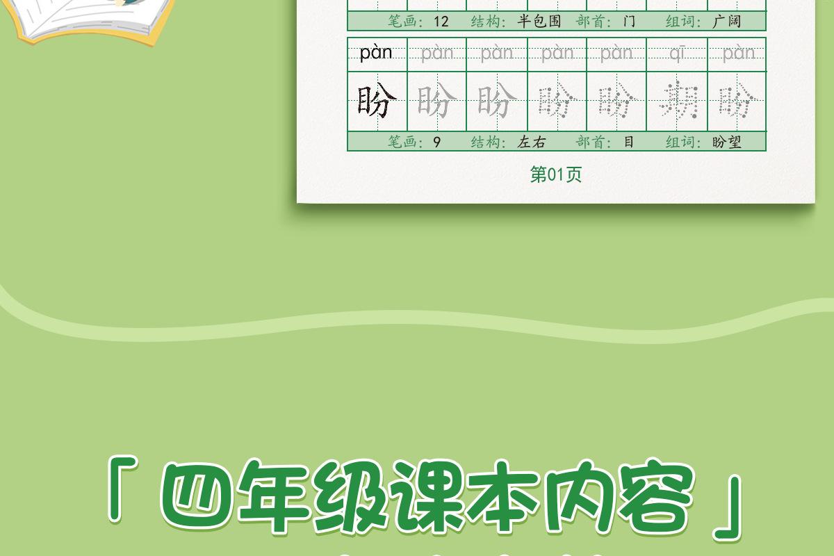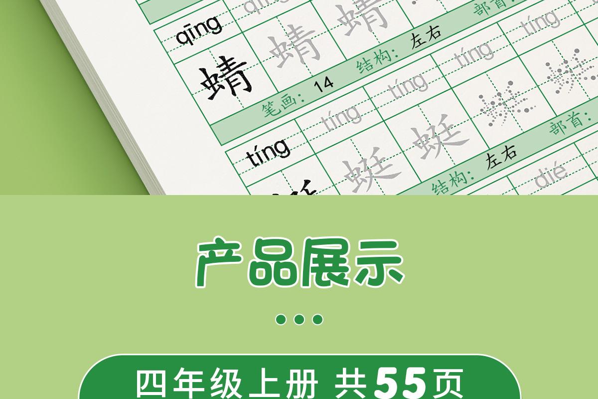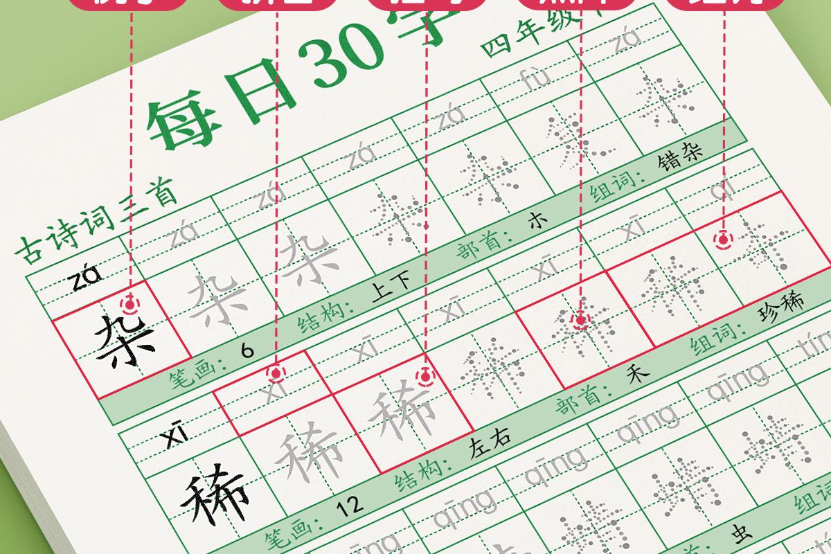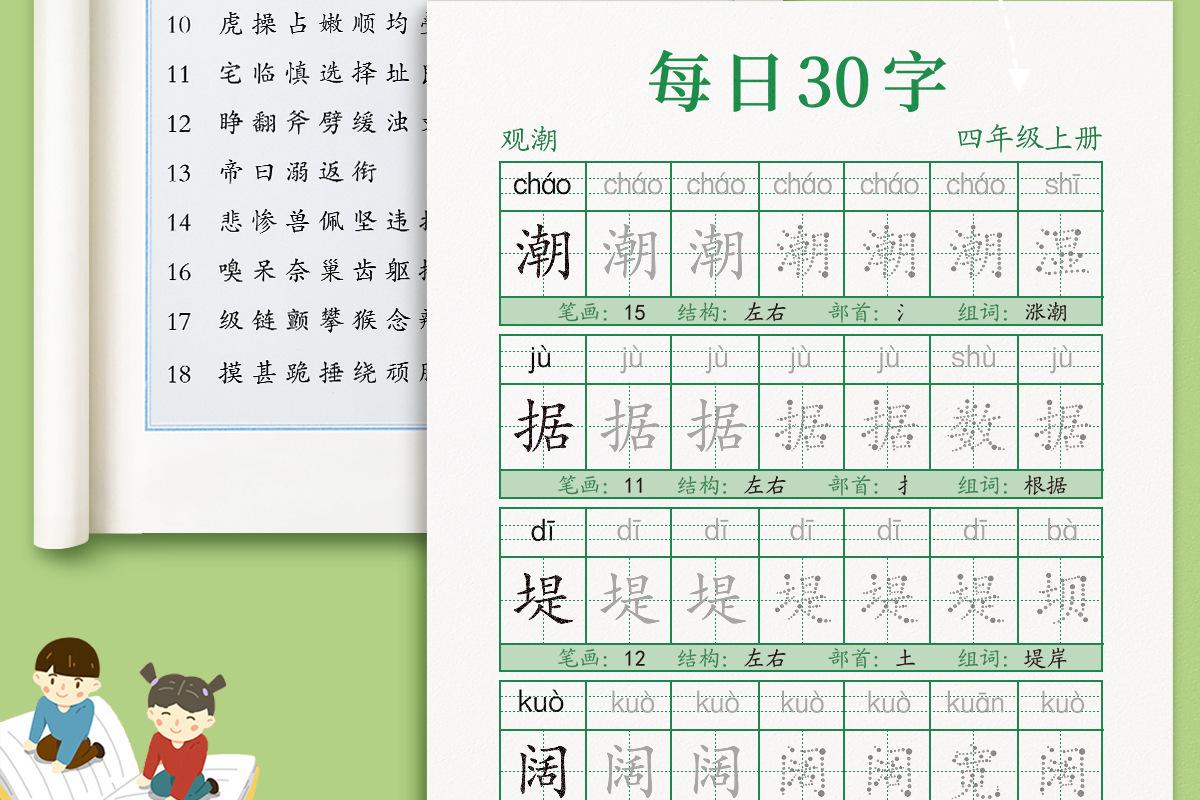 En cuarto grado, los cuadernos de práctica de volúmenes superiores e inferiores, la Edición de Educación Popular China, cuadernos sincrónicos, practican 30 palabras al día para estudiantes de escuela primaria.