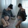 Gray pullover sweater g + black satin suspenders + gray underwear + gray mid-calf socks