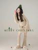 White v-neck sweater + coffee line pants + light brown mid-calf socks