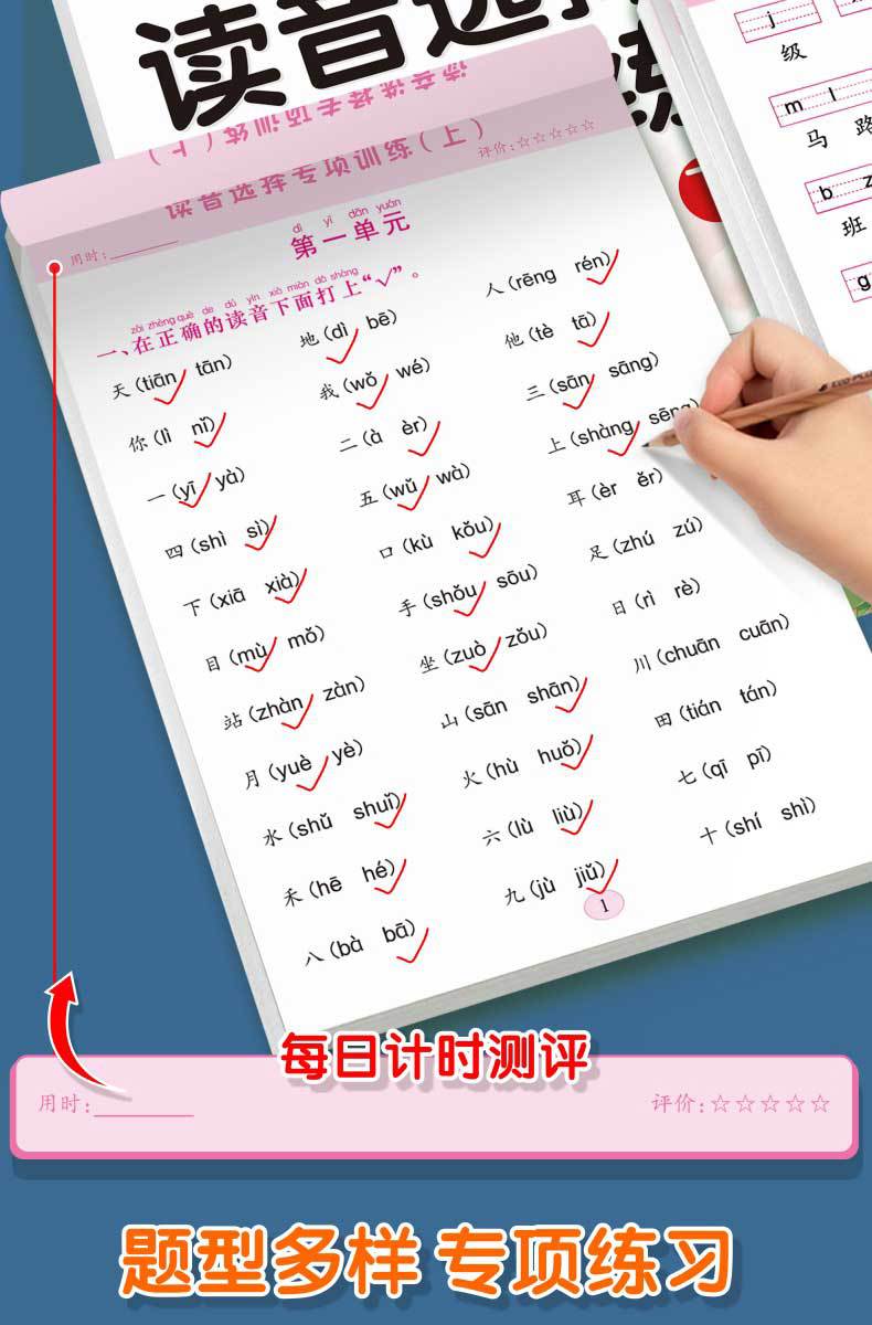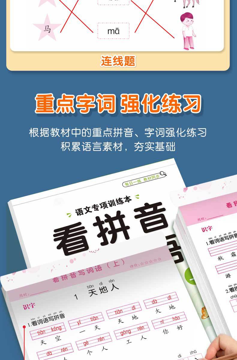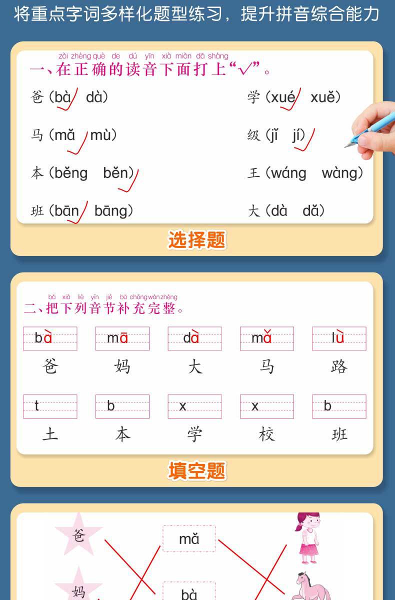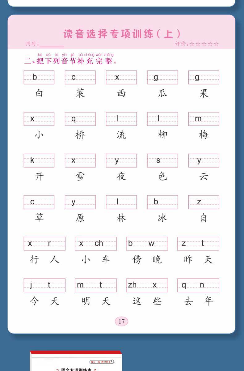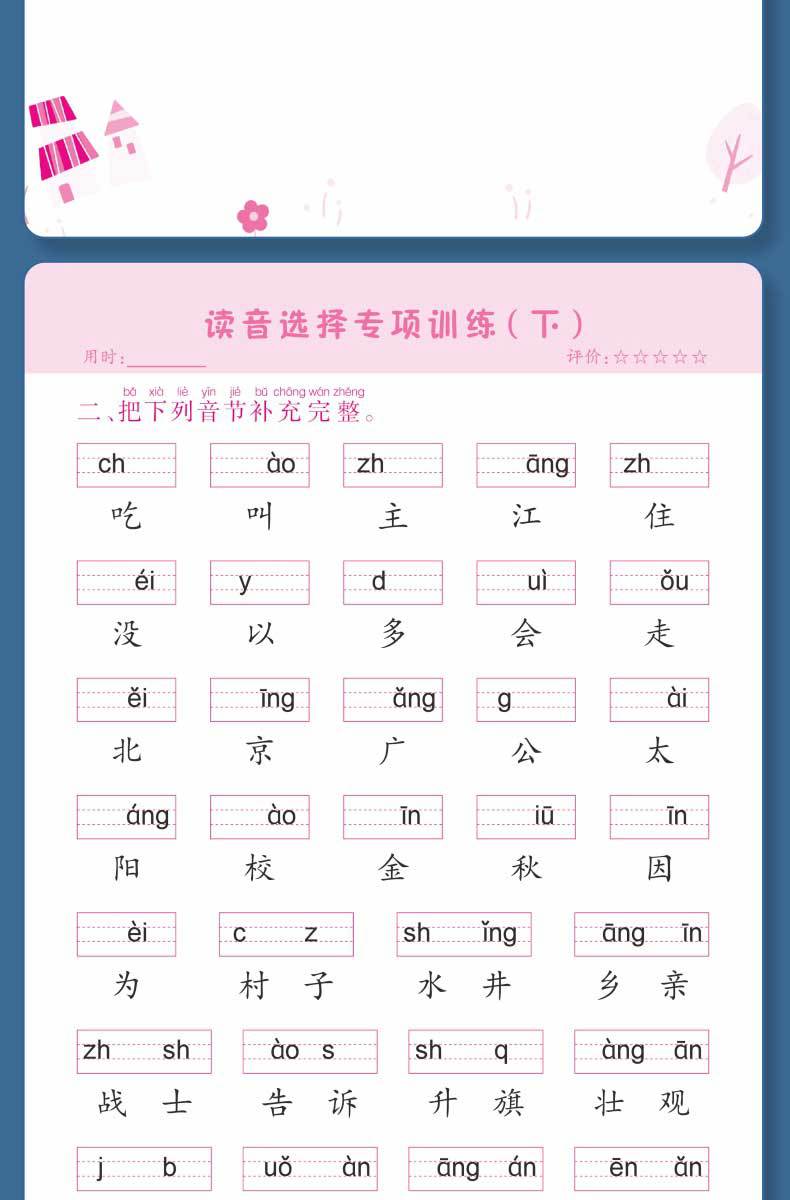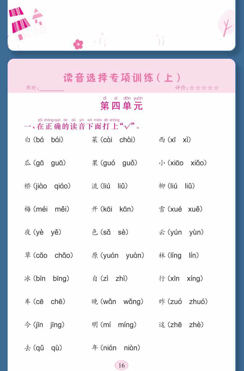 Libro de entrenamiento especial en chino: Mira las palabras de escritura en pinyin, selección de pronunciación, entrenamiento especial, entrenamiento fonético en pinyin de primer grado