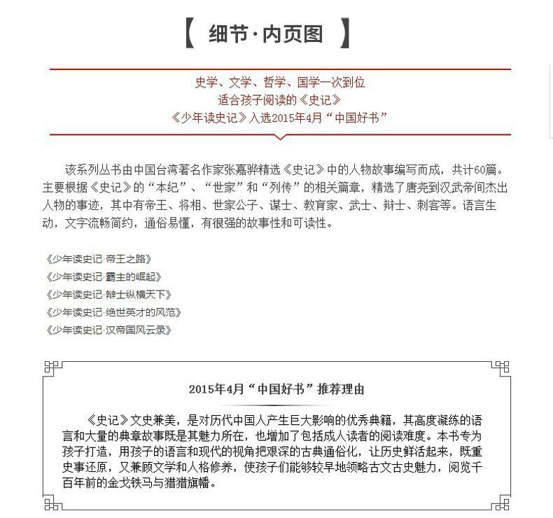 Esta serie de libros está compilada por el famoso escritor taiwanés Zhang Jiahua, quien seleccionó historias de personajes de los "Registros del Gran Historiador", con un total de 60 artículos. Basándose principalmente en los capítulos relevantes de los "Anales Básicos", "Historias Familiares" y "Biografías" de los "Registros del Gran Historiador", selecciona las hazañas de figuras destacadas desde Tang Yao hasta el Emperador Wu de Han, incluyendo emperadores, generales, hijos de familias aristocráticas, consejeros, educadores, guerreros, debatientes, asesinos, etc. El lenguaje es vívido, el texto es fluido y sencillo, fácil de entender, y tiene una fuerte narratividad y legibilidad.