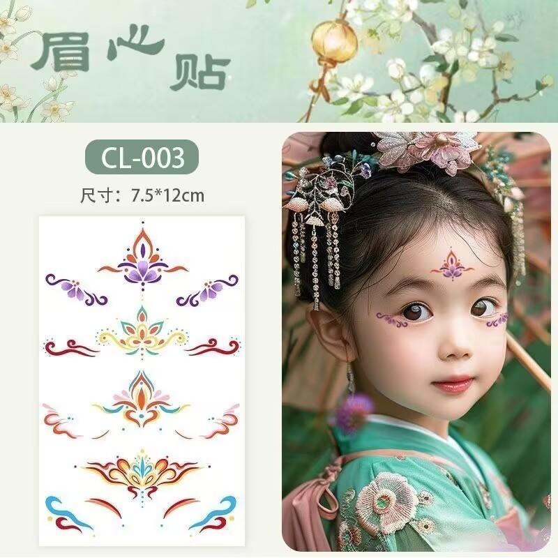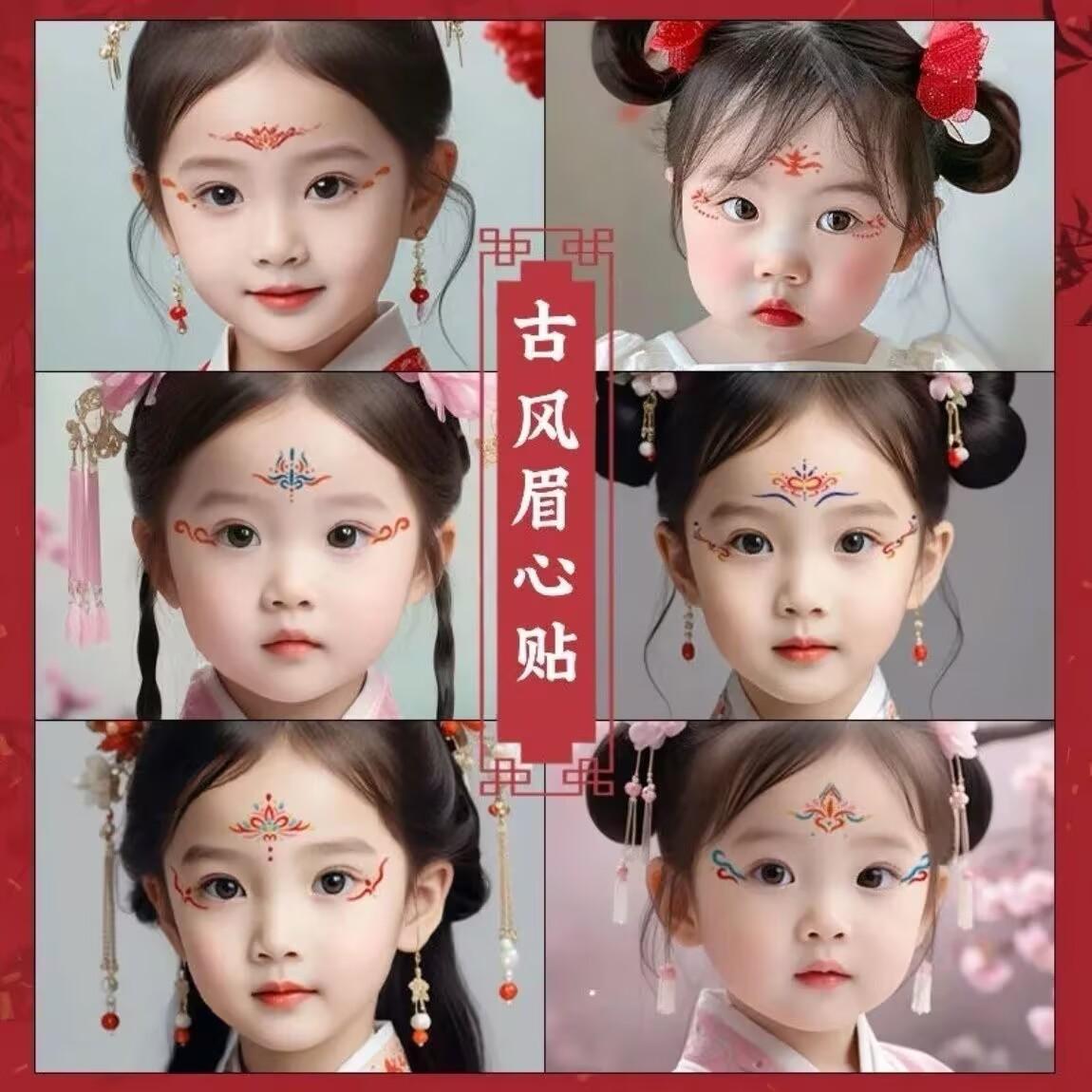 Pegatinas para cejas de niños, pegatinas para la frente con ropa china, pegatinas para el rendimiento de la actividad, pegatinas antiguas para la frente de niños y niñas, pegatinas de tatuaje con impresión impermeable