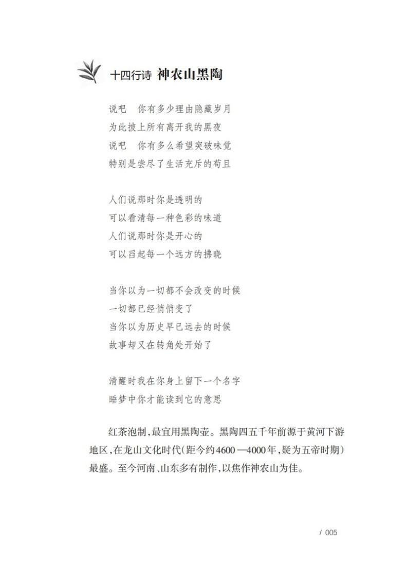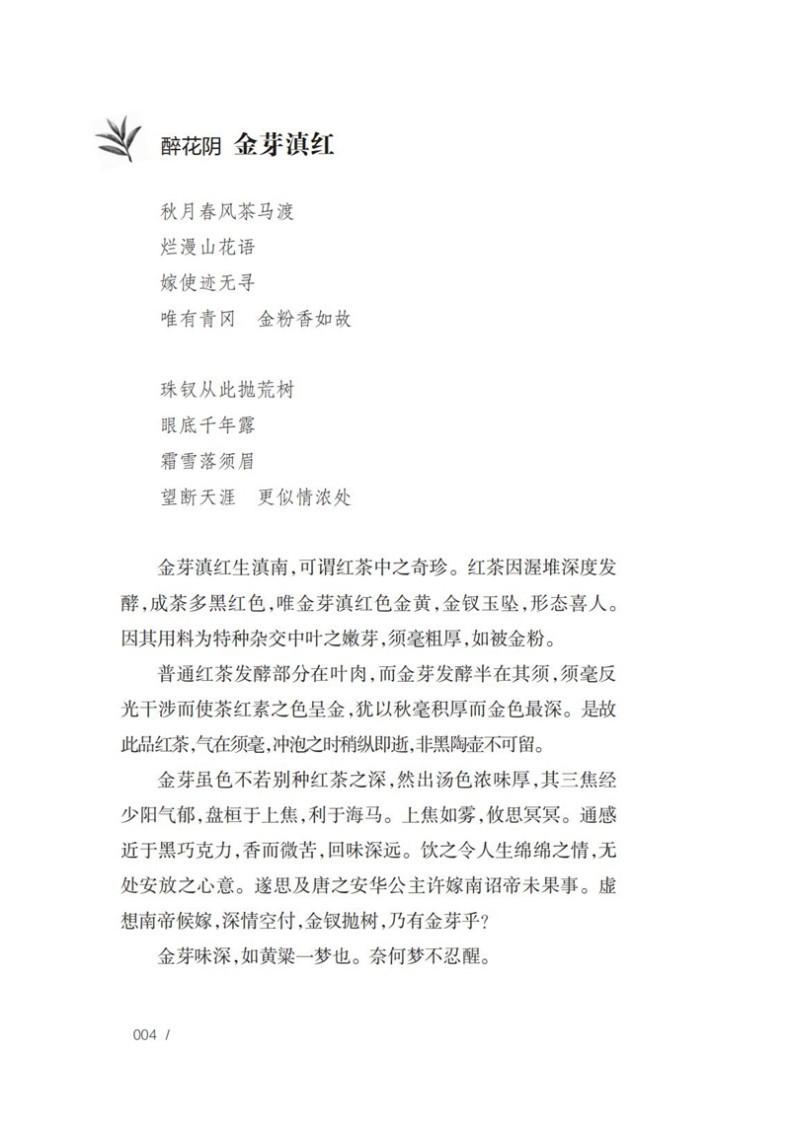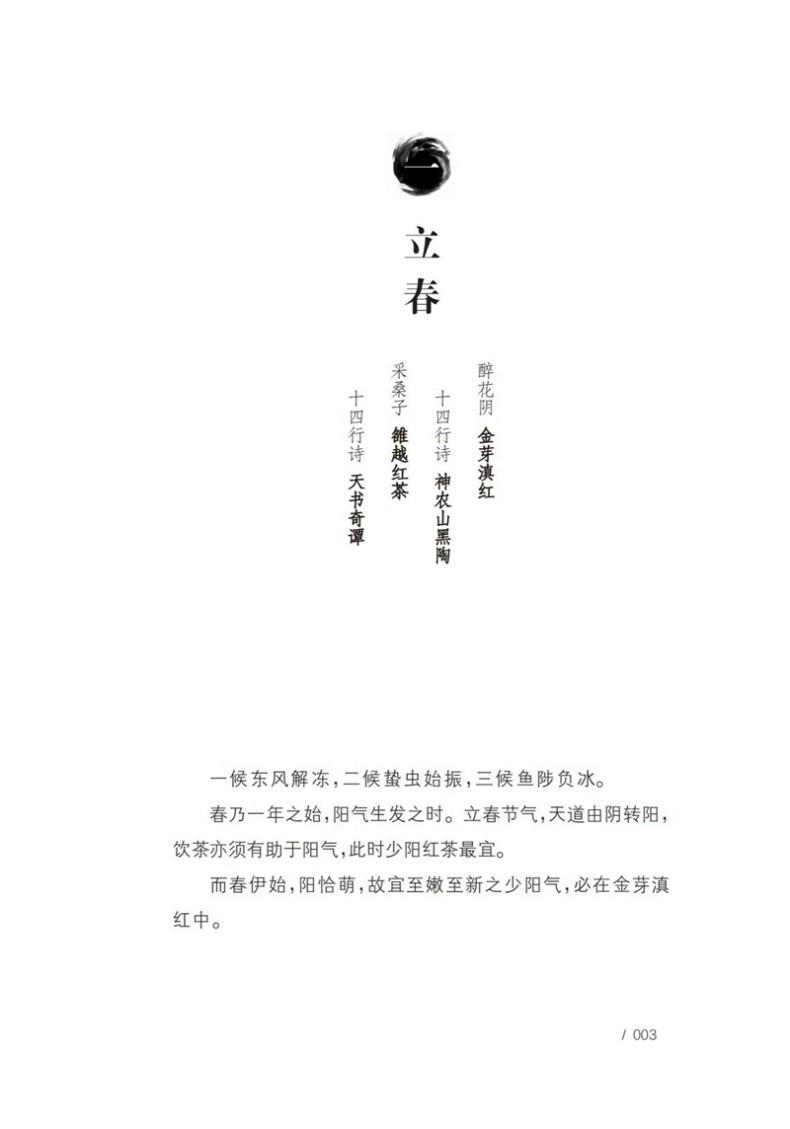 ●003 El Comienzo de la Primavera/ Sombra de Flor Ebria Brote Dorado Dianhong/ Soneto Cerámica Negra Shennongshan/ Caisangzi Luoyue Té Negro/ Soneto Libro Celestial 011 Er Yushui/ Soneto Zhengshan Xiaozhong/ Xiaochongshan Zhengshan Xiaozhong/ Cuarteta de cinco caracteres Seis tazas de té· Bebiendo a medianoche/ Bu Suanzi Tongmuguan Silvestre Shan Xiaozhong/ Mariposa Amor Flor Dianhong Gongfu 021 Tres Despertares/ Cinco Maravillas Té Negro de Zunyi/ Cinco Maravillas Bola de Dragón Árbol Antiguo Rojo 027 El Cuarto Equinoccio de Primavera/Cielo Perdiz Montaña Bonan Dianhong/Soneto Camino Antiguo Bonan 033 Cinco Festivales Qingming/ Un Joven Visita Ladrillos de Oro Junshan/ Soneto Ladrillos de Oro Junshan 039 Seis Guyu/ Cuarteto de cinco sílabas Té de Peonía Blanca/ Soneto Montaña Taimu Peonía Blanca/ Soneto Guyu (Parte 1)/ Soneto Guyu (Parte 2)/ Soneto Guyu (Parte 3) 047 Séptimo Comienzo del Verano/ Soneto Biluochun/ Ding Fengbo Biluochun en el Año de Gengzi/ Cuarteta de cinco caracteres Seis Tazas de Té·Bebida Matutina 053 Ocho Xiaoman/ Poema de cinco caracteres: Degustando té Longjing en Shifeng/ Soneto: Mañana temprano en el mar/ Machacando Lianzi Xiangshan Tianming/ Poema de siete caracteres: Songwu Yiye 063 Nueve Granos/Dou Lianzi Qianlu 067 Solsticio de Verano/ Rama de Sauce Verde Rey Mono Taiping/ Orquídea Pequeña Shucheng de Cinco Líricas 073 El undécimo día del calor de verano / Embriagado por las flores, Huangya de Huoshan / Cinco cuartetos y seis tazas de té · Bebida de la tarde 079 Los Doce Grandes Calores/ Nian Nu Jiao Degustando Té Aguja de Plata Solo en el Gran Calor/ Shengchazi Montaña Taimu Brotes de Nieve Verde Degustando Té Blanco Té Aguja de Plata por la Noche/ Soneto Té Blanco de la Abuela/ Cuarteto de cinco caracteres Seis Tazas de Té· Bebida del Mediodía 087 Decimotercer Comienzo de Otoño/ Tieguanyin de Siete Líneas/ Qingpingle Bebiendo Oolong Jibian con Mi Hijo por la Noche/ Taza Hoja de Loto Fanjingqing/ Cinco Líneas Té de Árbol Antiguo de Fanjingshan 097 Decimocuarto Día del Final del Calor/ Soneto Wukui Tianhu/ Nangezi Fenghuang Dancong/ Cuarteta de siete caracteres Dancong Hoja de Bambú/ Cuarteta de siete caracteres Oolong Patas Cortas 105 El 15º Rocío Blanco/ Bodhisattva Manyan Concubina Fragante/ Soneto Dahongpao/ Soneto Ruiquan Shengjiang/ Cuarteto de cinco caracteres Seis Tazas de Té·Yanyin/ Jiuquanzi Laocong Narciso 115 Equinoccio de Otoño/ Ding Feng Bo Té Verde Qilu/ Pusa Man Árbol Antiguo Té Verde Puer 123 Diecisiete Rocíos Fríos/Luna Qinlou Lingote de Oro 129 Dieciocho Heladas/Bu Suanzi Pera Nieve Aguja de Plata 135 El 19º Comienzo del Invierno/ Sheng Sheng Man Xiang Rui Hao Shu Pu Wan/ Wu Lu Noche de Luna de Hierro Negro/ Wu Jue Seis Tazas de Té·Bebida Nocturna 143 Veinte Nievecitas/ Té Rusai Liubao/ Sumuzhe Treinta Años Cáscara de Mandarina Puer 149 La 21ª Nieve/ Té Anhua Qianliang Xijiangyue/ Soneto Desolación Yongzhou/ Soneto Viejo Amigo Desconsolado/ Cuarteto de cinco caracteres 2004 Unión Taiwán picante Pu'er 159 Solsticio de Invierno/Recordando Viejos Amigos en Taoyuan Rima Antigua Chenxiang/Soneto Fruto de Hoja Mangjing/Soneto Zini 167 El 23º Frío Menor / Caisangzi Té Amarillo Recién Hecho Fanjinji / Soneto Artesanía Amarilla Apagada / Soneto Té Fanjinhuang / Jianzi Flor de Mulan Cata Ocasional Té Amarillo Antiguo de la Dinastía Qing 175 Los Veinticuatro Fríos/ Cuarteto de cinco caracteres 2008 Shoumei/ Taiping Borracho Shoumei/ Huanxisha Dawu Zimei/ Cuarteto de cinco caracteres Brote de Nieve Verde Prueba Nocturna Té Viejo 185 Apéndice: El Clásico de Tres Caracteres de la Ceremonia del Té