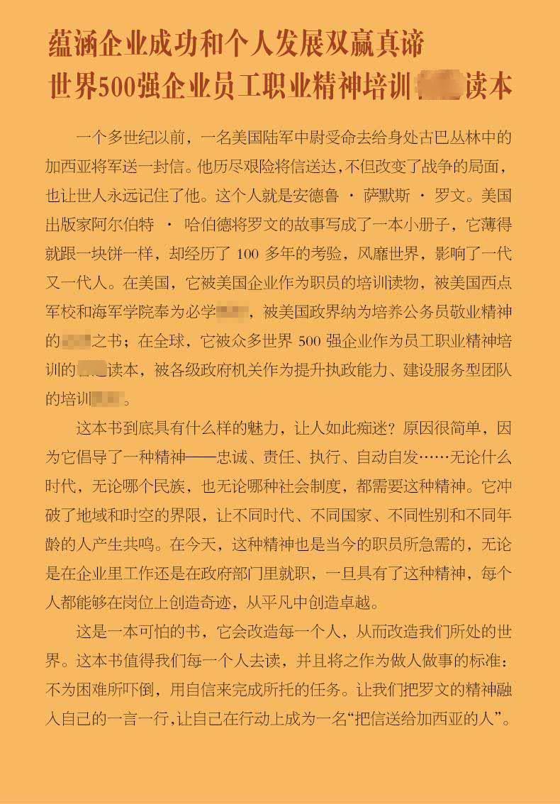 «Entregar la carta a García» fue una vez popular en todo el mundo y sigue siendo un superventas hoy en día. El protagonista del libro, Andrew Summers Rowan, se ha convertido desde hace mucho tiempo en un símbolo de lealtad, dedicación, diligencia y obediencia activa. Quizás dirías que en la era actual de originalidad e individualidad, sería un poco inapropiado que alguien sacara a relucir temas como «lealtad», «dedicación», «obediencia» y «crédito». Sin embargo, no hay duda de que aunque los tiempos cambian, el espíritu encarnado por Rowan nunca pasará de moda, porque representa los antiguos y hermosos valores que mantienen el desarrollo de la sociedad humana y promueven el progreso de la civilización. En realidad, para los dueños de negocios y los gerentes de empresa, la lealtad, la dedicación y los riesgos morales de los empleados siempre les están advirtiendo. Aunque el mundo en constante cambio ha traído a la gente muchas visiones hermosas, también se ha llevado muchas cosas valiosas, incluido el espíritu empresarial básico del que depende el desarrollo económico: lealtad, diligencia y dedicación.