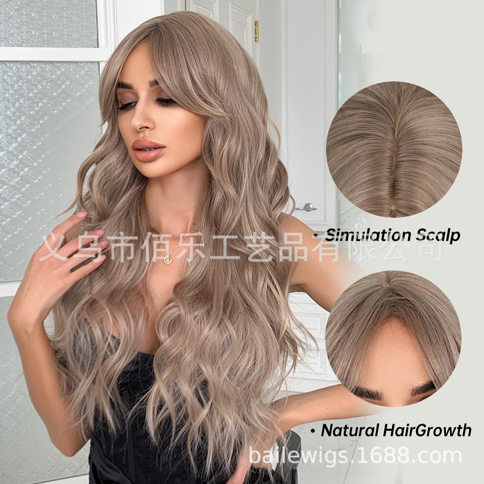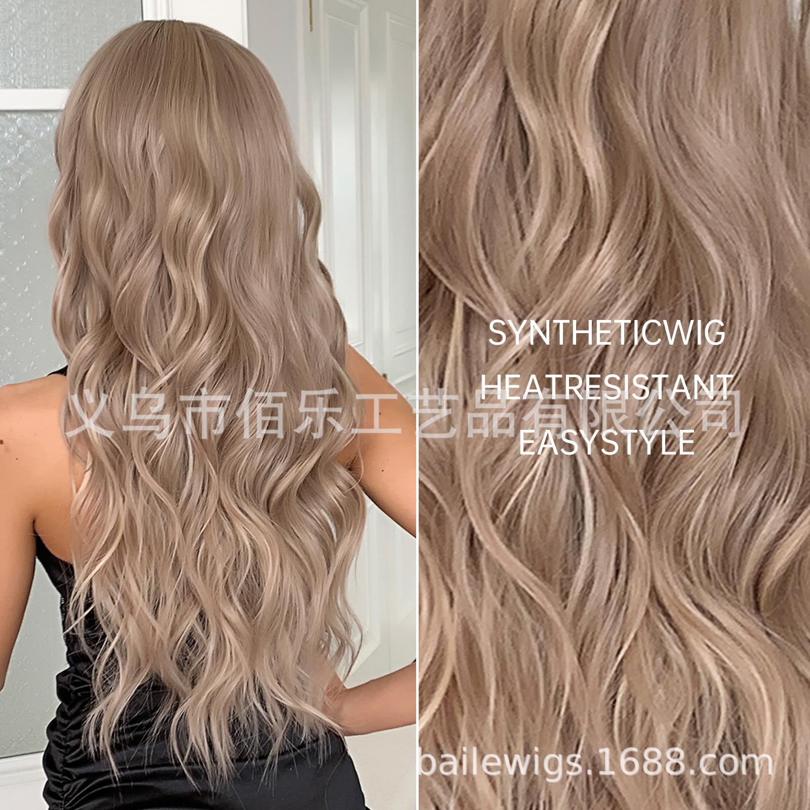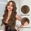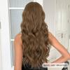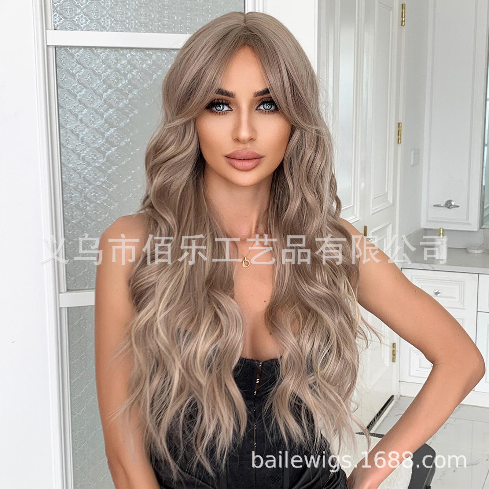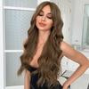 Peluca de viento europeo y americano con flequillo marrón oscuro onda grande cabello largo y rizado 28 pulgadas cobertura completa de cabeza peluca al por mayor de fábrica