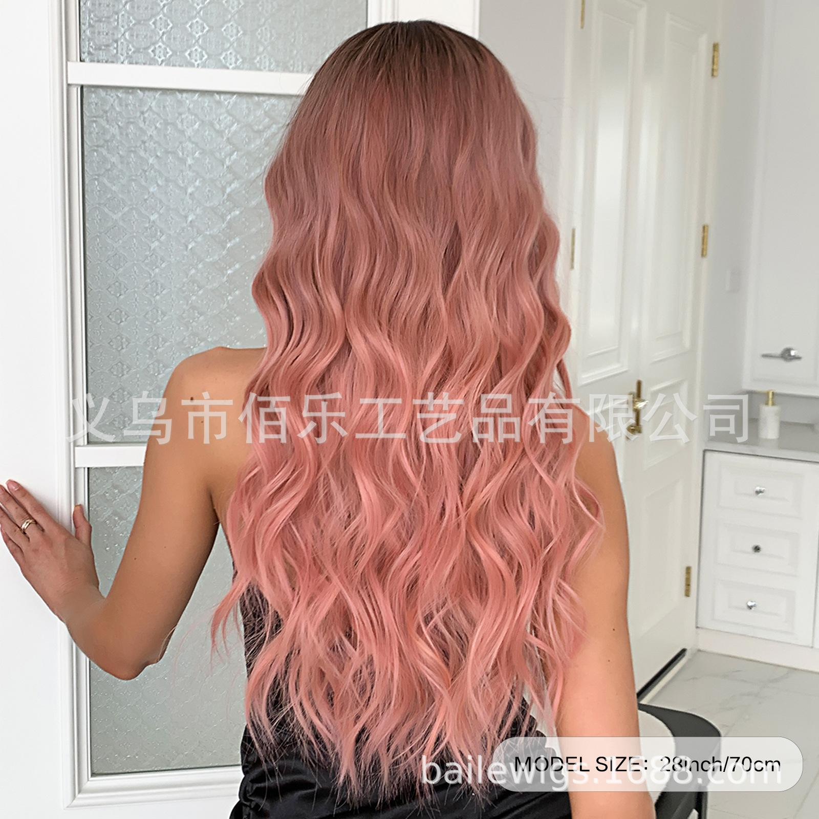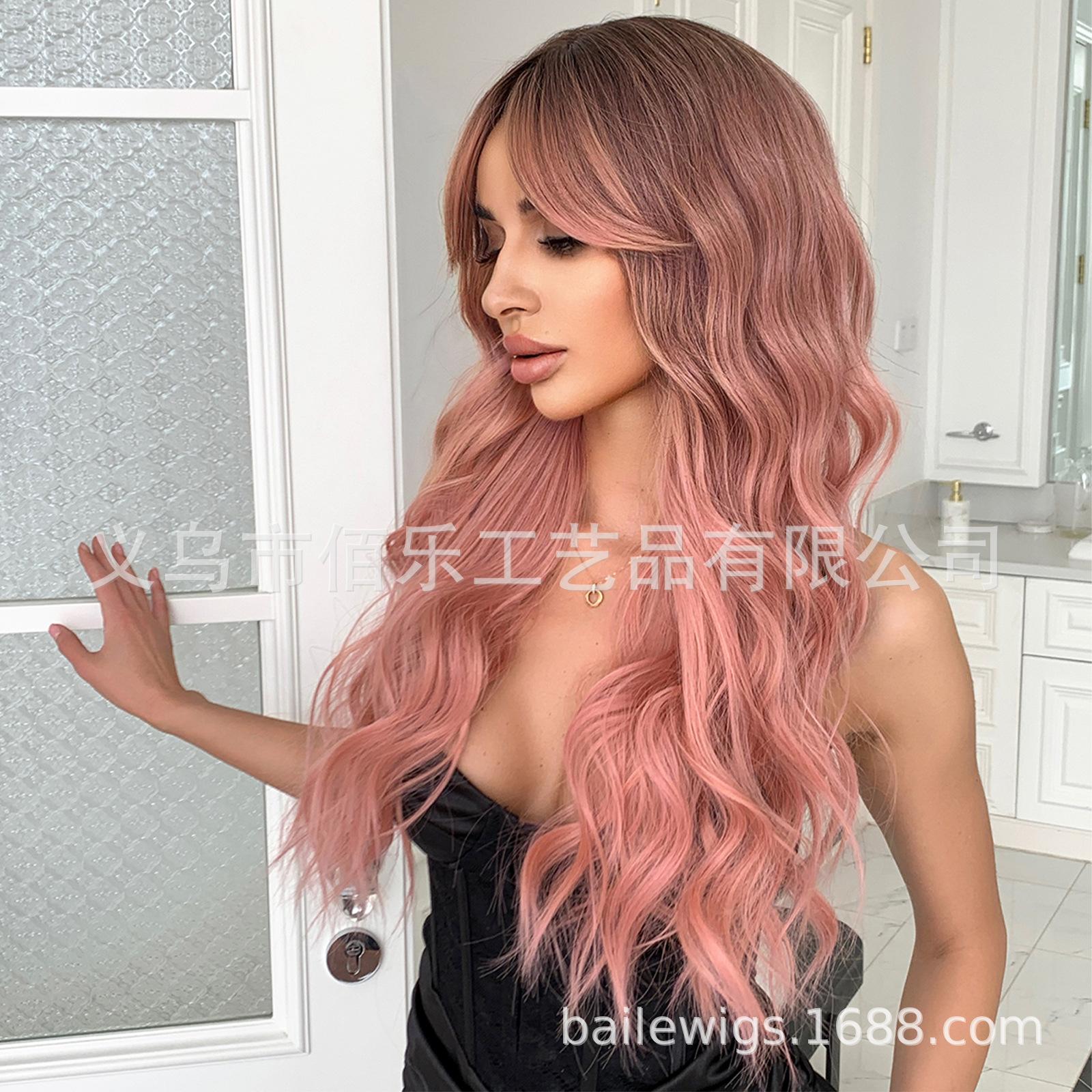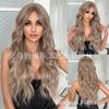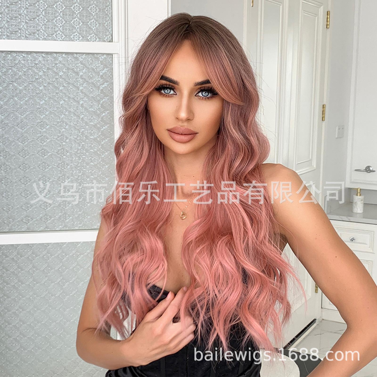Peluca de viento europeo y americano con flequillo marrón oscuro onda grande cabello largo y rizado 28 pulgadas cobertura completa de cabeza peluca al por mayor de fábrica