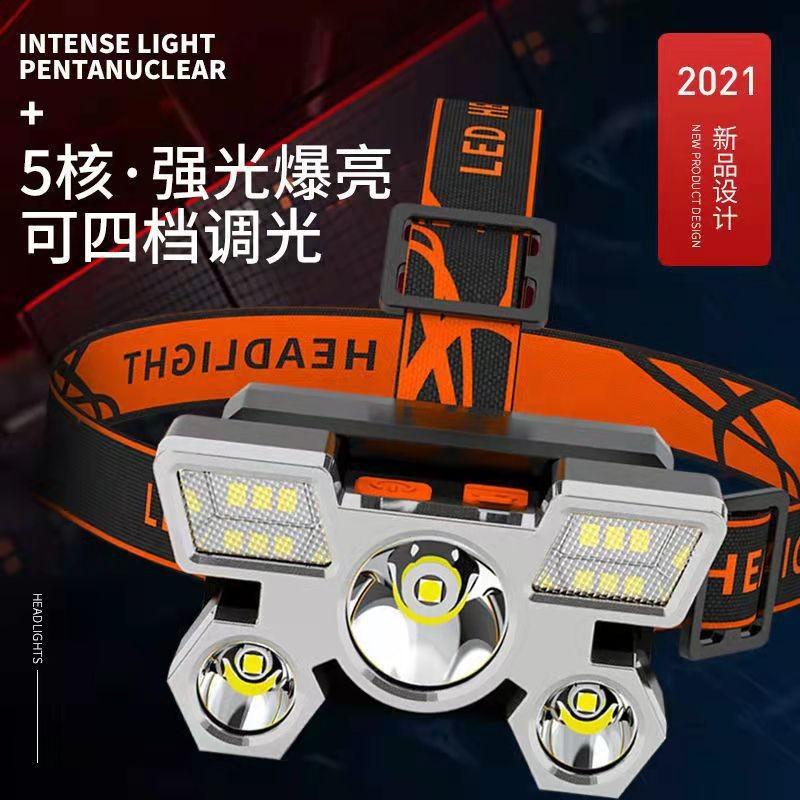 Nuevo y brillante faro LED transfronterizo de cinco cabezas, lámpara de avión, recargable por USB, pequeña linterna montada en la cabeza, lámpara de minero para exteriores.