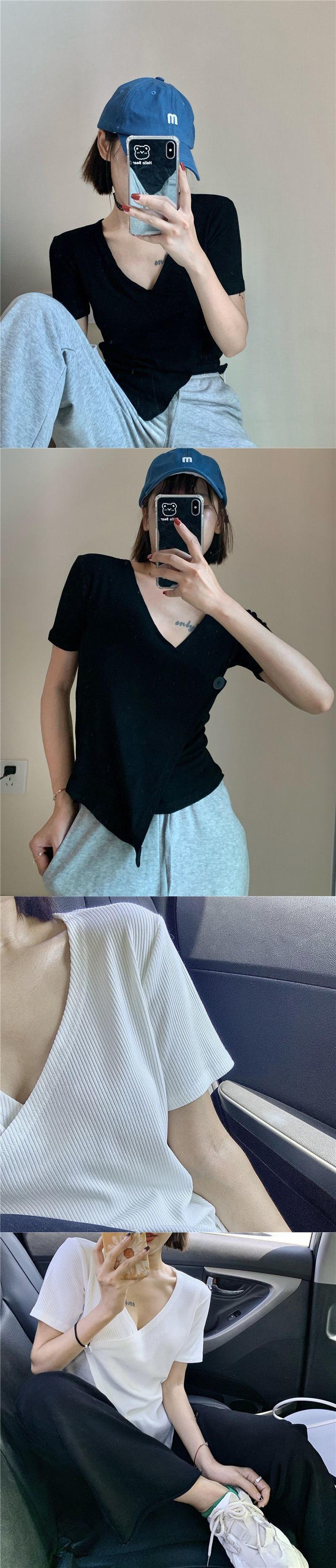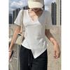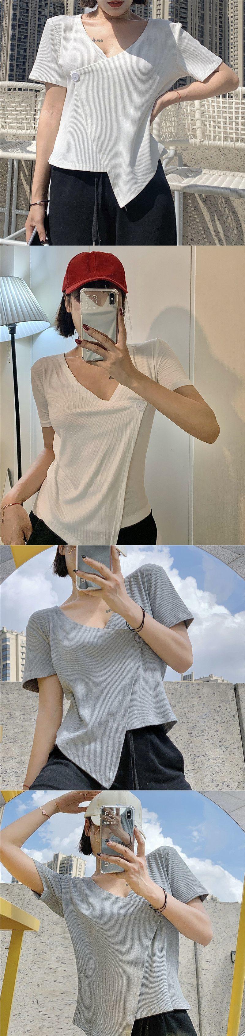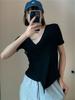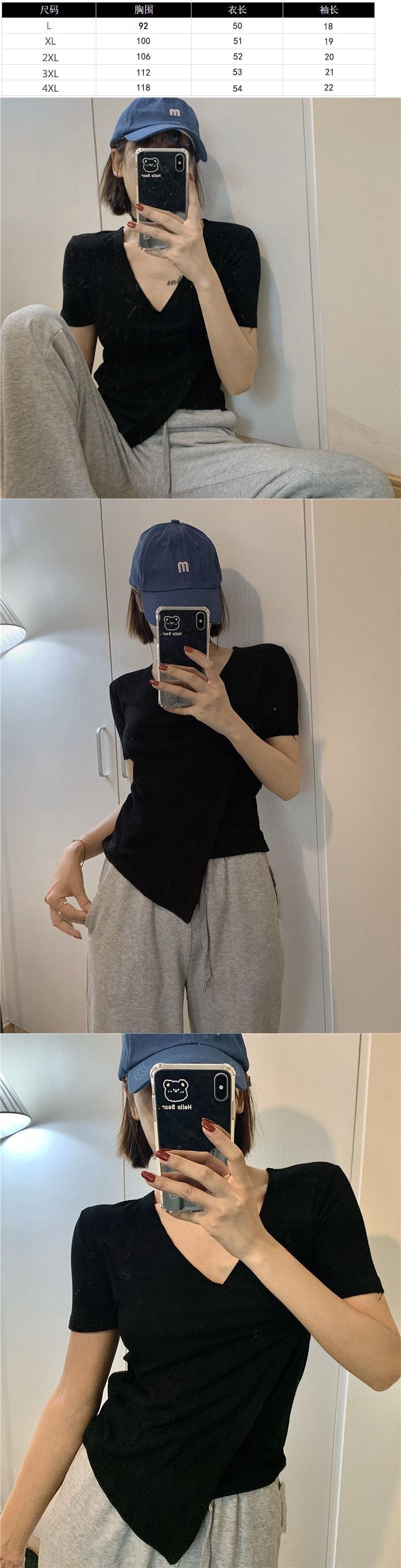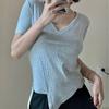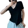 Camiseta de manga corta irregular súper genial para mujer, de seda de hielo, de verano, con diseño transfronterizo, estilo chic de nicho, con cuello en V, adelgazante.