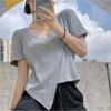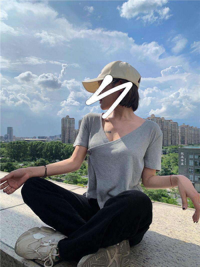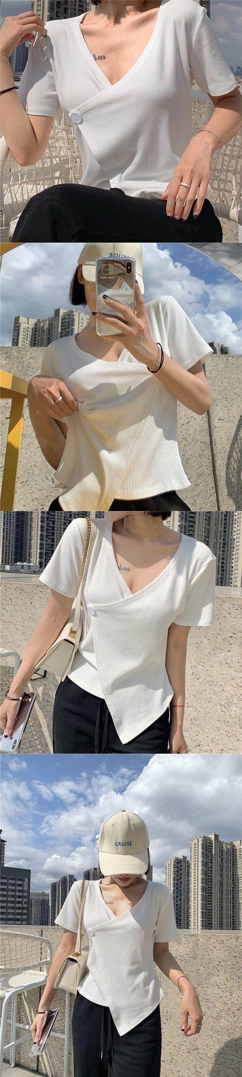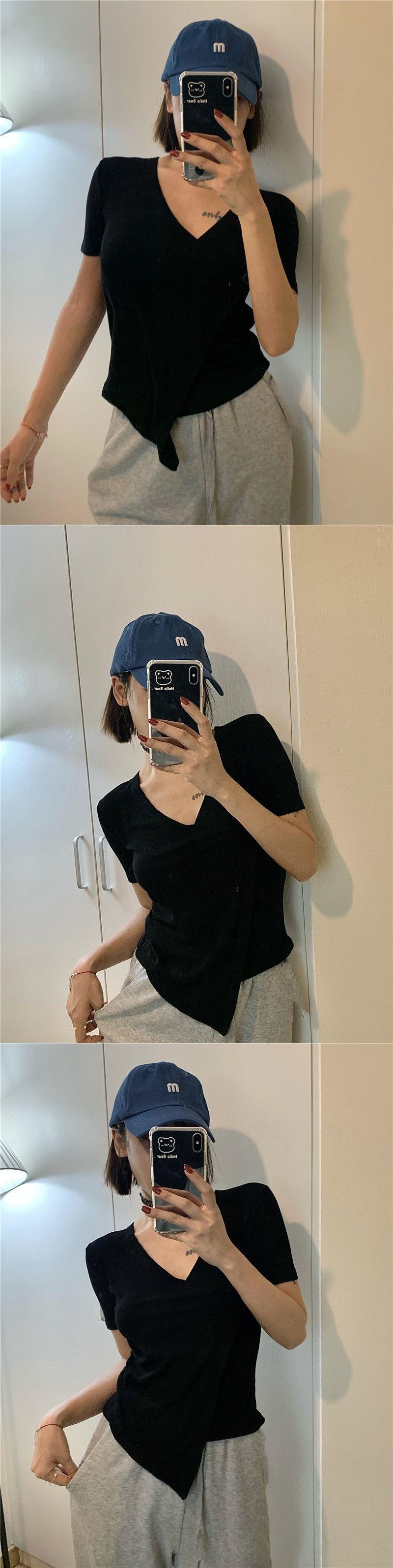 Camiseta de manga corta irregular súper genial para mujer, de seda de hielo, de verano, con diseño transfronterizo, estilo chic de nicho, con cuello en V, adelgazante.