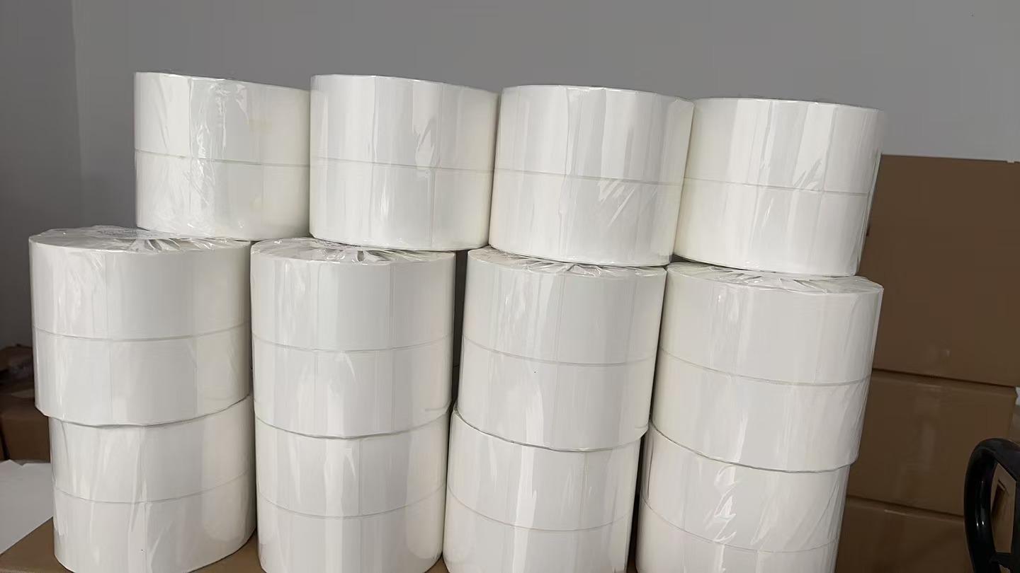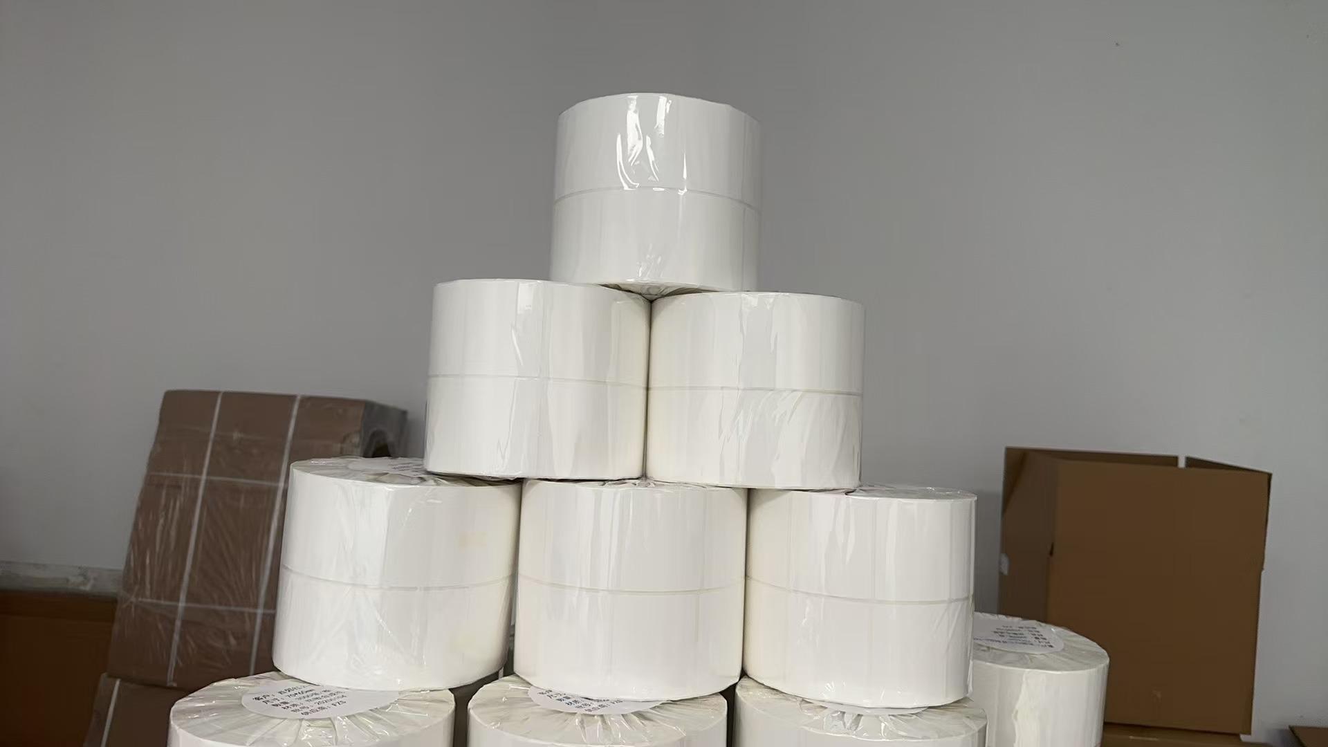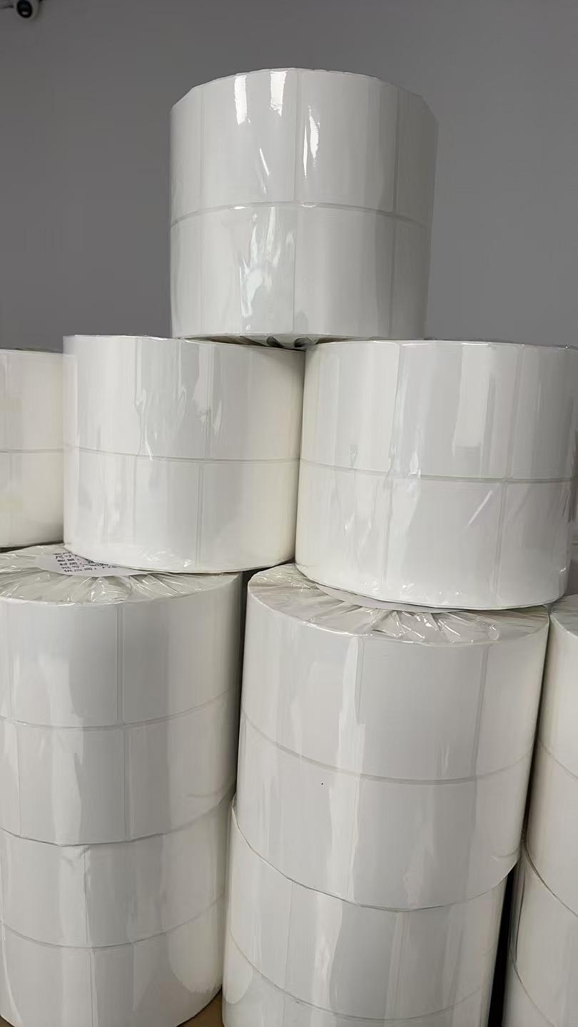Etiqueta adhesiva de papel sintético térmico en blanco, resistente al agua, resistente al desgarro y a las roturas.