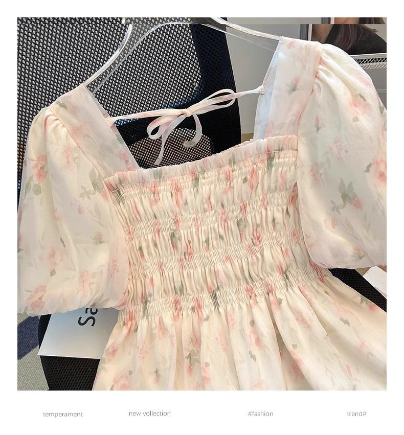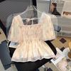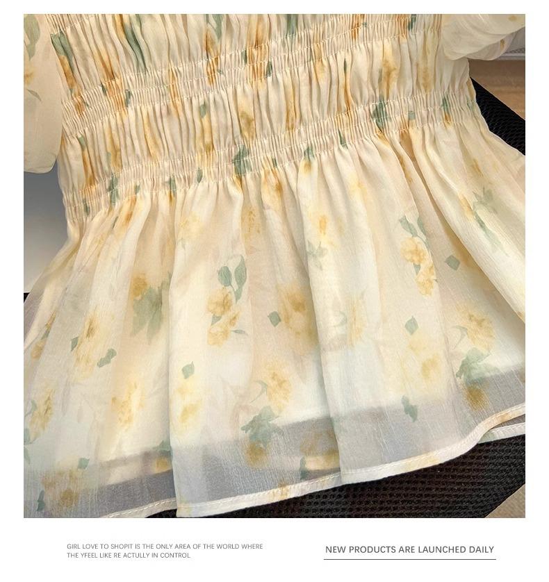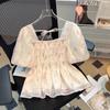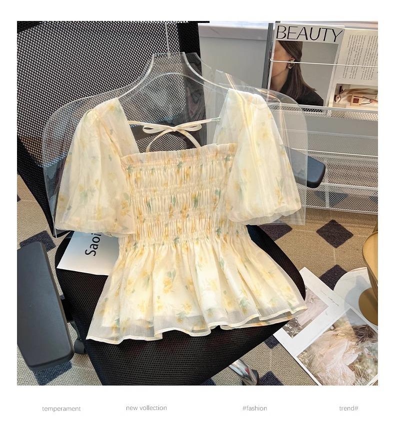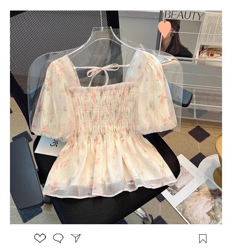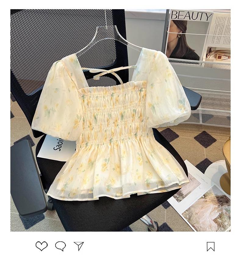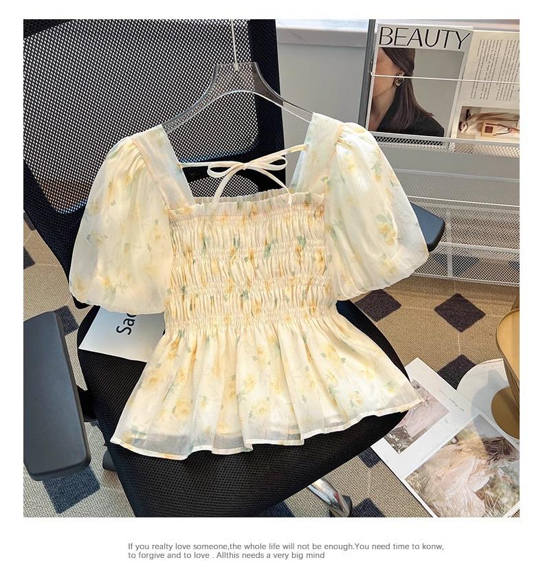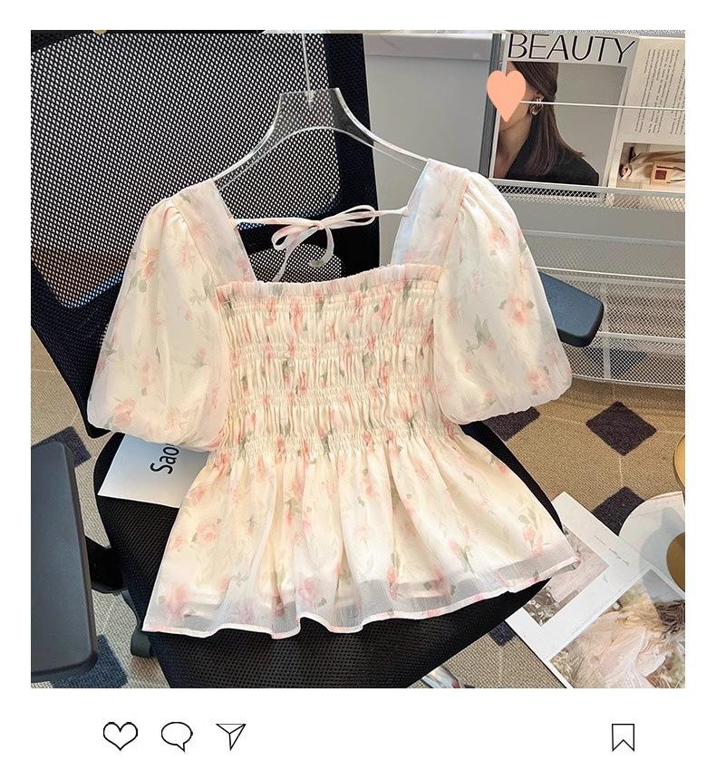 [Original] Camisa francesa con mangas abullonadas y estampado floral para mujer, elegante y bonita blusa de verano con cuello cuadrado.