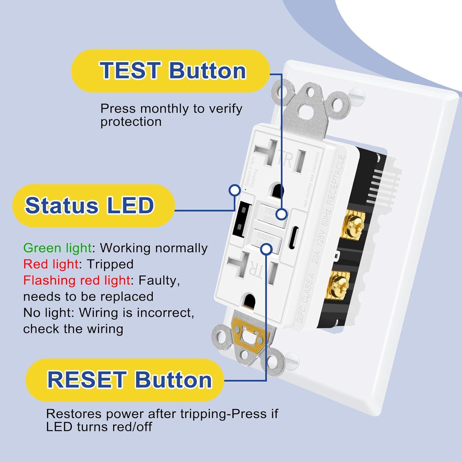 Enchufe americano estándar 110V 20A doble USB con protección contra fugas GFCI, enchufe USB Tipo C 5V 4.8A