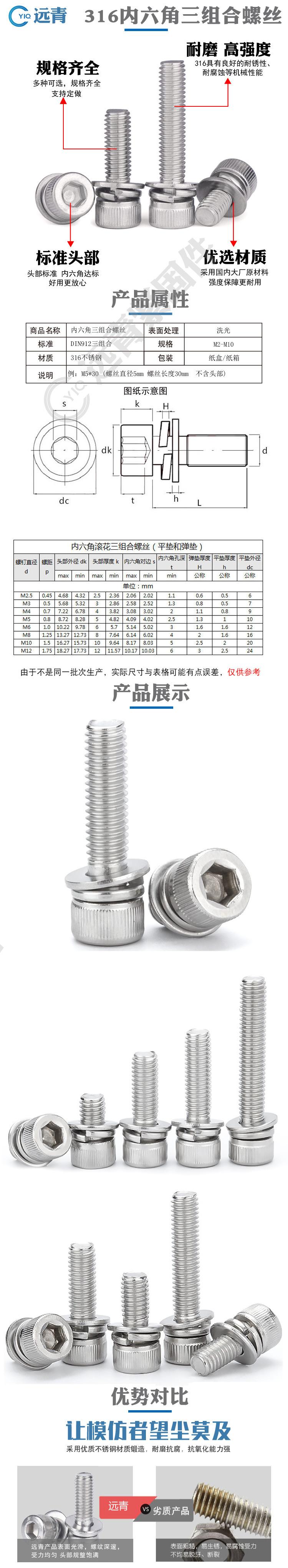 Tornillo de cabeza hueca hexagonal de acero inoxidable 316, combinación de cabeza cilíndrica, tres arandelas planas, tornillo de máquina M4M5M6M8M10