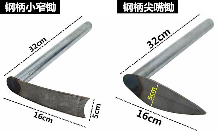 Iron handle/small grip trapezoidal hoe, -iron handle/large grip trapezoidal hoe, Small wooden handle trapezoid...
