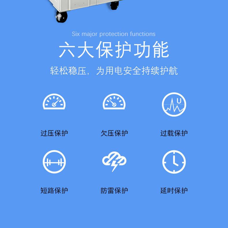 (Serie trifásica) Características: Regulación de voltaje lógico inteligente, pantalla de luz LED del panel, función de autodetección, el voltímetro del panel interno puede monitorear el voltaje trifásico, fuerte capacidad de sobrecarga del 150%, configuración conveniente de la función del interruptor DIP, dispositivo de derivación patentado, diseño de panel de circuito dual electrónico, dispositivo de protección de alto y bajo voltaje de amplio rango, diseño de regulación de voltaje separado para mantener la salida trifásica siempre equilibrada.