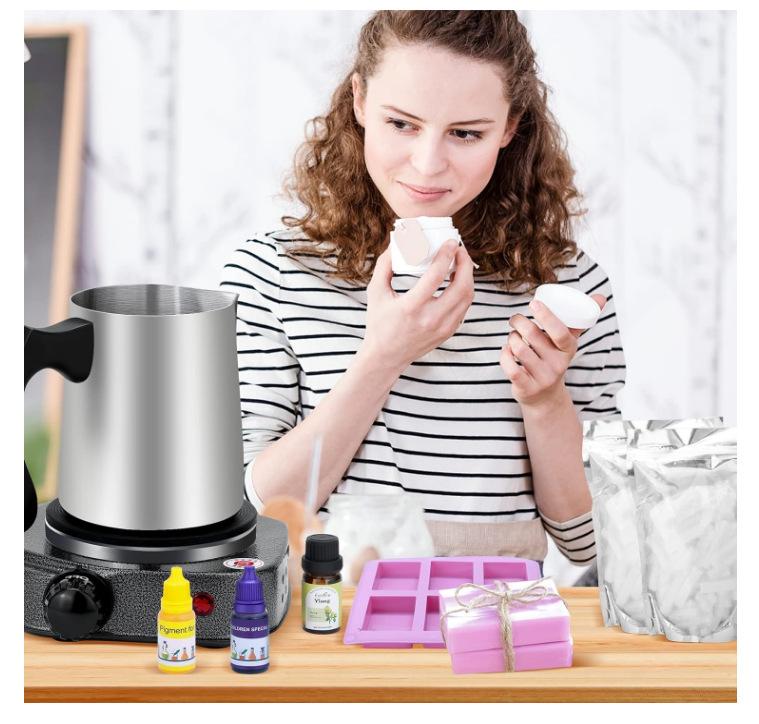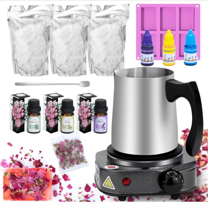 Regulación británica Horno de calentamiento cuadrado gris1individuo,1000taza con asa curva ml1individuo,250Gramos de base de jabón blanco3Aceites esenciales en bolsas y cajas3Cuchara cuadrada de plata1Pigmentos líquidos de grado alimenticio3Botella, silicona rosa6Molde cuadrado de rejilla1individuo,5Bola de rosas flores secas1Bolsa
