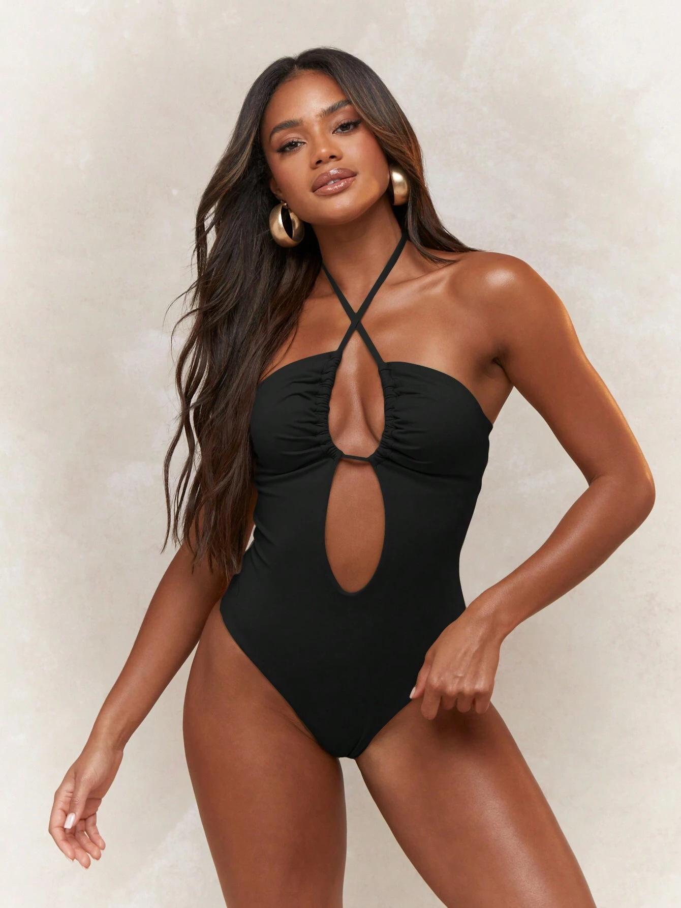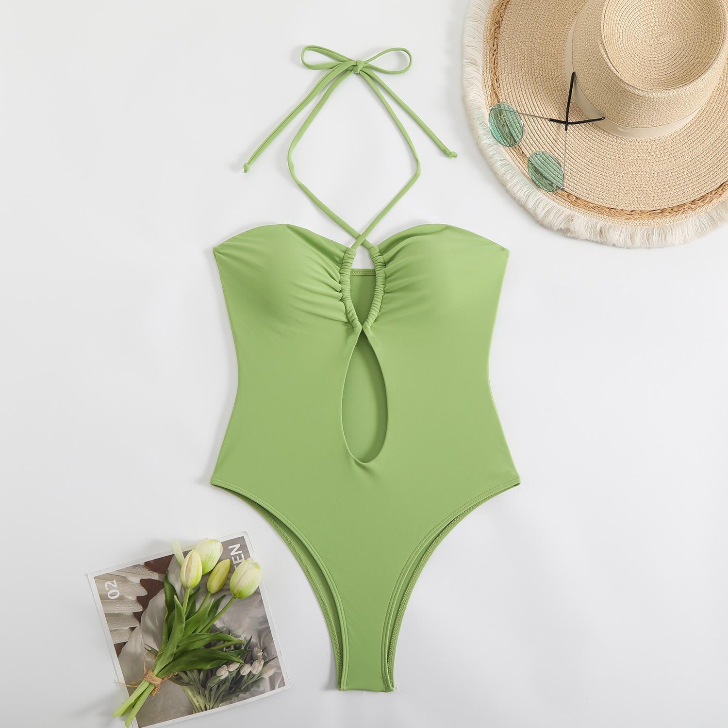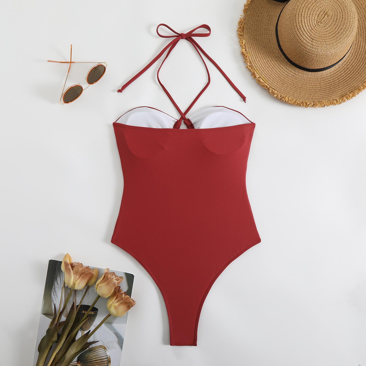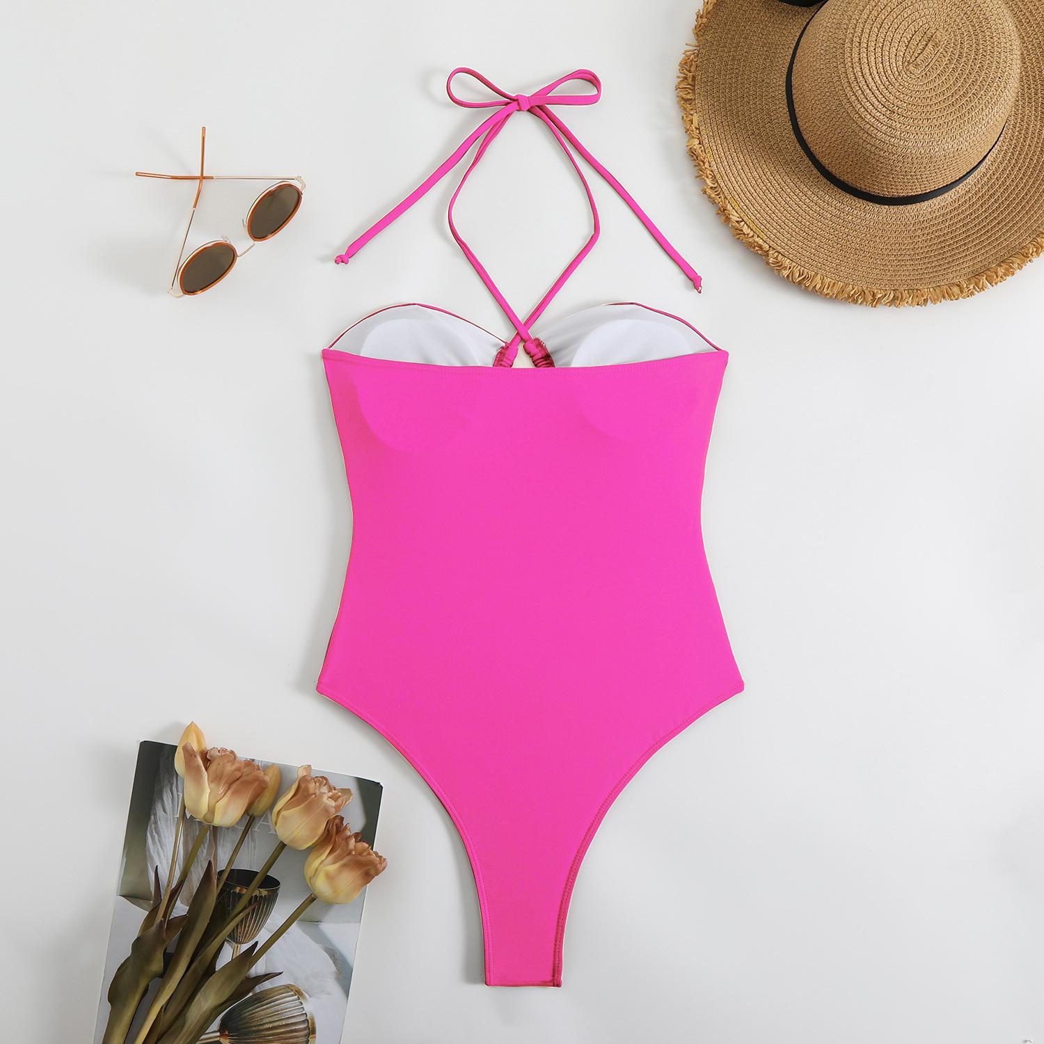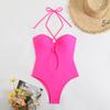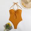 Traje de baño sexy de una pieza para mujer, 2025 Europa y Estados Unidos, comercio exterior transfronterizo, nuevo color sólido fruncido, cuello con cordones hueco, espalda descubierta