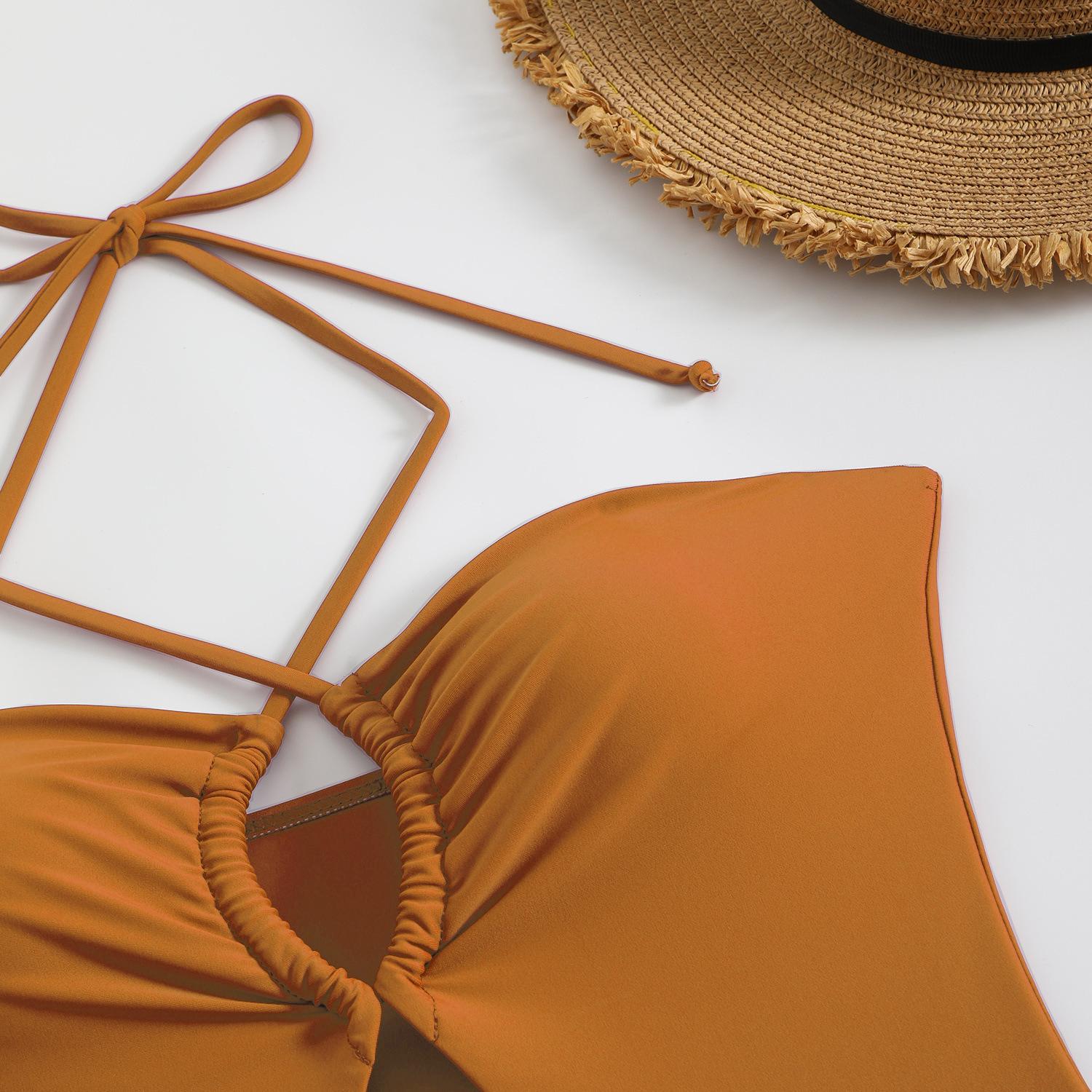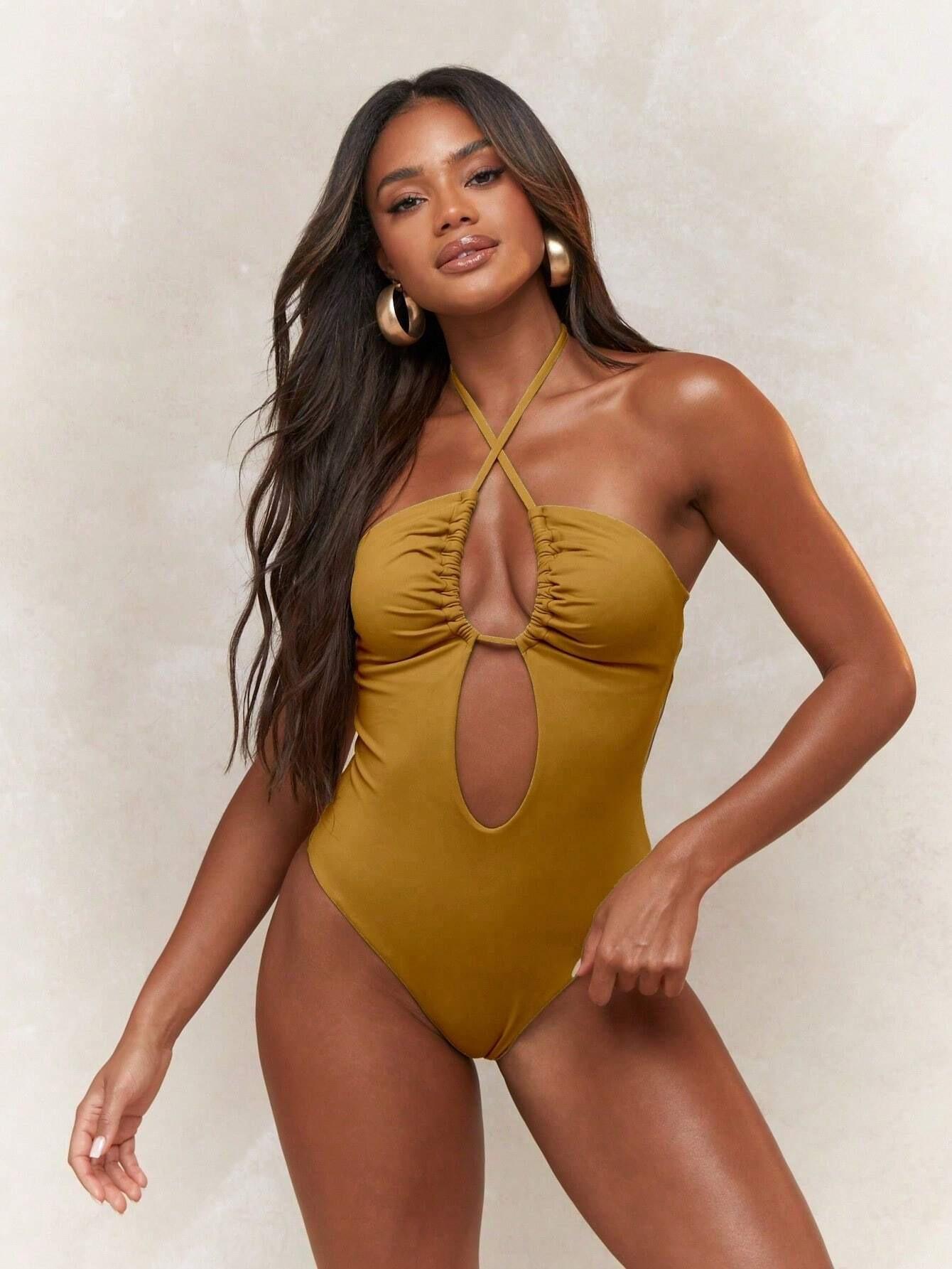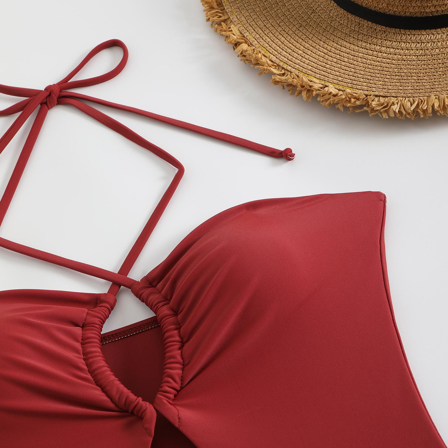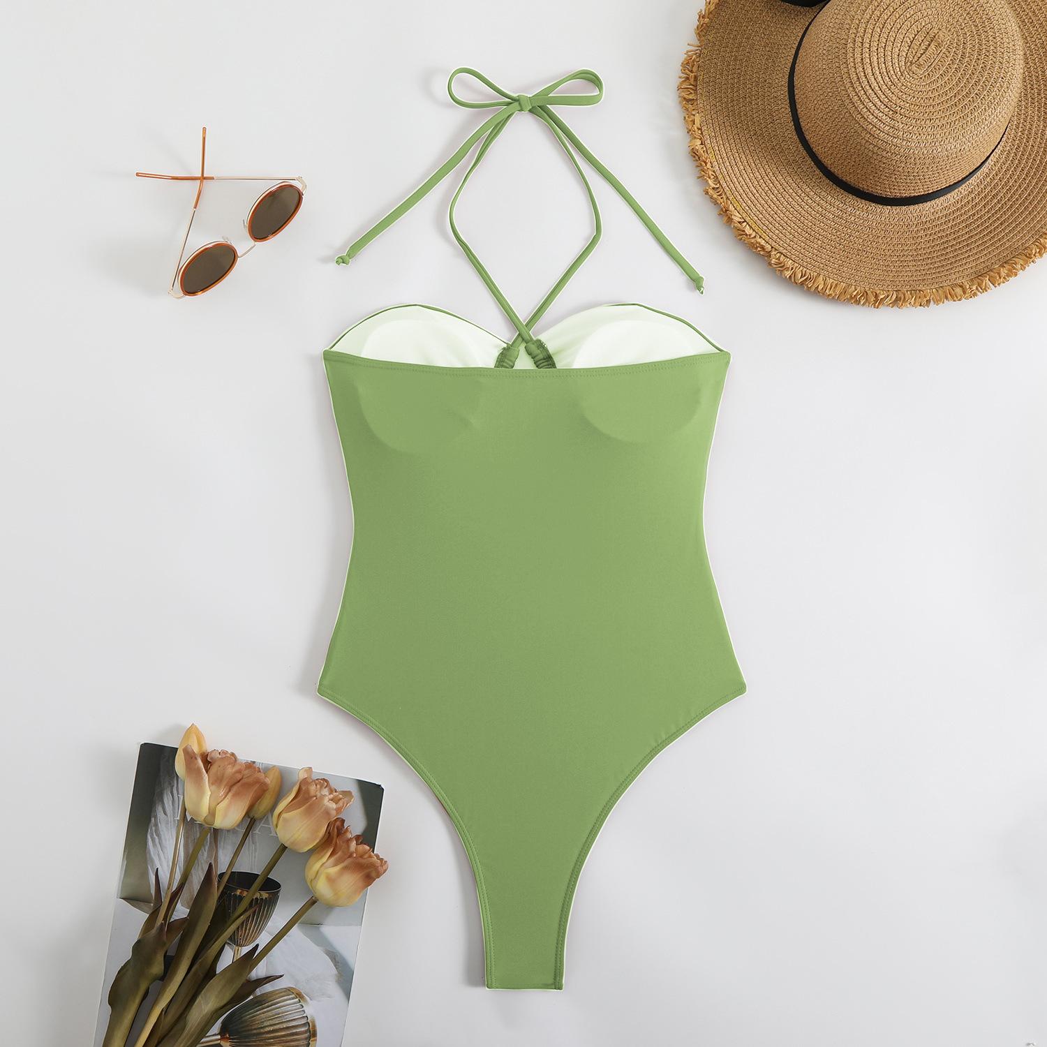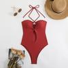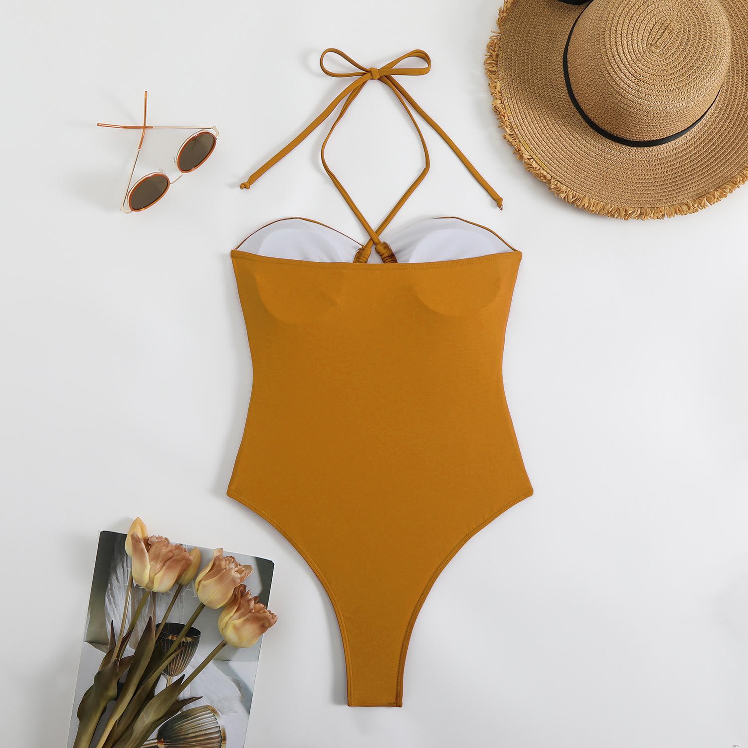 Traje de baño sexy de una pieza para mujer, 2025 Europa y Estados Unidos, comercio exterior transfronterizo, nuevo color sólido fruncido, cuello con cordones hueco, espalda descubierta